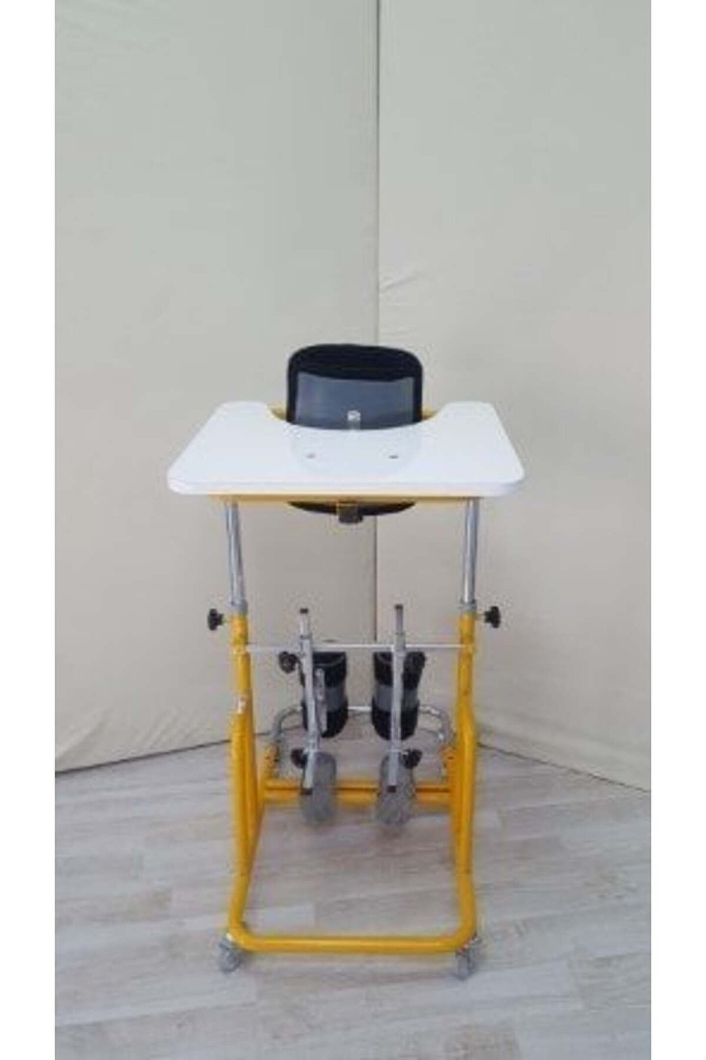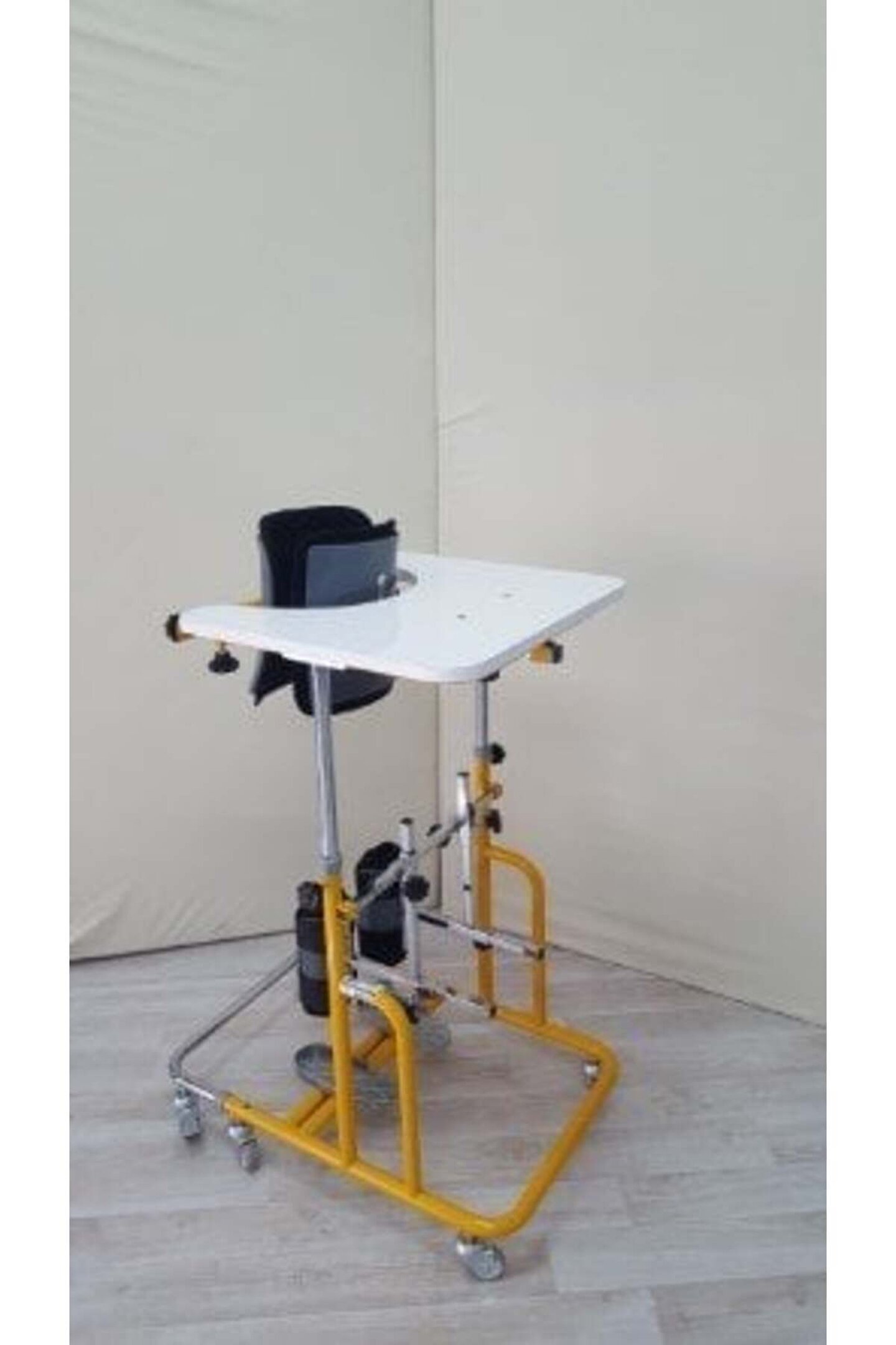 Ayakta durma sandalyesi dik konumlandırma cihazı Ayakta dik durma sehpası vucud dengesine yardımcı ile dik pozisyonunda durabilmesi için 02, yaş çocuk ve yetişkin modelleri ile vucüd dengesine yardımcı olan cihazdır. Cp ayakta durma sehpası kullanımı kullanıcı hastanın cihazın içine girip ayaklarının üstüne basıp. Ayak emniyeti alınır. Diz destek ayarı yapılır. Bel destek bantı bağlanarak kalça dik bağlantı ayarı yapılır. Koltuk altı destek aparatı ile göğüs destek ayarı yapılır. Çalışma masası ayarı kol mesafesi ayarı yapılarak calışma masası ayarı yapılır. Kullanıcının ayaklarını sabitlemek için ayak bağlama mekanizması bacaklarını dik tutmak için diz kapağı destek mekanizması kalça bel dik ayarını sağlamak için kemer sıkma bandajı göğüs omuz dik durma pozisypnu için koltuk altı destek mekanizması ayar mekanizmalarından ayarlanır. Cp ayakta dik durma sehpası çeşitleri kullanıcı hastalar için 3 çeşittir O2 yaş 11 yaş arası kullanıcıları için 11 yaş 16 yaş arası kullanıcılar için 16 yaş 45 yaş arası kullanıcılar için Cp ayakta dik durma sehpası garantisi 2 yıldır kaliteli iskelet yapısı çelik ve ahşap malzemeden üretilmiştir, deforma olmaz Cp ayakta dik durma sehpasının bakım gerektiren her hangi bir mekanizması yoktur. Firmamız tarafından yerli üretim olan cihazın yedek parça sorunu yoktur. Vucud direnci eklem mekanizmalarının gelişimi için fizik tedavi doktorlarının hastasına belli bir program dahilinde tavsiye edilerek alınıp kullanılan cihazdır. Hasta ve hasta sahipleri bu cihazı doktor tavsiyesi ile alınıp kullanılan üründür. Yetişkin ve Çocuk Boyları Vardır.