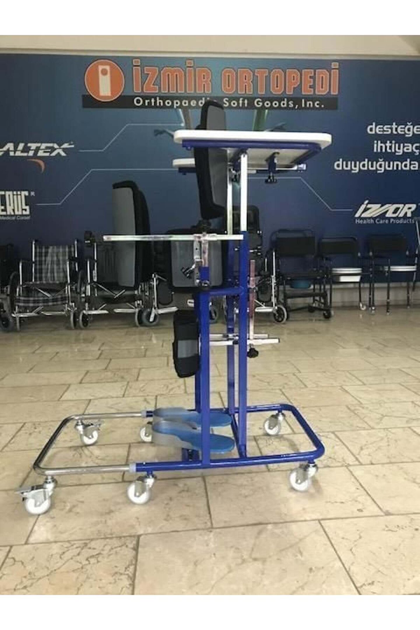 Ayakta durma sandalyesi dik konumlandırma cihazı Ayakta dik durma sehpası vucud dengesine yardımcı ile dik pozisyonunda durabilmesi için 02, yaş çocuk ve yetişkin modelleri ile vucüd dengesine yardımcı olan cihazdır. Cp ayakta durma sehpası kullanımı kullanıcı hastanın cihazın içine girip ayaklarının üstüne basıp. Ayak emniyeti alınır. Diz destek ayarı yapılır. Bel destek bantı bağlanarak kalça dik bağlantı ayarı yapılır. Koltuk altı destek aparatı ile göğüs destek ayarı yapılır. Çalışma masası ayarı kol mesafesi ayarı yapılarak calışma masası ayarı yapılır. Kullanıcının ayaklarını sabitlemek için ayak bağlama mekanizması bacaklarını dik tutmak için diz kapağı destek mekanizması kalça bel dik ayarını sağlamak için kemer sıkma bandajı göğüs omuz dik durma pozisypnu için koltuk altı destek mekanizması ayar mekanizmalarından ayarlanır. Cp ayakta dik durma sehpası çeşitleri kullanıcı hastalar için 3 çeşittir O2 yaş 11 yaş arası kullanıcıları için 11 yaş 16 yaş arası kullanıcılar için 16 yaş 45 yaş arası kullanıcılar için Cp ayakta dik durma sehpası garantisi 2 yıldır kaliteli iskelet yapısı çelik ve ahşap malzemeden üretilmiştir, deforma olmaz Cp ayakta dik durma sehpasının bakım gerektiren her hangi bir mekanizması yoktur. Firmamız tarafından yerli üretim olan cihazın yedek parça sorunu yoktur. Vucud direnci eklem mekanizmalarının gelişimi için fizik tedavi doktorlarının hastasına belli bir program dahilinde tavsiye edilerek alınıp kullanılan cihazdır. Hasta ve hasta sahipleri bu cihazı doktor tavsiyesi ile alınıp kullanılan üründür. Yetişkin ve Çocuk Boyları Vardır.