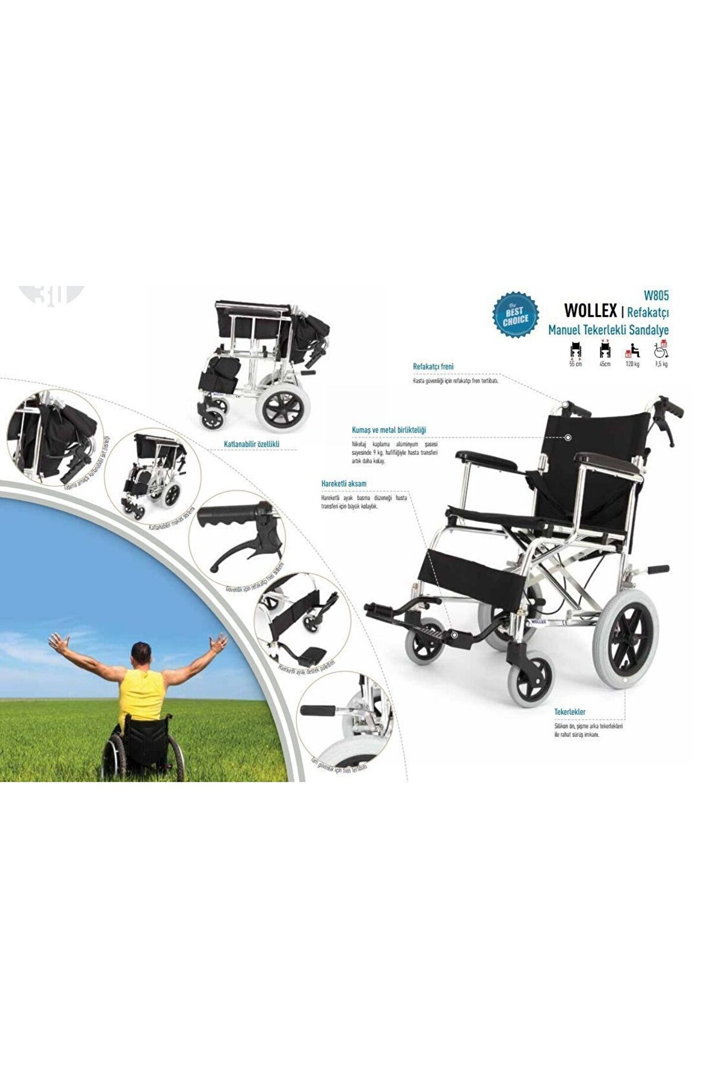 Medikaltec Hafif Refakatçı Tekerlekli Sandalye Refakatçı Tekerlekli Sandalye Hafif Refakatçı Tekerlekli Sandalye Katlanabilir özellikli Refakatçı freni Hasta güvenliği için refakatçı fren tertibatı. ; Kumaş ve metal birlikteliği Nikelaj kaplama alüminyum şasesi sayesinde 9 kg. ; ha iğiyle hasta transferi artık daha kolay. ; Hareketli aksam Hareketli ayak basma düzeneği hasta transferi için büyük kolaylık. ; Tekerlekler Silikon ön, şişme arka tekerlekleri ile rahat sürüş imkanı.;