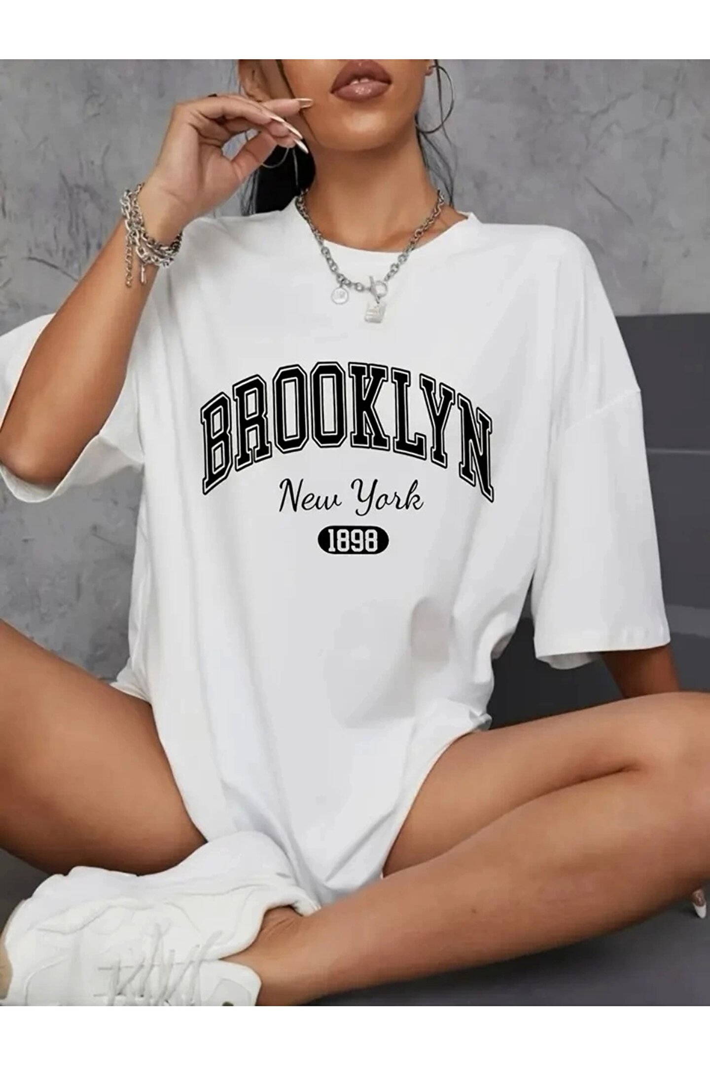 Brooklyn Harf Baskılı Düşük Omuzlu T-shirt, Rahat Kısa Kollu Bol T-shirt, Kadın Giyim - Beyaz