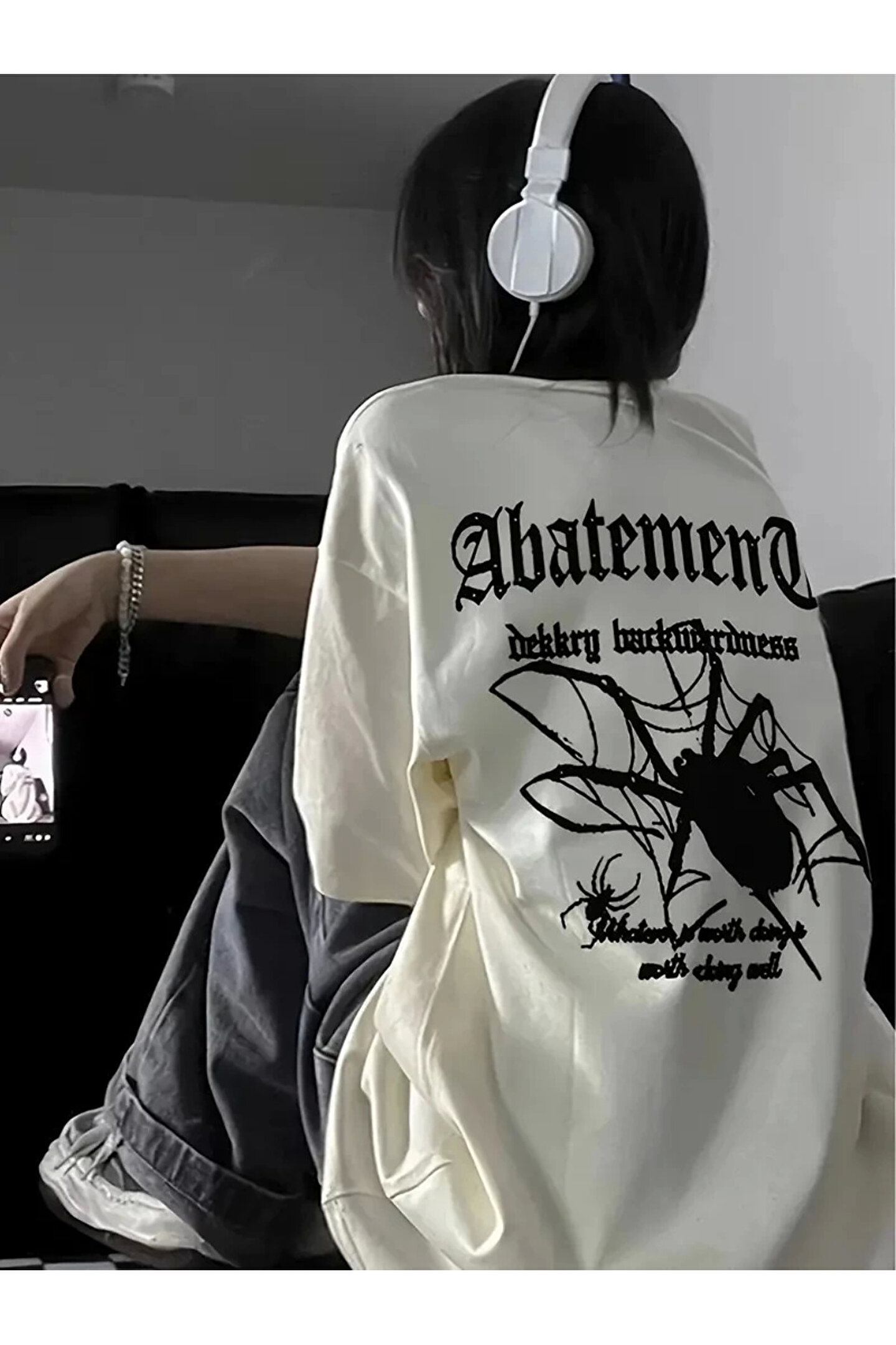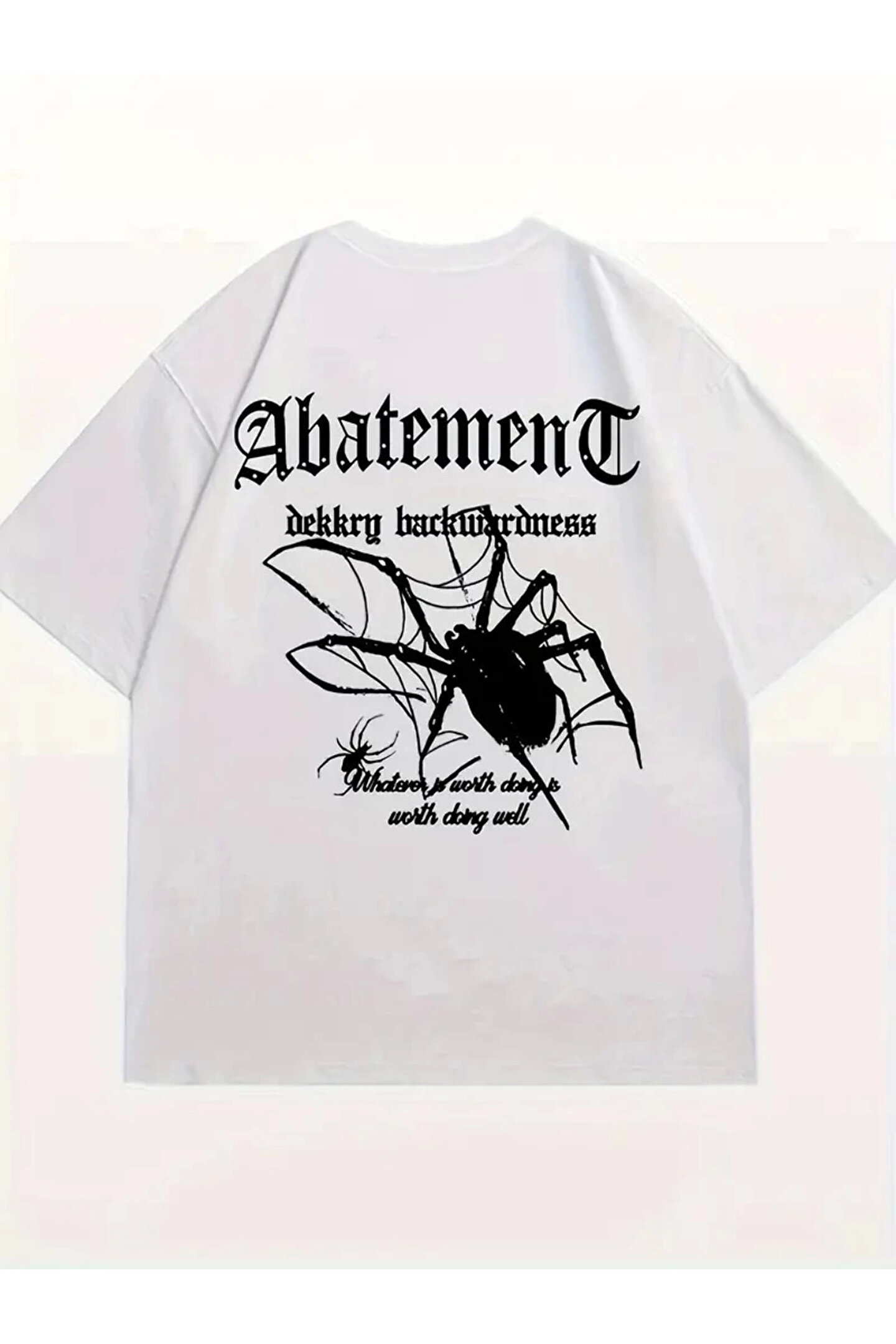 Megstill Örümcek Ağı Desenli Baskılı Oversize Bisiklet Yaka T-shirt - Beyaz