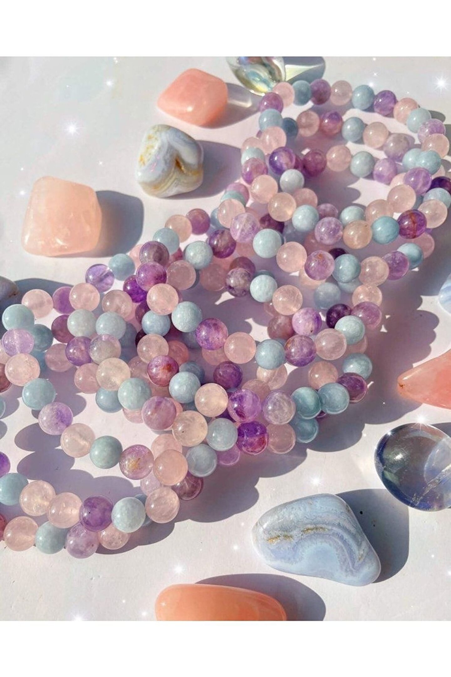 Kullanılan taşların tamamın Orjinal ve doğaldır taşlar lastikli misinaya dizilerek yapılır ve her biri 8 mm dir. ; Pembe kuvars ametist ve akumarin taşları kullanılmıştır taşların titreşimi birleştirilerek kişinin dişil özelliklerinin ön plana çıkması için tasarlanmıştır taşların genel özellikleriniz sıralamak olursak Pembe kuvars, kalp çakrasının taşıdır ve taşıyan kişiyi duygusal anlamda şifalandırır. ; Bulundurulduğu ortama sevgi, aşk, mutluluk ve huzur getirir. ; Olumsuz düşünceleri temizler, koşulsuz aşka yer açarak güçlenmesini sağlar. ; Romantik bağı teşvik eder. ; Ametist Taşının Özellikleri Ametist taşı, kişiyi maddi ve manevi bağımlılıklardan arındırır. ; Korkuya karşı etkili bir taştır. ; İletişim ve bilgelikle ilişkilendirilir. ; ... ; Stres ve negatif enerjiye karşı rahatlatıcı bir aura oluşturur. ; Ametist taşı bulunduğu ortamdaki negatif enerjiyi çekerek pozitif enerjiye dönüştürür. ; Akuamarin Taşı Faydaları Fiziksel gücü ve canlılığı arttırır. ; Elektromanyetik kirliliği etkisizleştirir. ; Strese karşı etkilidir, azaltır. ; ... ; Psikolojik rahatsızlıklara iyi gelir. ; Özellikle kalp sağlığı için olumlu etkileri olan bir taştır. ; Duygusal bakımdan dengeleyicidir ve depresyona karşı etkilidir.;
