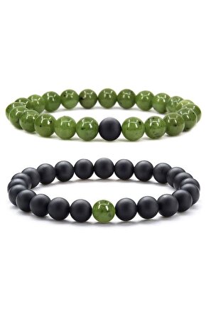 Doğal taş kullanımı sayesinde her bileklik benzersiz ve otantik bir görünüm sunar; Yeşim taşı ve oniks taşı kombinasyonu, zarif ve şık bir tasarıma sahiptir; Bu bileklik, sevgili çiftler için özel olarak tasarlanmış olup, romantik anları simgeler; Doğal taş materyali ile hem dayanıklılık hem de estetik bir dokunuş sağlar;