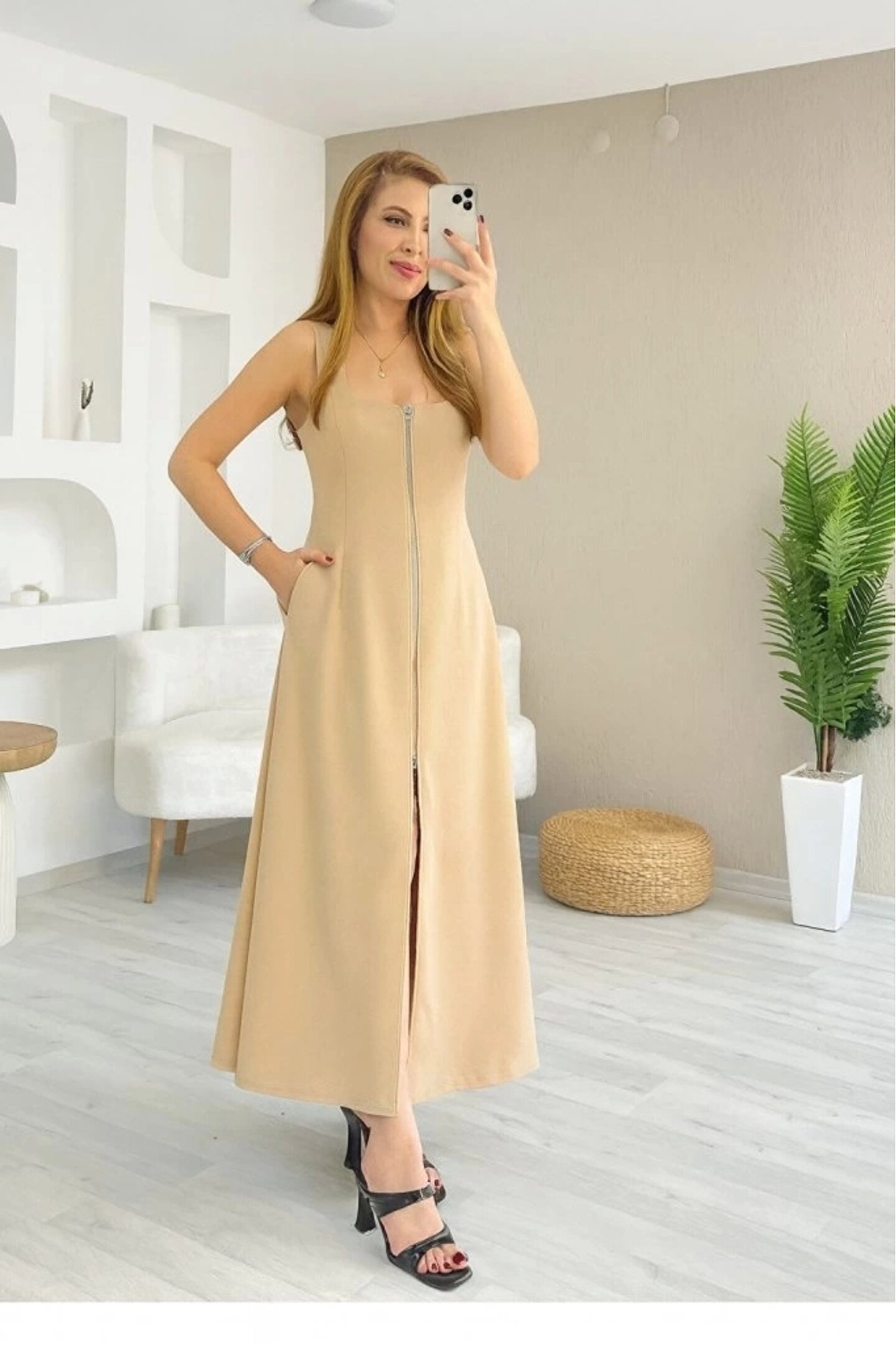 Melenza Kadın Askılı Kare Yaka önden Fermuarlı Geniş Kesim Janjan Krep Elbise