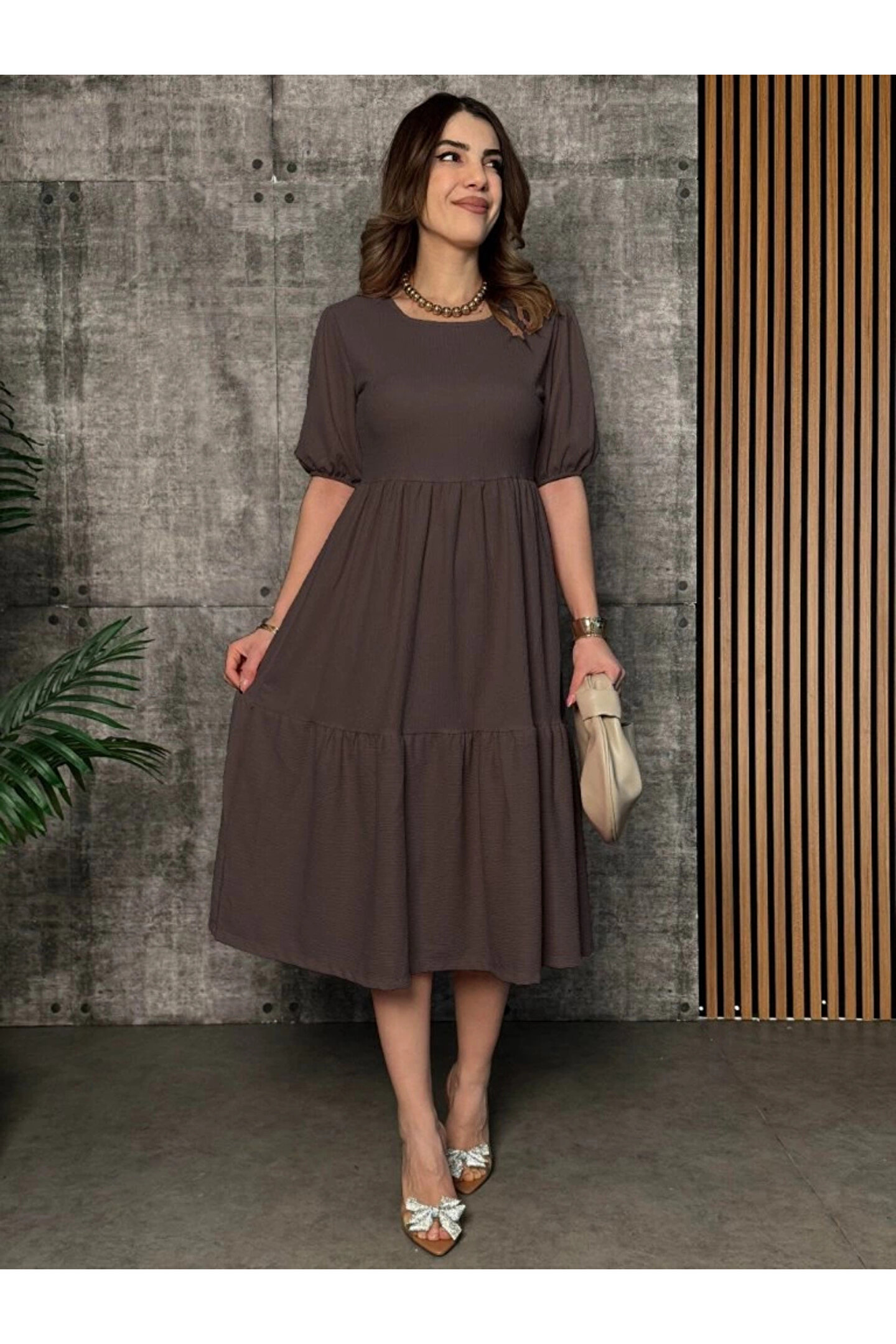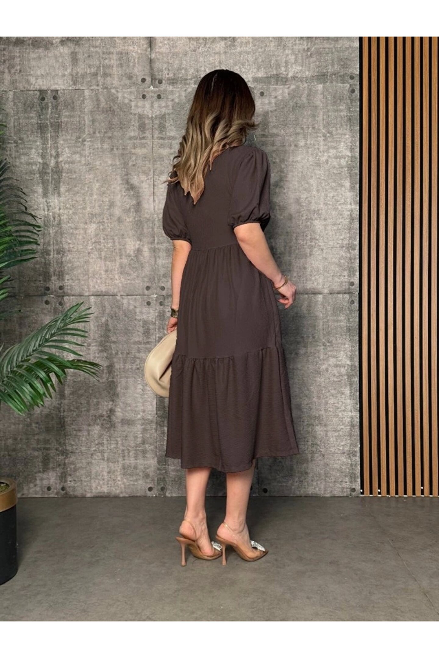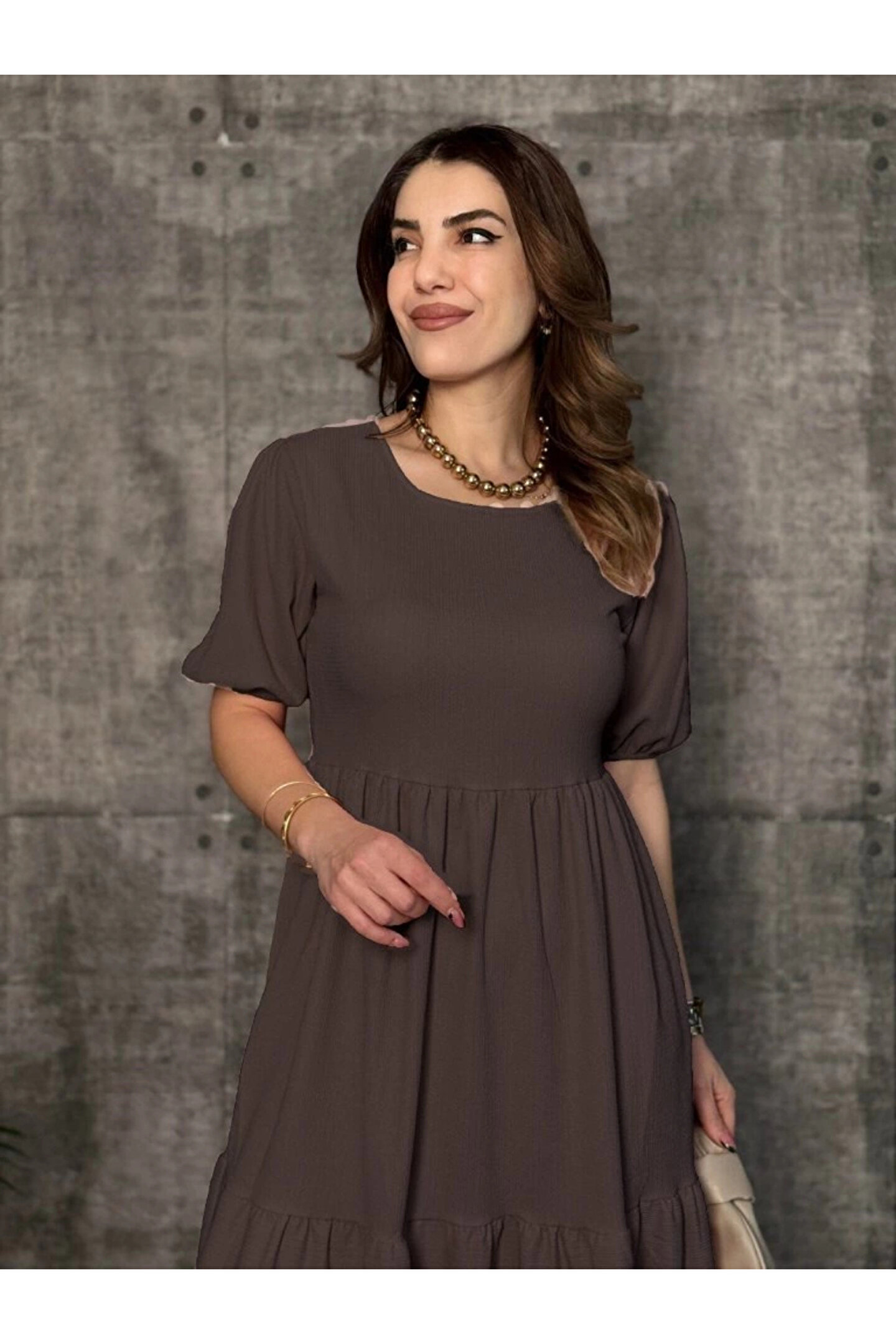 Melenza Kadın Kısa Kollu Yakası Açık Katlı Bürümcük Balon Elbise