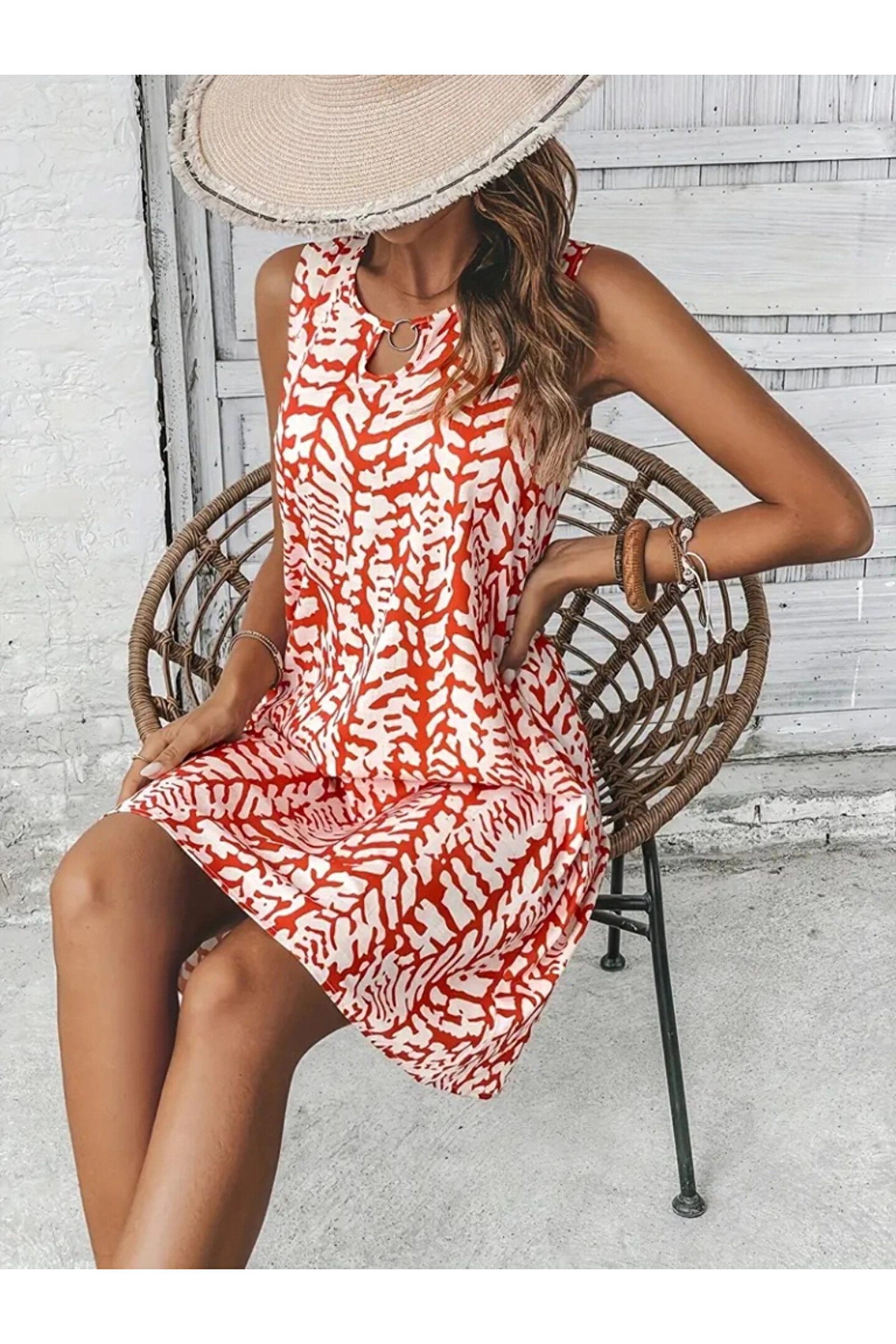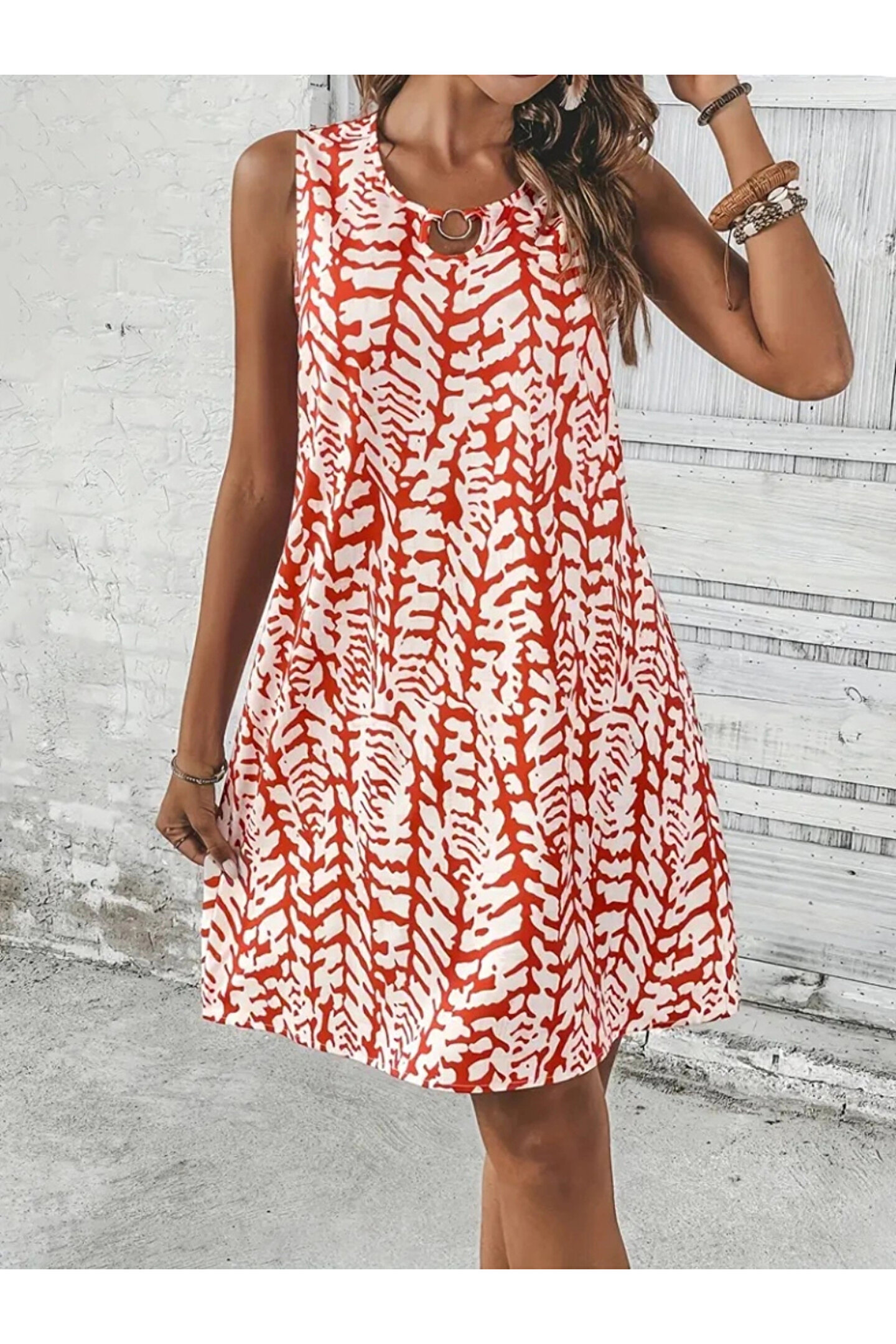 Kadın Sıfır Kol Yakadan Halka Detaylı Desenli Kısa Bürümcük Elbise