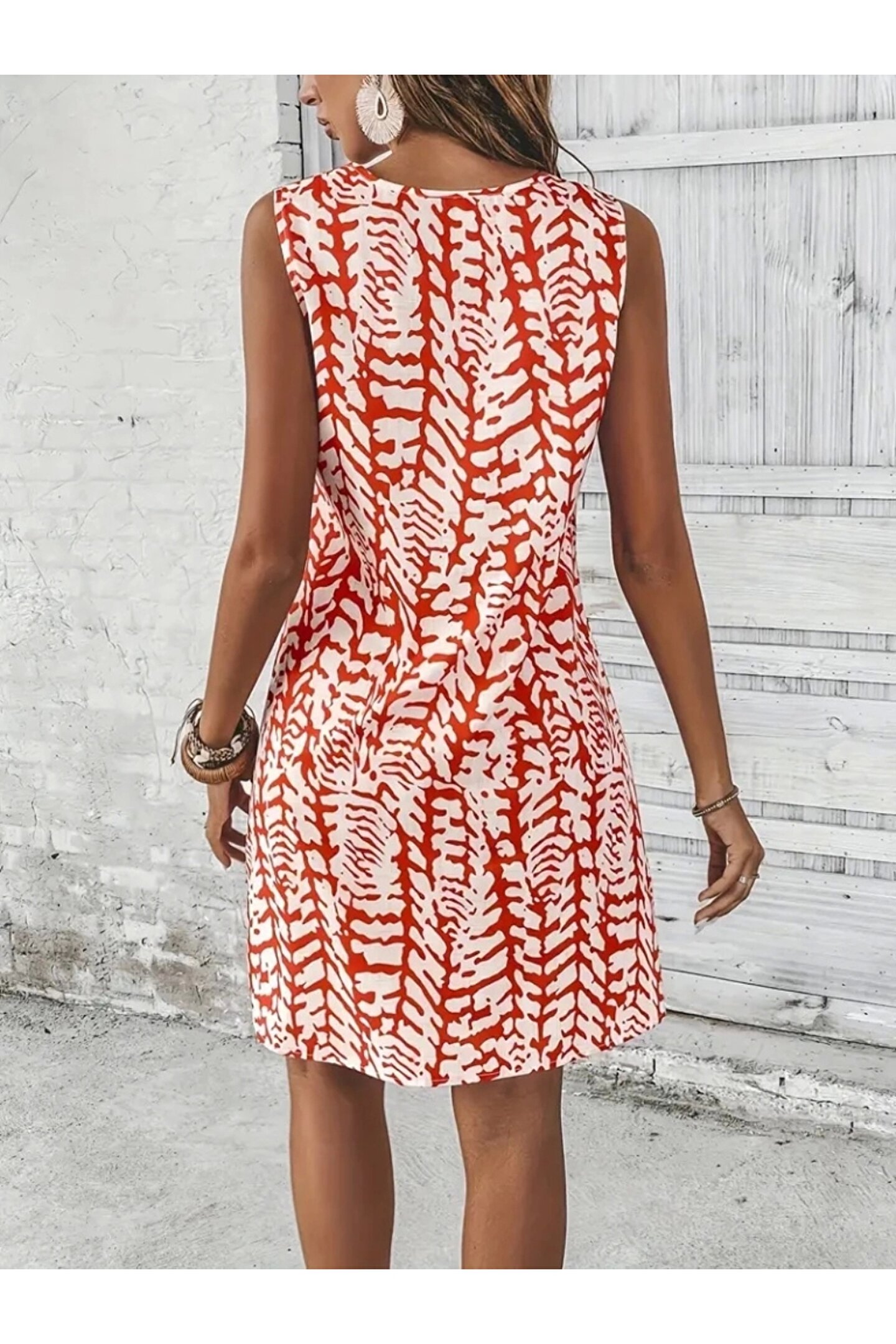 Kadın Sıfır Kol Yakadan Halka Detaylı Desenli Kısa Bürümcük Elbise