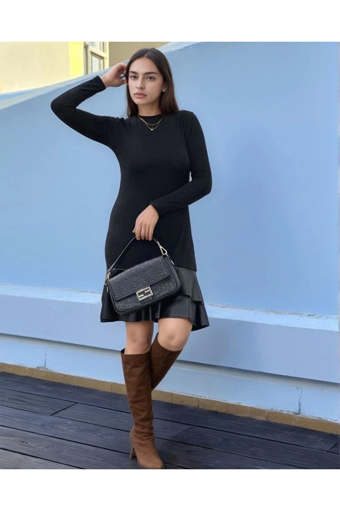 Kadın Uzun Kollu Bisiklet Yaka üst Viskon Etek Ucu Deri Kısa Elbise