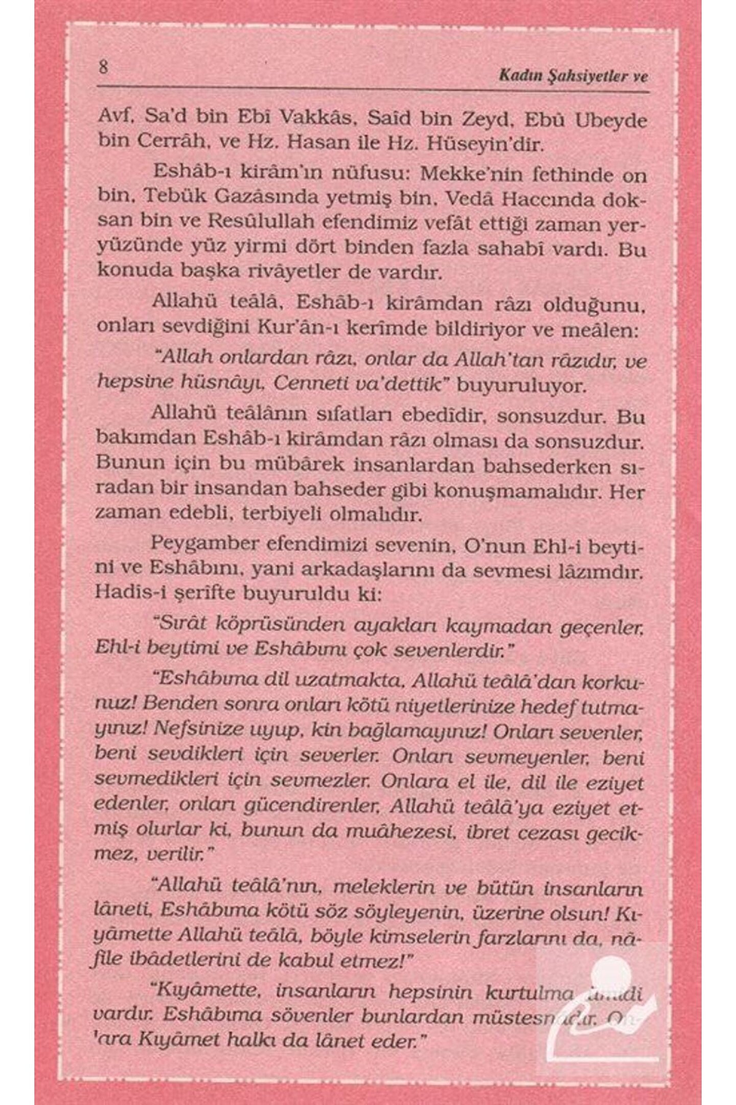 Kadın Şahsiyetler ve Hanım Sahabiler Harun Yıldırım / Mercan Kitap Basım Yılı: 2016; Baskı: 4; Sayfa Sayısı: 360; Kağıt Türü: Kitap Kağıdı; Ebat: 13,5 x 21; Dil: Türkçe; Cilt Durumu: Karton Kapak; ISBN: 6054908202; Yazar: Harun Yıldırım; Hadis-i Şerifte mealen şöyle buyuruldu: 'Ashabım hakkında Allah'tan korkun! Benden sonra onları kendinize hedef seçmeyin! Kim onları severse bana olan sevgisi sebebi ile sever; kim de onlara buğz ederse bana olan buğzu sebebiyle buğz eder.; Her kim onlara eza ederse bana eza etmiş olur.; Her kim bana eza ederse Allah'a eza etmiş olur.; Her kim de Allah'a eza ederse çok sürmez Allah onun belâsını verir' (Tirmizi menakip 58) Kur'ân-ı kerîm'de önceki peygamberler döneminde yaşamış değerli kadın şahsiyetlerden bahsedilmektedir.; Sünnette de Hz.; İbrahim'den günümüze kadar kadınların şahsi yönlerini yansıtan sahabe hanımlarından söz eden birçok hadisler gelmiştir.; Umarım anlatacağımız kadın şahsiyetler İslâmın geliştirdiği Müslüman kadının şahsiyetiyle ilgili öğretileri daha iyi açıklayacaktır.; Öyle ki; örnek kadın şahsiyetler sayıca fazla olgunluk açısından da çok üstündür.; Sizlere; hacmi küçük olmasının yanında hikmetlerle dolu kitap takdim ediyoruz.; Onun hikmetlerinden faydalanmaya hepimizin ihtiyacı vardır.