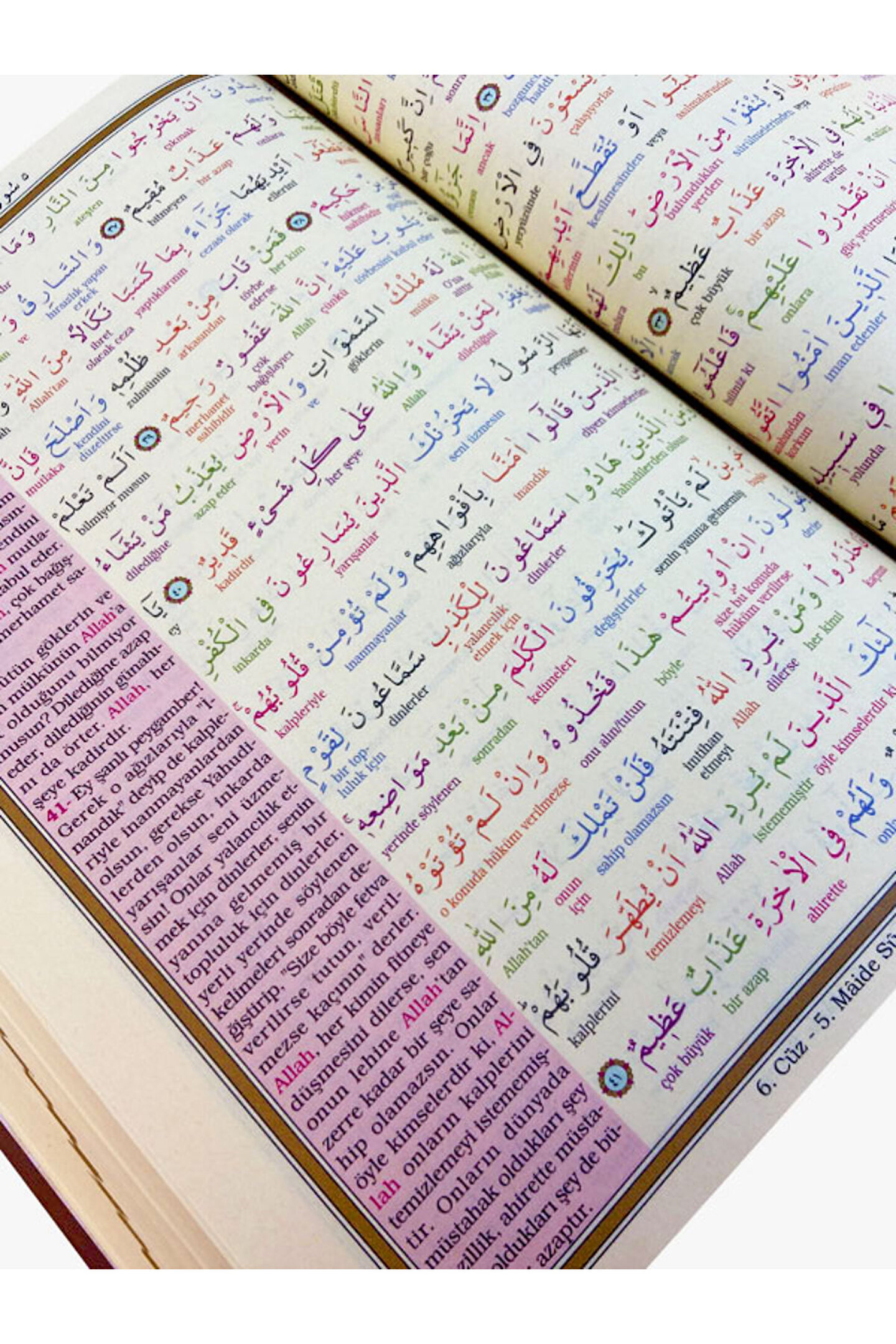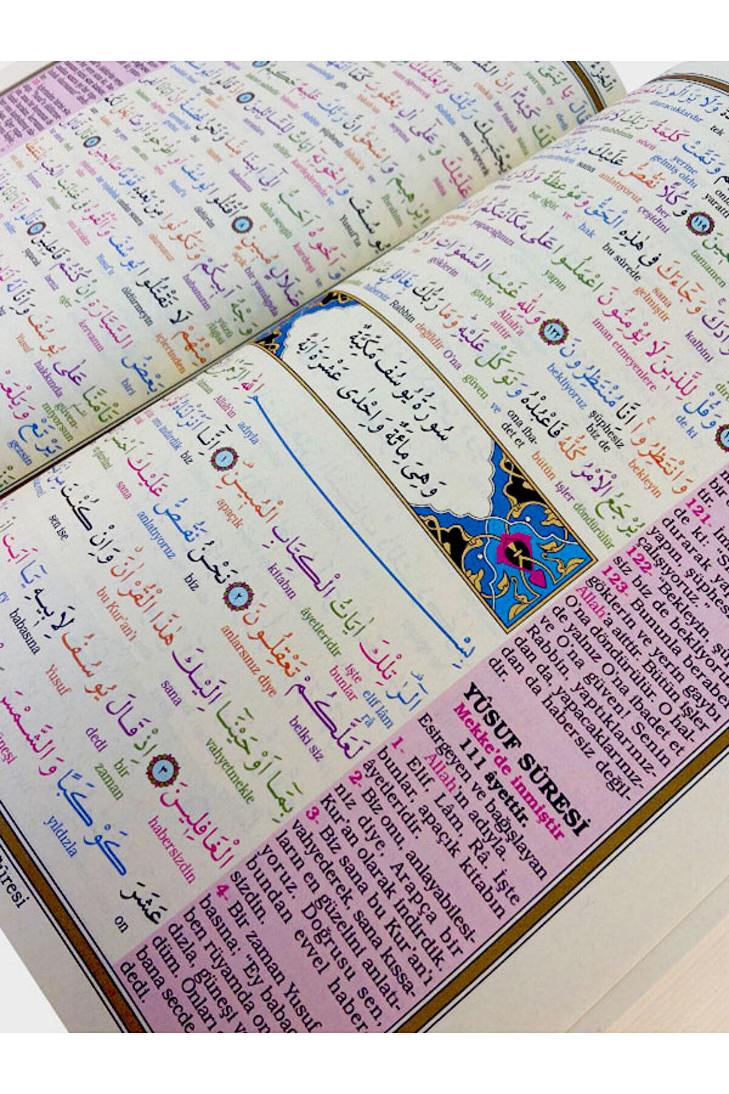 TÜRKİYE'NİN HER YERİNE ÜCRETSİZ KARGO Ağırlık: 2250gr. Boyutlar: 25 x 34cm Kağıt Bilgisi: 1.Kalite Şamua Kağıt Sayfa Bilgisi: 624 Sayfa, 4 Renk baskı Kapak Bilgisi: Lüks Bez Cilt Ürün Özellikleri ; Boyut: 25x34cm ; 1. Kalite Şamua Kağıt ; Ofset Baskı ; 4 Renk Baskı ; Diyanet Mühürlü ve Onaylıdır. ; Dünyanın en kolay okunan Bilgisayar Hattı ile hazırlandı, seçilen yazı hem estetik hem de harflerin temel karakterlerini koruyan ve kolay okunmalarını sağlayan özel bir hattır. Kelime kelime farklı renklerde ifade edilmiş arapça metin ve türkçe meali, ayrıca kelime kelime renklendirilmiş olup, aynı renkte altına meali yazmaktadır. Satır genişliği okuma kolaylığı sağlamak için arttırılmış, böylece harfler büyük satır ve harf aralıkları ferah tutulmuştur. Sayfa üstlerinde kullanılan kılavuzlarda surelerin ve cüzlerin isimleriyle beraber numaraları da verilerek okuyucunun aradığı sure ve cüz’ü numarasından da rahatlıkla bulabilmeleri amaçlanmıştır. Her bir sure başlığında, surenin adı, nazil olduğu yer ve ayet sayısı, rakam ve yazı ile belirtilerek sure hakkında bir ön bilgi verilmiştir. MERVE YAYINLARI