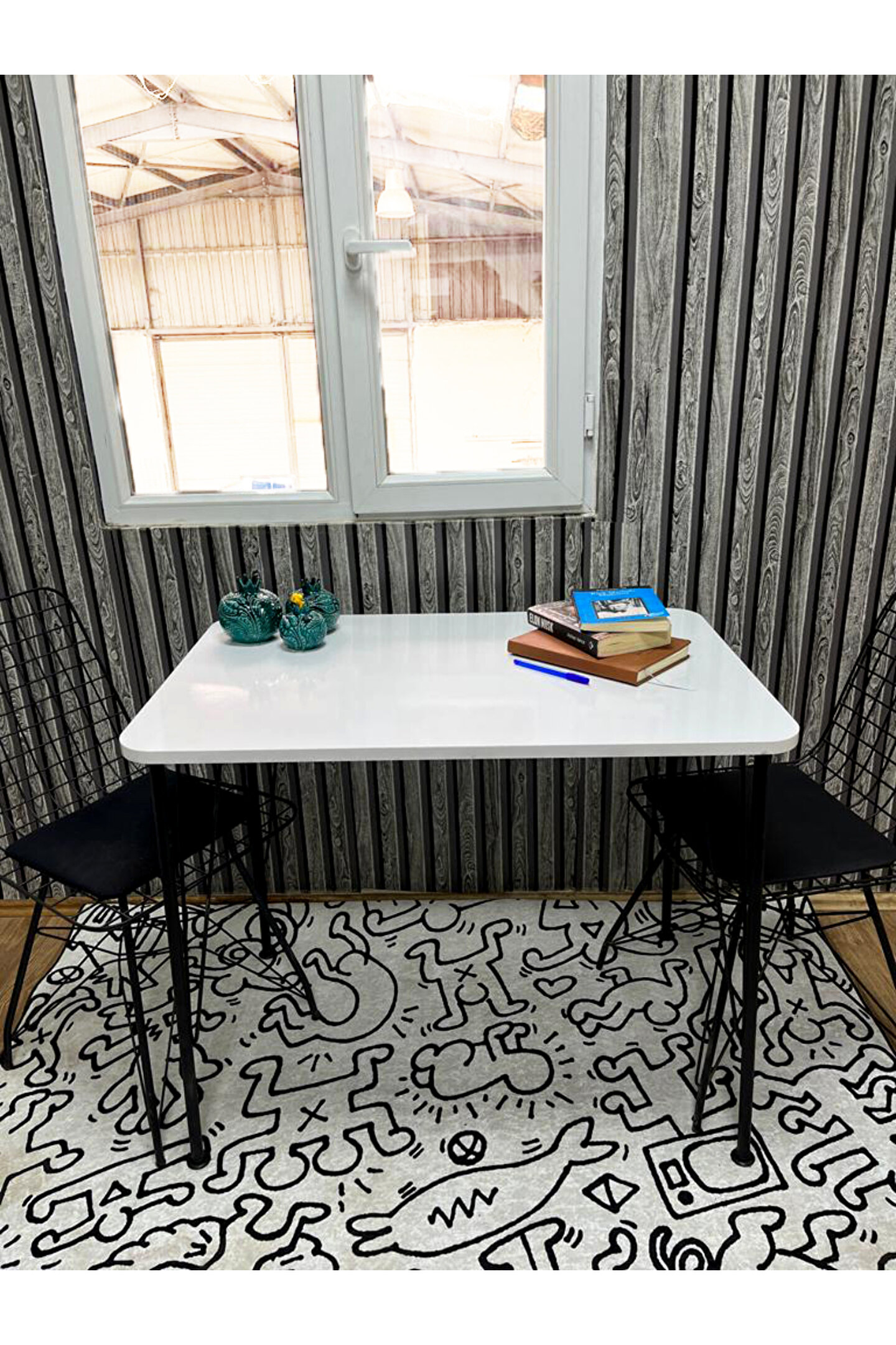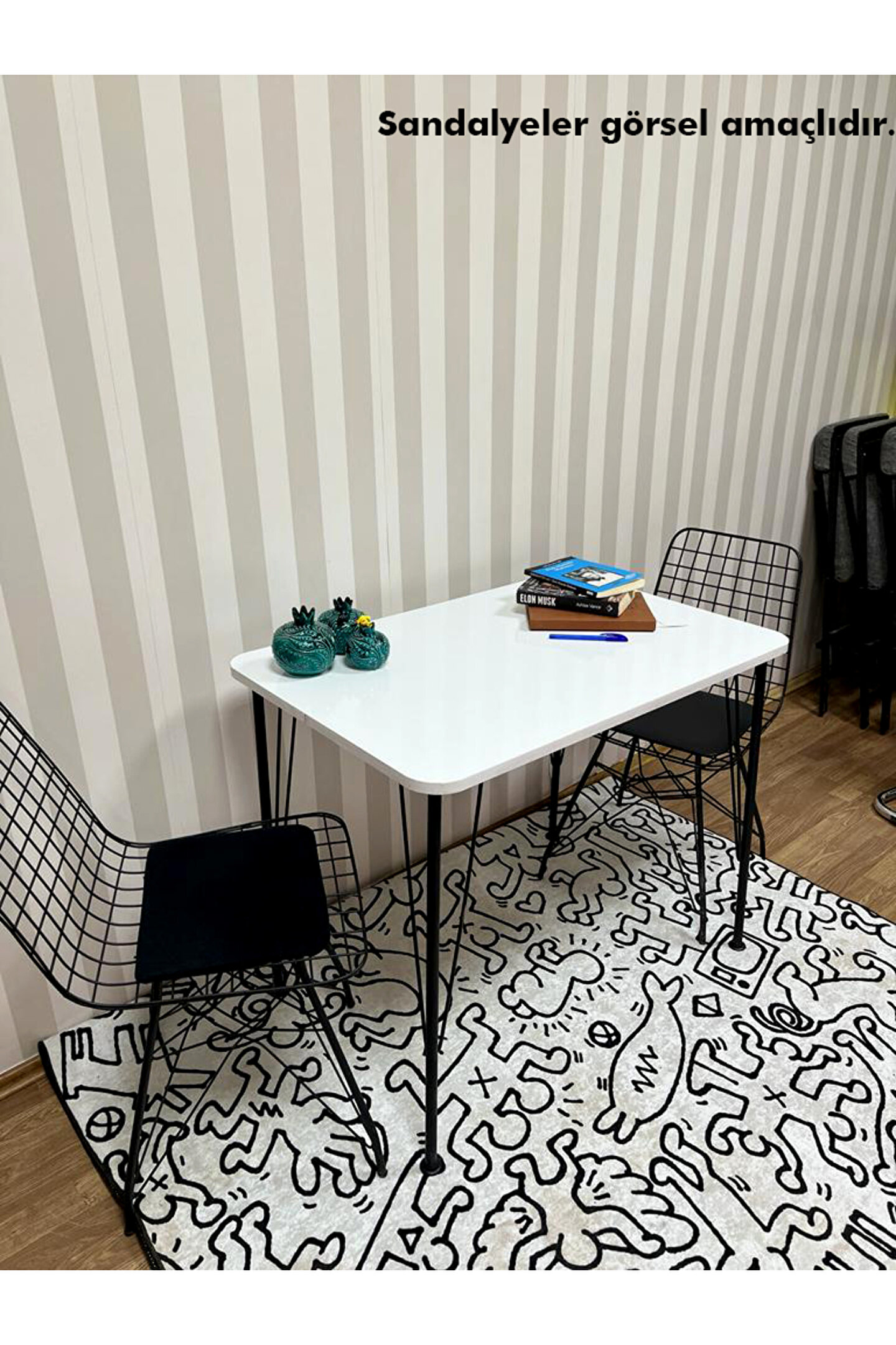 Masa ölçüleri genişlik 90 cm, derinlik 60 cm, toplam yükseklik 74 cm, masa tablası kalınlığı ise 18 mm dolacak şekilde ayarlanır.; Masa yüzeyi, parlak beyaz renk ve A1 kalite suntalam malzemeden oluşur. Zemini çizmeyen ayarlanabilir bingo ayaklar ile desteklenir.; Modelin ayakları siyah renge sahip olup çizilmeye karşı dayanıklı fırınlanmış statik mat boya ile kaplanır. ; Ayakların uç kısmında bulunan pabuçların yüksekliğinin ayarlanabilmesi sayesinde zeminde dengeli bir şekilde durur.; Tablasında 18 mm yonga levha kullanılmış olup kenar kısımlarına PVC kenar bandı ile oval bir form verilir. Tasarıma Daha estetik ve zarif bir çizgi kazandırılır.; Demonte olarak sunulan model basit bir kuruluma sahiptir. Yıldız tornavida ve vidalar kullanılarak kurulum süreci rahatlıkla tamamlanabilir.; Fonksiyon bakımından sabit olan model kullanım sırasında sallanmayı önler. Yapımında 1. Sınıf kaliteli ve dayanıklı malzemeler kullanılır.; Dikdörtgen şekli ile geniş bir kullanım alanına sahiptir. Retro stile sahip olan model, şık ve zarif bir görünüm sergiler; Nemli bir bez kullanarak temizliğini rahatlıkla tamamlayabilir ve hijyenik görünüm elde edebilirsiniz.;