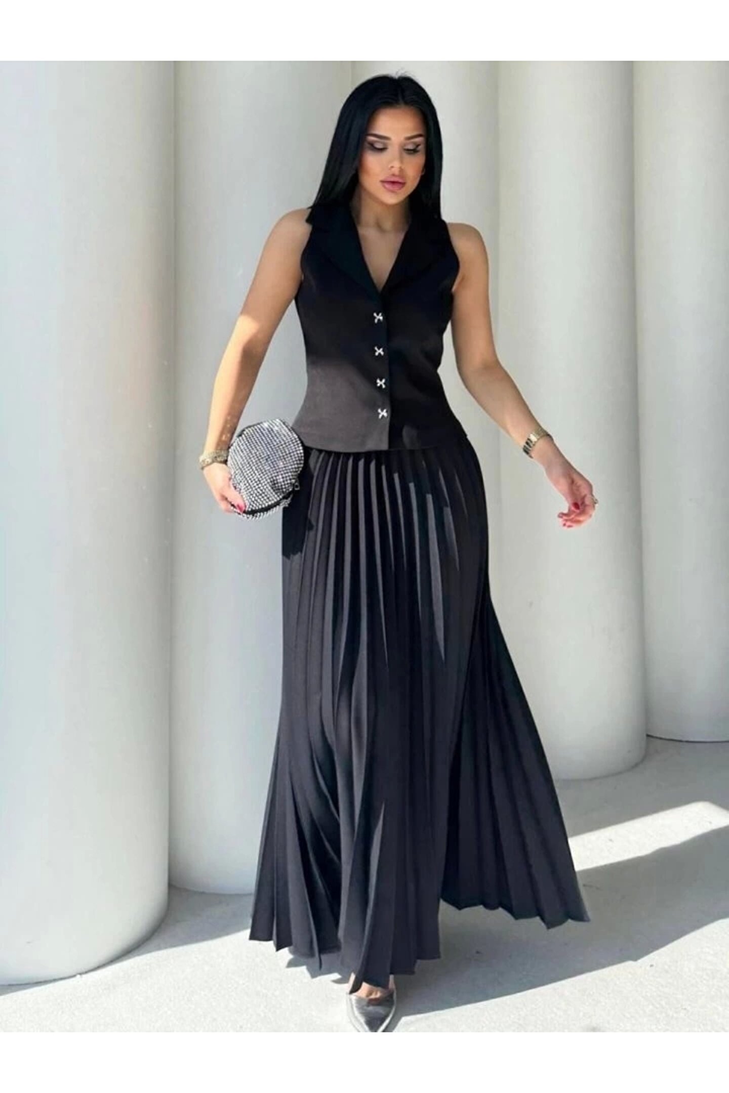 Modelin Ölçüleri: Boy:165, Kg:55, Göğüs:90, Bel:72, Kalça: 100 Modelin üzerindeki ürün M/38 bedendir Trendleri belirleyen kadın giyim markası velmorafashion'a hoşgeldiniz! VelmoraFashion, kadınların tarzlarını ifade etmelerine ve güçlü bir duruş sergilemelerine olanak tanıyan bir markadır.; 2018 yılından bu yana sektörde varlığını sürdüren firmamız, yenilikçi tasarımları ve kaliteli ürünleriyle dikkat çekiyor.; VelmoraFashion olarak amacımız, her kadının kendine özgü tarzını yansıtabileceği, güvenilir ve şık giyim seçenekleri sunmaktır.; Koleksiyonlarımızda her zevke hitap eden parçaları bulabilirsiniz.; Günlük hayatta rahatlıkla tercih edilebilecek şık elbiselerden iş görüşmelerinde stilinizi tamamlayacak takım elbiselere, spor giyimden abiye modellere kadar geniş bir ürün yelpazemiz bulunmaktadır.; Tasarımlarımızı oluştururken moda trendlerini yakından takip ediyor, farklı tarzlara ve bedenlere uygun seçenekler sunmaya özen gösteriyoruz.; Aynı zamanda kalite ve dayanıklılık da önceliklerimiz arasındadır.; Her parça, titizlikle seçilen kumaşlar ve dikkatle işlenen detaylarla özenle üretilmektedir.; Müşteri memnuniyeti bizim için en önemli önceliktir.; Profesyonel müşteri hizmetleri ekibimiz, her adımda size yardımcı olmak ve alışveriş deneyiminizi en üst düzeye çıkarmak için buradadır.; Siz değerli müşterilerimizin geri bildirimleri, bizi daha da ileriye taşımak için önemli bir kaynaktır.; Velmora Fashion olarak, sadece giyimde değil, aynı zamanda kadınların güçlendirilmesi ve kendilerini ifade etmeleri konusunda da bir misyon taşıyoruz.; Her kadının kendi tarzını keşfetmesine ve kendine güvenle adım atmasına yardımcı olmak için buradayız.; VELMORAFAShion'da her detayı düşünülmüş, şıklığı ve rahatlığı bir arada sunan parçalarla dolu koleksiyonlarımızı keşfetmek için sizi mağazamıza bekliyoruz.; Siz de ailemize katılın ve tarzınızı keşfedin!