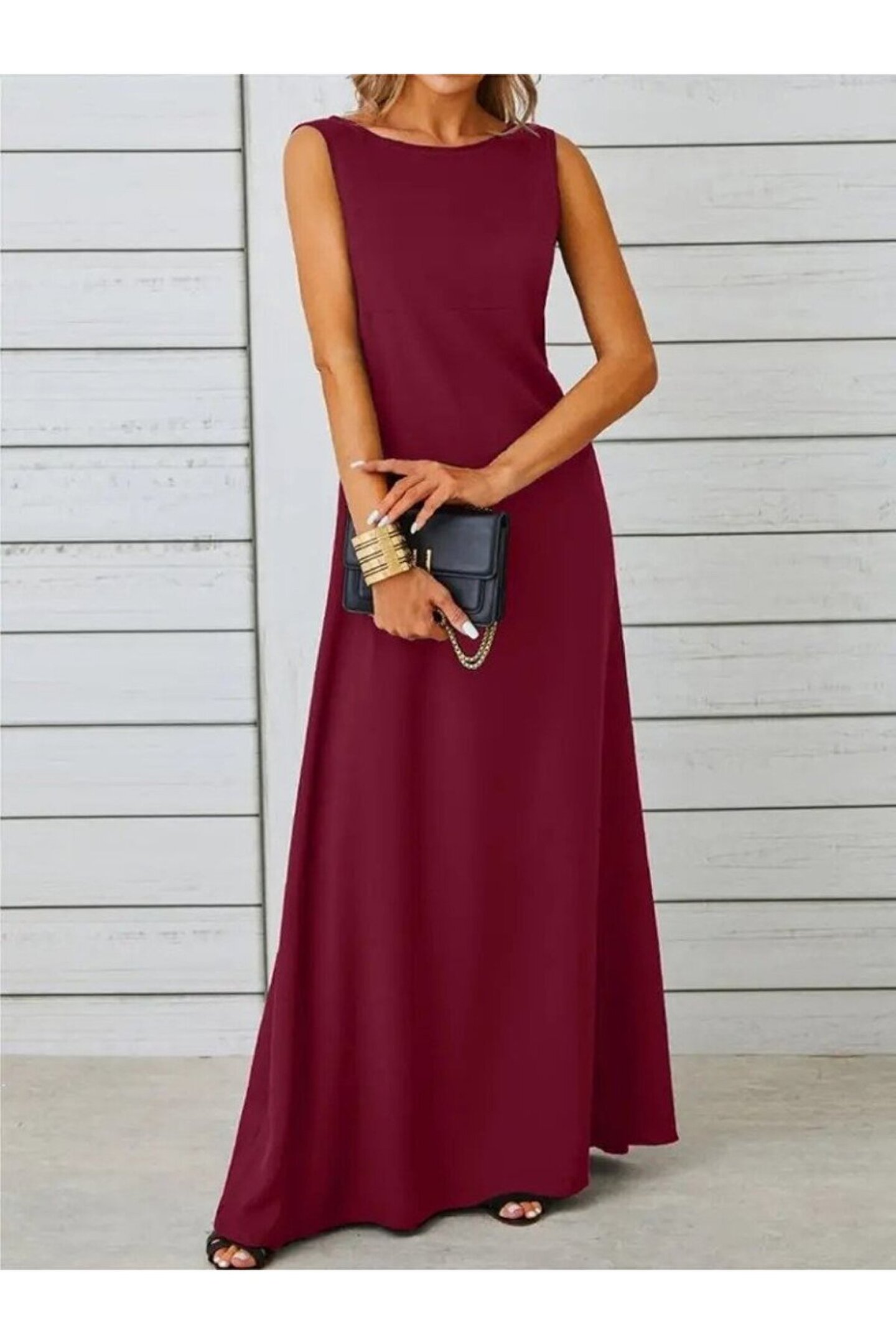 Kadın Kolsuz Kayık Yaka Maksi Janjan Krep Elbise