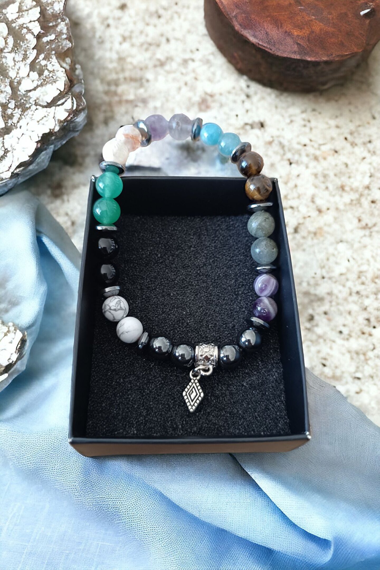 Tüm Taşlarımız Doğal Orijinal GerçekTaştır Piyasada Sentetik boncuk Taşlar ile lütfen Mukayese etmeyin ; Tüm ürünler orijinal Sertifika ilegönderilir Faturanız kesilir Sisteme işlenir ; Başarı Bilekliği Odaklanma Bilekliği ; Taşlar : Labradorit Florit Kaplan Gözü Havlit Aventurin Obsidyen Sitrin Apatit Ametist taşı Hematit Taşı ; Kesim: Normal kesim model + Disk kesim ; Taş boyutu : 8 mm - hematit disk 8 mm ; Taş sayısı : Bedenlere göre değişim olur ; Aparat: Metal Desenli ; Metal: Paslanmaz kaplama metallerdir ; Görüntü: Resim Ortalama 20-21 cm göreçekilmiştir ; Bilek yapınıza göre ayarlanacakmodelde taş + artı yada - eksi olabilir ; Bileklik ölçüsü: 16-17 cm - 18-19 cm -20-21 cm - 22-23 cm ; Sargı: 1 mm misina ipi Kalite: Doğaltaşlar ; Ürün içeriği: bileklik + sertifika +yedek misina ; Ambalajı: Seçenekler Mevcuttur ; Paket içeriği : 1 adet bileklik + 20-25cm uzunluğunda1 adet yedek misine ; İp: Esnek uzayıp kısalabilen misina herbileğe uyum sağlar bileği sıkmaz ; Ayrıca yedek misina gönderilmektedirbileklik bilek yapınıza göre yeniden tasarlayabilirsiniz ;