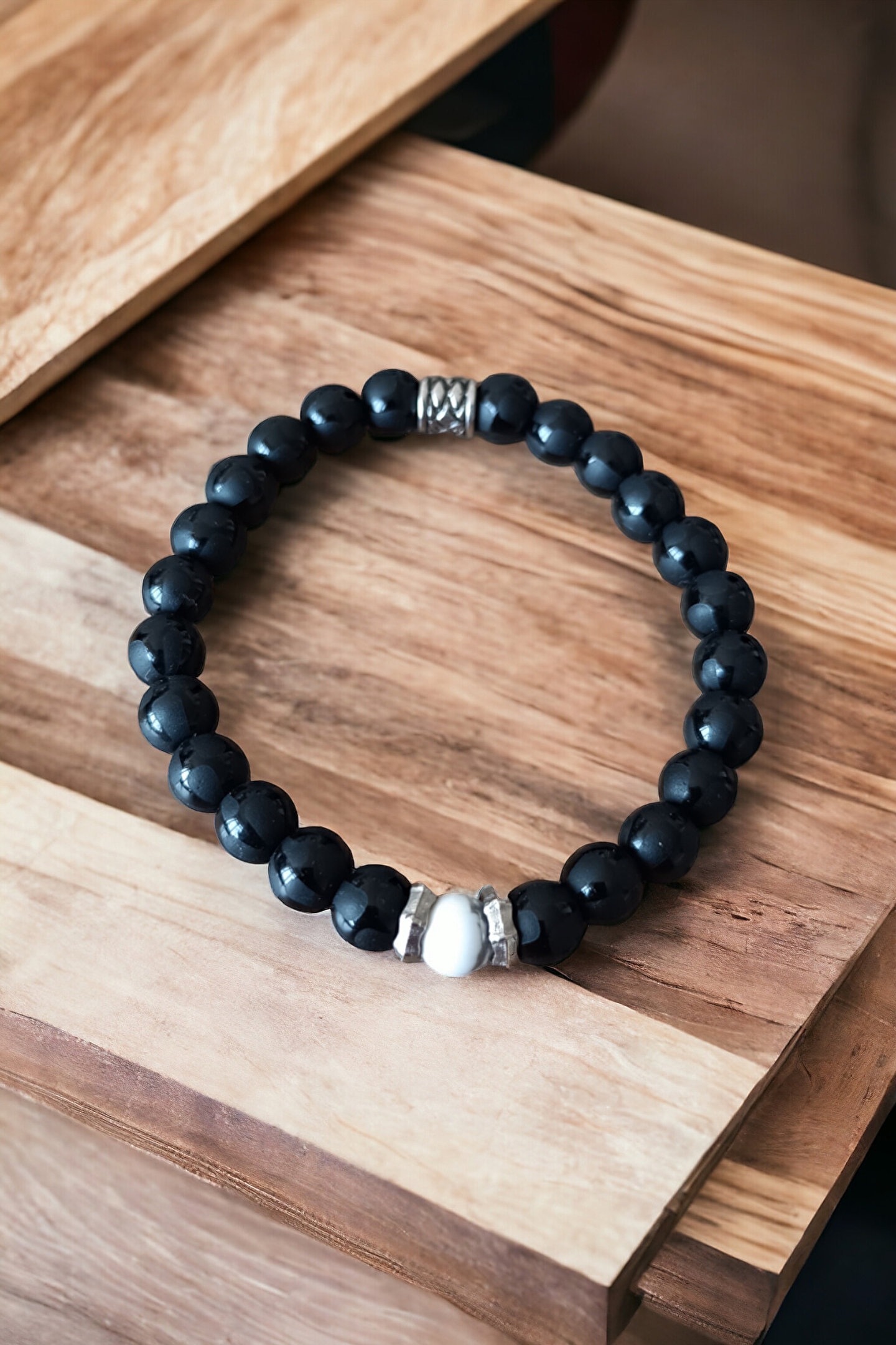 Tüm taşlarımız doğal orijinal gerçektaştır piyasada sentetik boncuk taşlar ile lütfen mukayese etmeyin ; Tüm ürünler orijinal sertifika ilegönderilir faturanız kesilir sisteme işlenir ; Taşlar : Desenli oniks taşı + havlit taşı ; Kesim: Normal kesim model + disk kesim ; Taş boyutu : 8 mm ; Taş sayısı : Bedenlere göre değişim olur ; Aparat: Metal desenli ; Metal: Paslanmaz kaplama metallerdir ; Görüntü: Resim ortalama 20-21 cm göreçekilmiştir ; Bilek yapınıza göre Ayarlanacakmodelde taş + artı yada - Eksi olabilir ; Bileklik ölçüsü: 16-17 cm - 18-19 cm -20-21 cm - 22-23 cm ; Sargı: 1 mm misina ipi kalite: Doğaltaşlar ; Ürün içeriği: Bileklik + sertifika +yedek misina ; Ambalajı: Seçenekler mevcuttur ; Paket içeriği : 1 adet bileklik + 20-25cm uzunluğunda1 adet yedek misine ; Ip: Esnek uzayıp kısalabilen misina herbileğe uyum sağlar bileği sıkmaz ; Ayrıca yedek misina gönderilmektedirbileklik bilek yapınıza göre yeniden tasarlayabilirsiniz ;