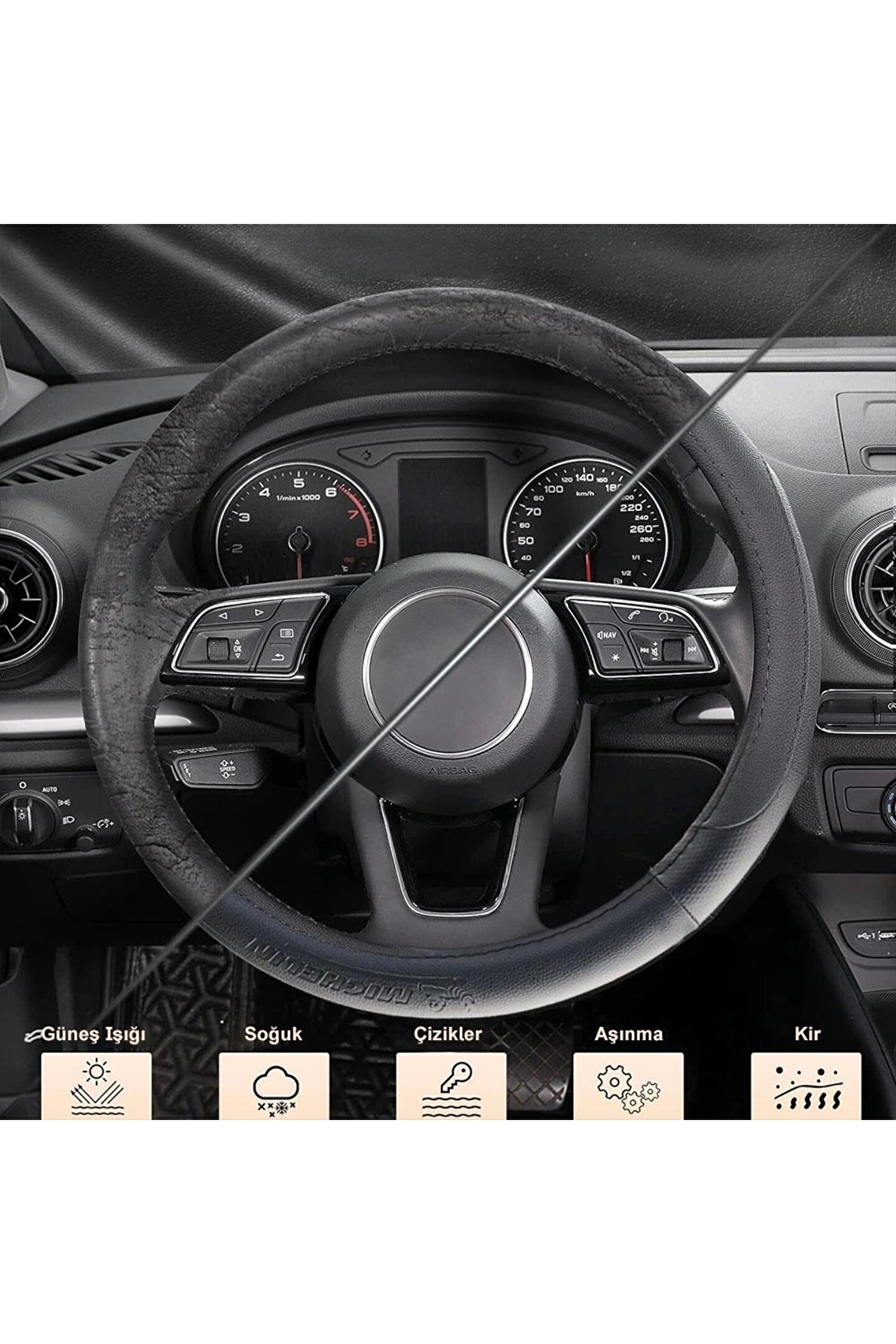 · Michelin MC1003N Premium Suni Deri Direksiyon Kılıfı SİYAH · MICHELIN iFit™ özel dokusu sayesinde kaymayı önler, tam kavrama ile güvenli sürüş sağlar.; · MICHELIN iFit™ direksiyon kılıfı, aracınızın direksiyon simidini güneş ışığından, elde oluşan terlemenin verdiği asidik zararlardan korur, dökülmelere ve yıpranıp aşınmasına engel olur.; · Soğuk ve karlı havaların direksiyon simidini dondurup zarar vermesini engeller.; · Yüzük ve bileklik gibi metal takıların direksiyon derisine zarar vermesini engeller.; · Direksiyon simidinizi darbe ve aşınmalardan korur, uzun süre bozulmadan kullanım sağlar.; · Direksiyon simidinizi yağlanma, lekelenme, solma, tozlanma ve kirlenme gibi tüm dış etkilerden korumanızı sağlar.; · Özel olarak güçlendirilmiş dikiş yapısı sağlam, sorunsuz kullanım ve tüm dış etkilere karşı dayanıklılığı artırır.; · Çift dikişli özel yapısı uzun ömürlü kullanım ve maksimum dayanıklılık sağlar.; · Nefes alabilen özelliği sayesinde mükemmel nem emilimi sağlar ve aşırı ısınmayı önler.; · Yaz ve kış ayları için 4 mevsim kullanıma uygundur.; · Serin ve soğuk havalarda rahat ve konforlu tutuş sağlar.; · Nefes alabilen özel yapısı koku oluşumunu engeller.; · Özel geliştirilmiş kaymayı önleyen dokusu sayesinde tam tutuş ve güvenli sürüş sağlar.; · Güçlü kaydırmaz iç şeritler kılıfın direksiyonu tam kavramasını ve kılıfın kaymamasını sağlayarak güvenli sürüş yapmanıza imkân verir.; Aşırı sıcak havalarda direksiyon kılıfının gevşemesini, esnemesini engeller.; · Tamamen doğal ürünlerden üretilmiş olup, kokusuz, çevre dostu ve alerji oluşturmayacak özel dokusu sayesinde güvenle kullanabilirsiniz.; · Ergonomik olarak tasarlanmış özel kavrama alanları, yumuşak ve konforlu tutuş, kaymaz kavrama ile uzun yolculuklar ve gün boyu araç kullananlar için yorulmadan kullanım sağlar.; · Özel ve şık tasarımı aracınıza değer katar.; · MICHELIN iFit Stretch™ özel tasarımı sayesinde kolay takma ve sökme imkânı sağlar.; · 36mm- 39mm çapındaki standart tüm binek araçların, SUV araçların, Kamyonetlerin, Minibüslerin, Pikapların direksiyonlarına uyumludur.; · Çapı 14,5"(36.8cm) ila 15,5"(39.4cm) olan çoğu araç direksiyon simidine uyar.; · Boyut: 381x381x31 · Toplam ağırlık 0,25 kg