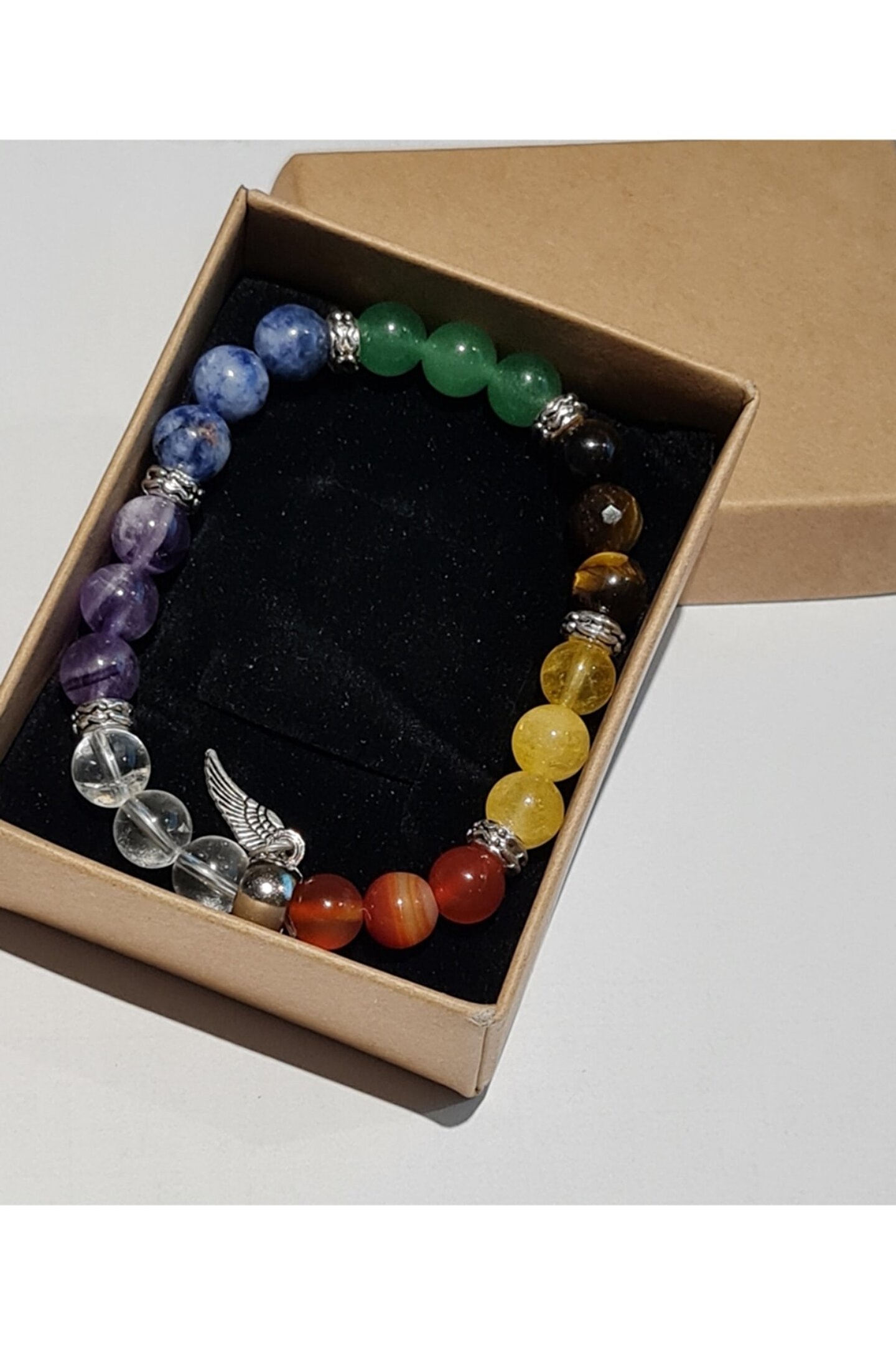 7 Çakra Taşı Bilekliği - 3 Adet Kristal Kuvars -3 adet Ametist -3 Adet Sodalit -3 Adet Aventurin -3 Adet Kaplan Gözü -3 Adet Sitrin -3 Adet Akik Doğal taşları bulunmaktadır. ; -6 ara halka ve ucunda Melek Kanadı Süsü vardır. ; **Şeffaf Misine Kullanılmıştır. ; Takması ve çıkartması çok kolaydır. ; -İsime göre kodlama yapılacaktır. ; Lütfen soru sor kısmından İsim soy isim doğum tarihinizi yazar mısınız?;