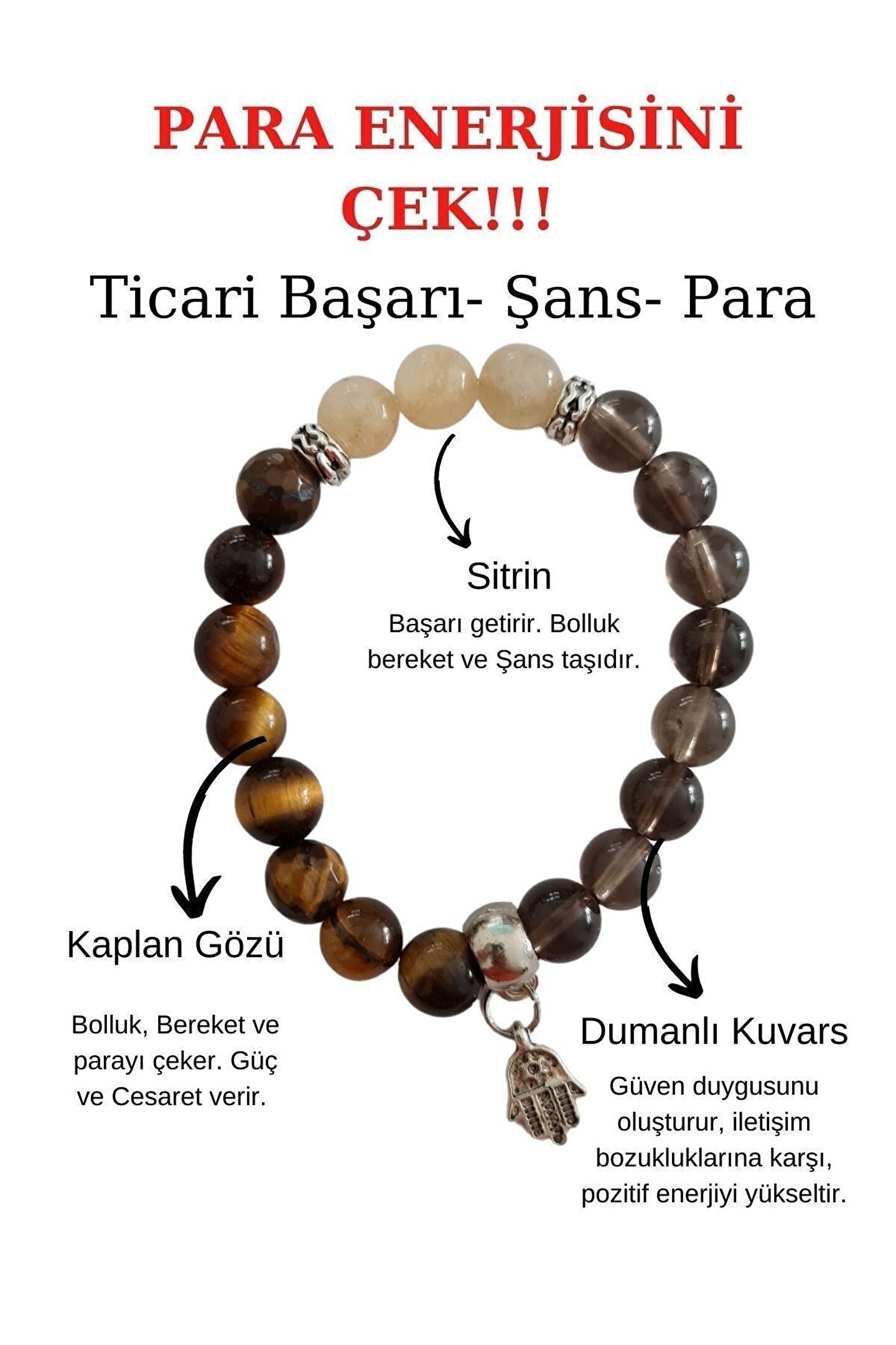 Para Bereket ve Zenginlik Doğal Taş Tılsım Bilekliği Dumanlı Kuvars, Sitrin, Kaplan Gözü Taşı Doğal Taş Bileklik S: 8 Adet Dumanlı Kuvars, 8 Adet Kaplan Gözü, 3 Adet Sitrin M: 9 Adet Dumanlı Kuvars, 9 Adet Kaplan Gözü, 3 Adet Sitrin L:10 Adet Dumanlı Kuvars, 10 Adet Kaplan Gözü, 4 Adet Sitrin Taş boyutu 7 mm dir; Lastikli Misine ile yapılmıştır;