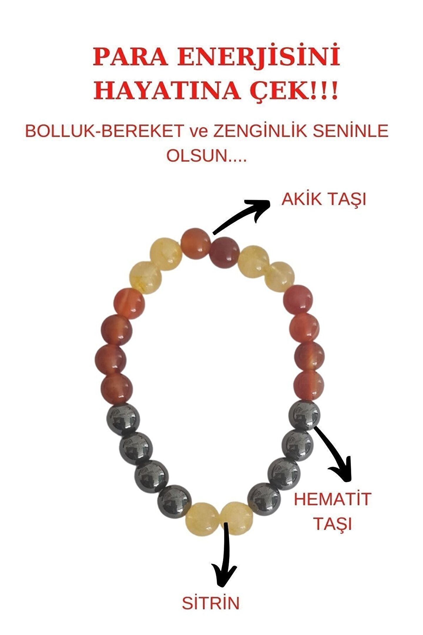 Doğal taş materyali ile üretilmiş, hem şıklığı hem de doğallığı bir arada sunan bileklik; Hem hematit hem de sitrin taşı içeren bileklik, enerjiyi dengelemeye yardımcı olur ve zenginlik getirdiği söylenir; Akik taşı ile zenginleştirilmiş bileklik, hem estetik hem de faydalı bir aksesuar olarak öne çıkar; Her bir bileklik, benzersiz desenleri ve renkleriyle kişisel tarzınıza özgün bir dokunuş katar;