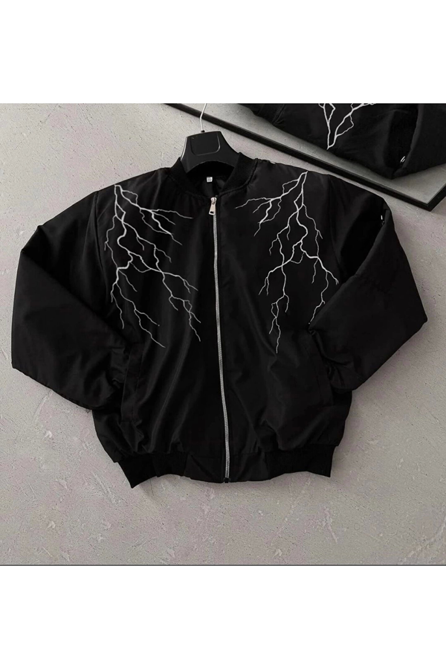 miklow Yıldırım Baskılı Uzun Kol Bomber Ceket - Siyah