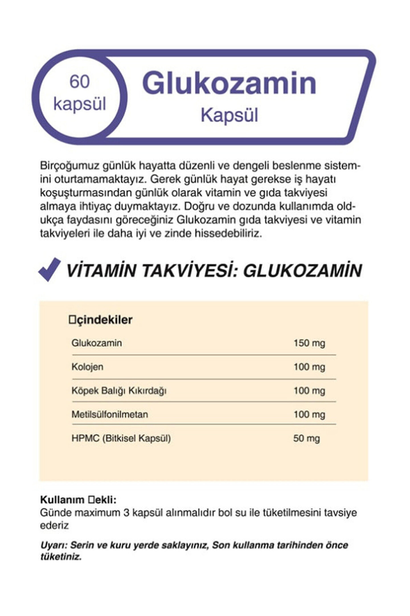 Kapsül formu, kolay ve pratik kullanım sağlar; günlük rutininize kolayca entegre edilebilir; Glukozamin ve köpek balığı kıkırdağı kolajeni içeriği ile eklem sağlığını destekler ve hareket kabiliyetini artırır; Her pakette 60 kapsül bulunur, böylece uzun süreli kullanım için yeterli miktarda ürün sunar; İki adet paket halinde sunulan bu ürün, düzenli takviye ihtiyacınızı karşılamak için idealdir;
