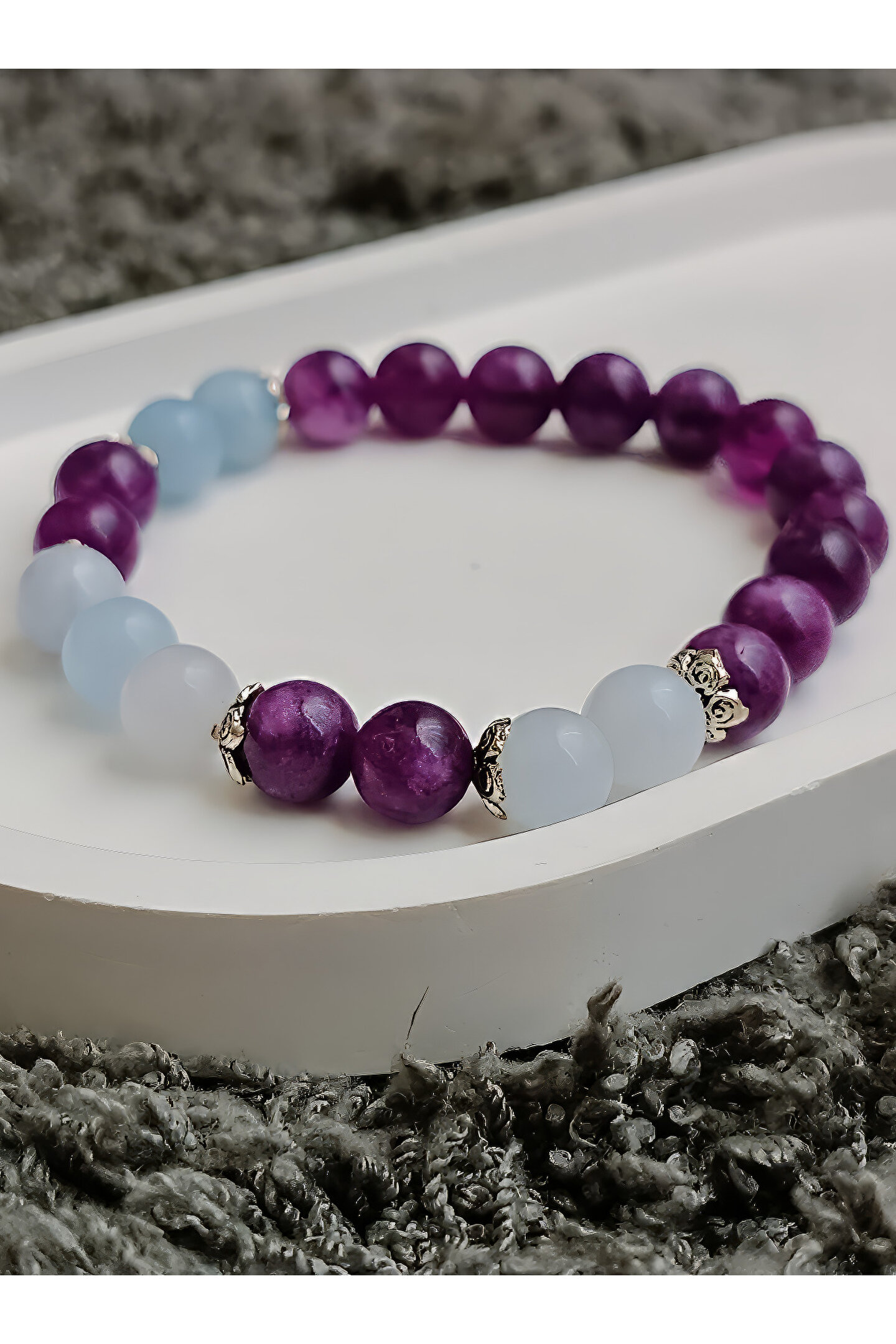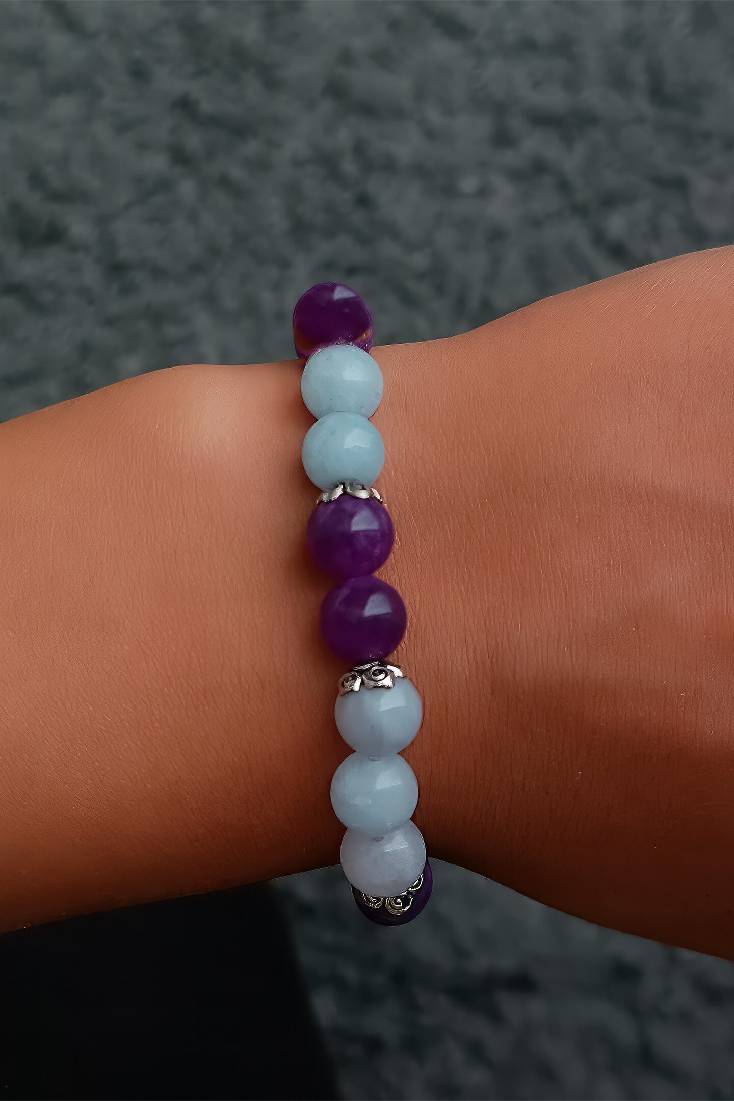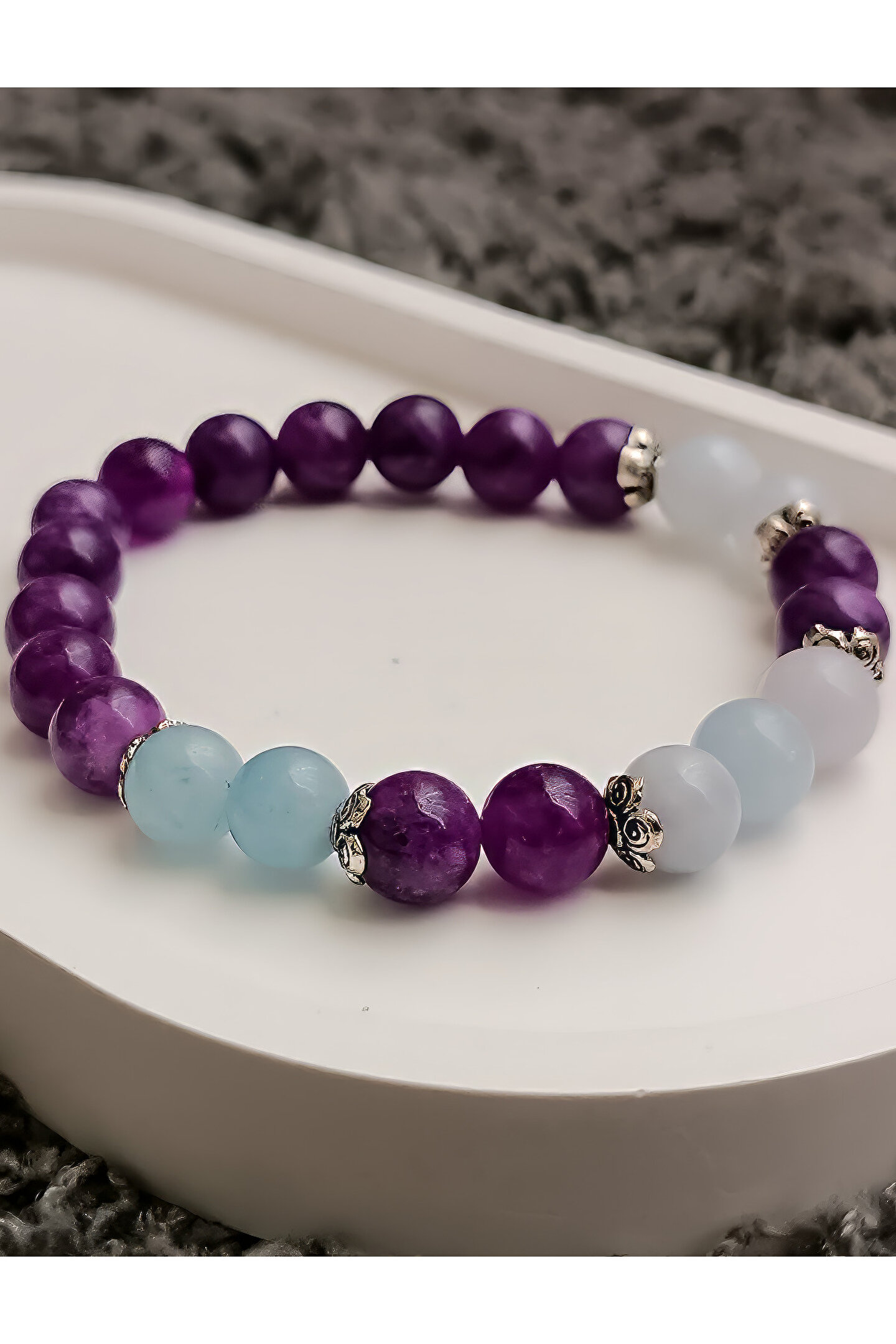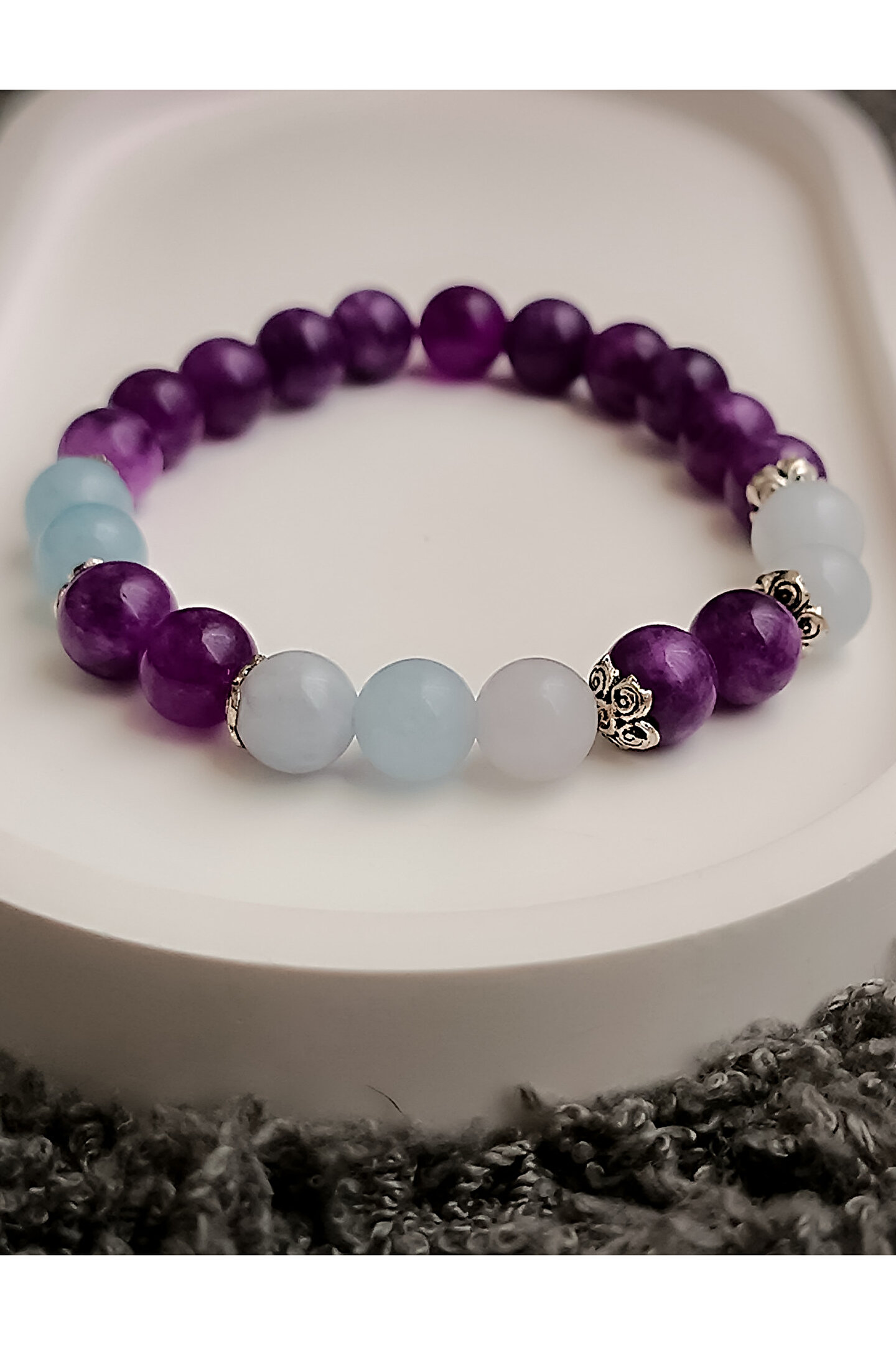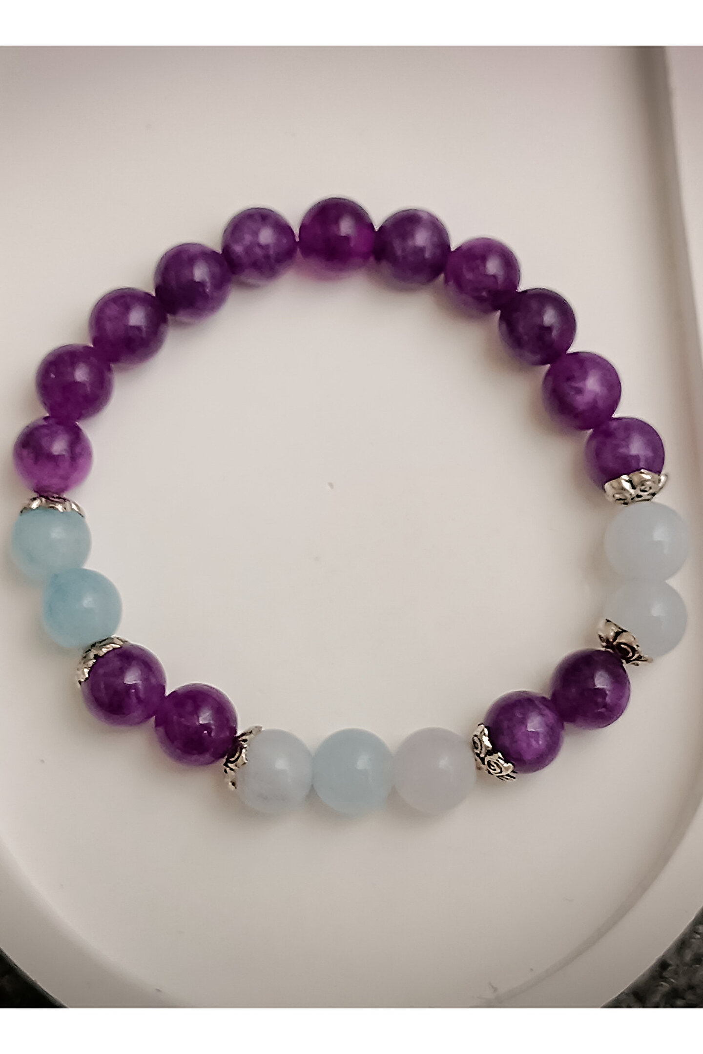 Doğal taş kullanımı sayesinde her bileklik benzersiz ve otantik bir görünüm sunar; Akuamarin ve ametist gibi değerli taşların birleşimi, bilekliğe zarif bir parlaklık ve estetik bir dokunuş katar; Taşın doğal yapısı, bilekliğin hem şık hem de dayanıklı olmasını sağlar; Akuamarin ve ametist taşlarının renkleri, bilekliğe canlılık ve enerji verirken, her türlü kıyafetle uyum sağlar;