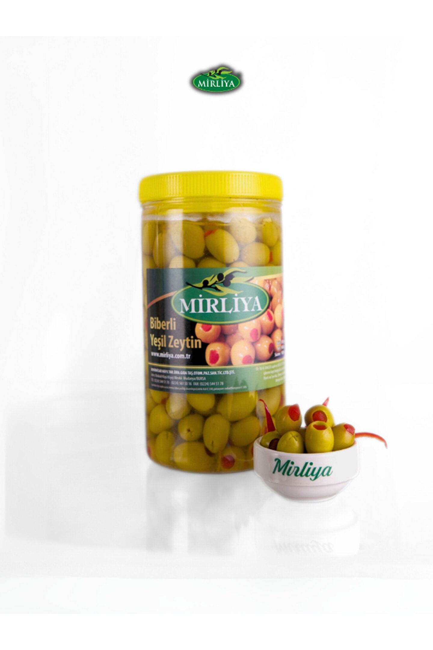 Mirliya Biber Dolgulu Yeşil Zeytin 1 Kg Doğal fermantasyon yöntemi kullanılarak acılığı suda giderilen ve tatlandırılan Mirliya Biber Dolgulu Yeşil Zeytin tüm hijyen kuralları göz önünde bulundurularak el emeği ile üretilmektedir.; Kahvaltıların ve aperatiflerin mükemmel bir tamamlayıcısıdır.; Özellikle bir miktar zeytinyağı ve limon sıkılarak tüketildiğinde hem zeytinin hem kırmızı yağ biberinin tadını aynı anda hissedeceksiniz.; ; Üretim yılı: 2024 HASAT DÖNEMİ S.; K.; T:12/2026Üretim yeri: Mudanya Zeytin çeşidi: Domat Kalibre-Dane: (231-260) L;