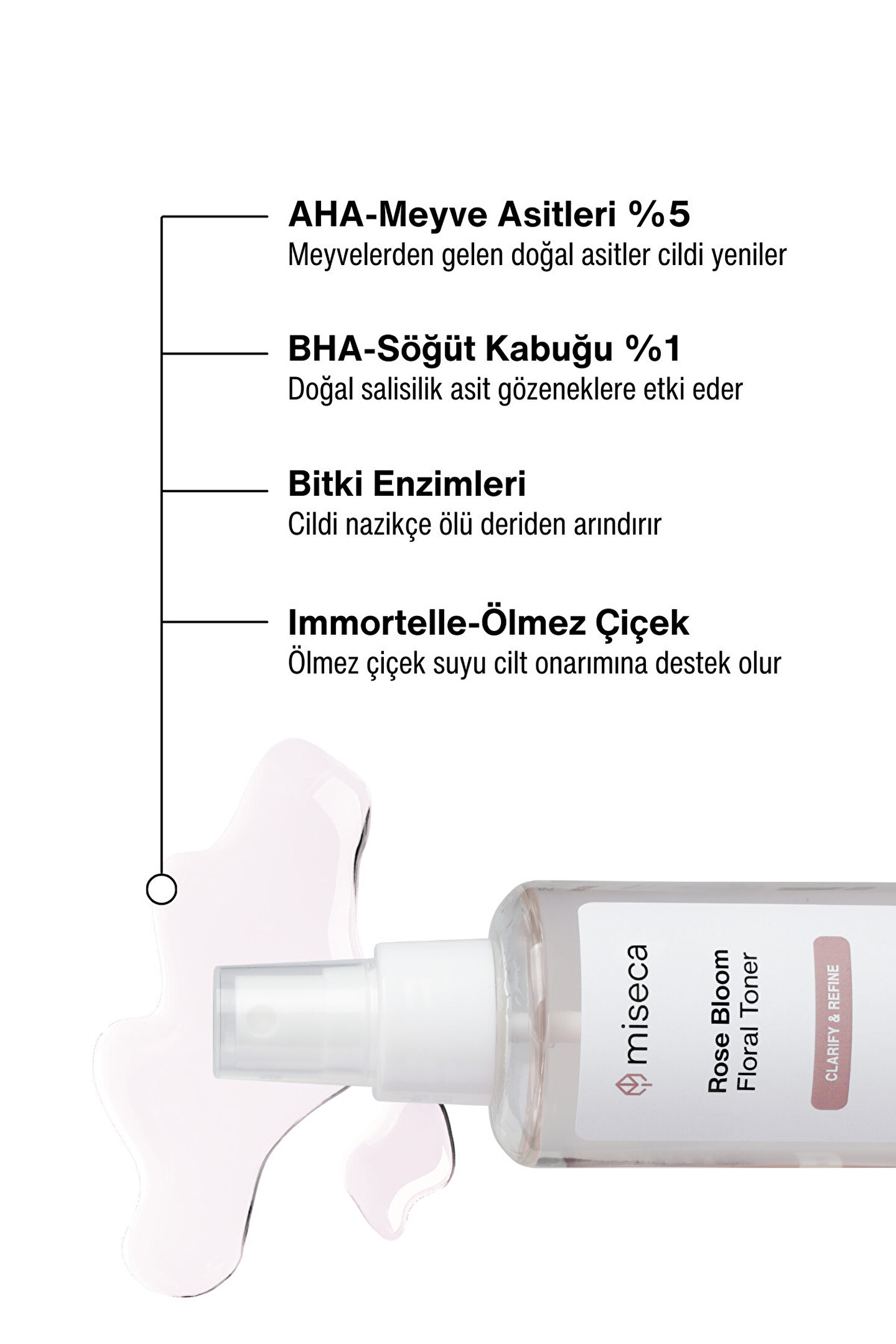 AHA asitleri ile cilt yüzeyinde soyma yaparak ölü tabakanın uzaklaşmasını ve cildin yenilenmesini sağlar.; Cilt lekeleri ve ton eşitsizliğini minimuma indirerek cildin aydınlanmasını sağlar ve pürüzsüz bir görünüme kavuşturur.; ; İçeriğindeki BHA (Salisilik asit) yağda çözünebilme özelliği ile gözeneklere derinlemesine ulaşır ve temizliğine yardımcı olur.; Gözenek görünümü, komedon ve siyah nokta gibi problemlerde etkilidir.; Onarıcı ve nemlendirici içeriklerle desteklenmiştir, cildi tahriş etmeden etkisini gösterir.; ; İçindekiler: İçindekiler: Aqua (Saf Su), Rosa Damascena Flower Water (Gül Suyu), Pelargonium Graveolens Flower Water (Itır Suyu), Pentylene Glycol (Bitkisel Nemlendirici/Koruyucu), Glycerin (Bitkisel Nemlendirici), Glycolic Acid (AHA), Lactic Acid (AHA), Panthenol (B5 Vitamini), Sodium PCA (Doğal Nemlendirme Faktörü), Malic Acid (AHA), Citric Acid (AHA), Salicylic Acid (BHA), Sodium Hydroxide (pH Ayarlayıcı), Sodium Hyaluronate (Hyaluronik asit), Sambucus Nigra Fruit Extract (Kara Mürver Özü), Allantoin (Bitkisel Nemlendirici) %4 AHA ve %1 BHA içerir.; pH: 3,5-4,0 Kullanım: Temiz cilde bir pamuk yardımıyla akşamları uygulayınız.; İlk hafta 2-3 gün uygulayarak cildinizi alıştırınız.; Cildin yenilenmesine yardımcı olur, düzenli kullanımda cildi ve gözenekleri arındırır.; Tavsiyelerimiz: Cildinizin tepkisine göre aşağıdaki bilgileri referans alarak kullanım sıklığını ayarlamanız gerekir.; Cilt alışana kadar ciltte kusma dediğimiz sivilcelenme vb.; durumlara yol açabilir.; İlk kullanımlarda hassasiyet yapabilir.; Yaz aylarında kullanım sıklığını azaltabilirsiniz.; Yağlı Ciltler: Haftada 3-5 kez Normal/Karma Cilt: Haftada 2-4 kez Hassas/Kuru Cilt: Haftada 1-3 kez Uyarılar: 25 derecenin altındaki oda sıcaklığında veya buzdolabında saklayınız.; Göz ile temasından kaçınınız, temas halinde bol su ile yıkayınız.; Uygulama sonrası güneşe maruz kalacaksanız mutlaka güneş koruyucu kullanınız.; Kullanmadan önce alerji testi yapınız.; Haricen kullanılır.