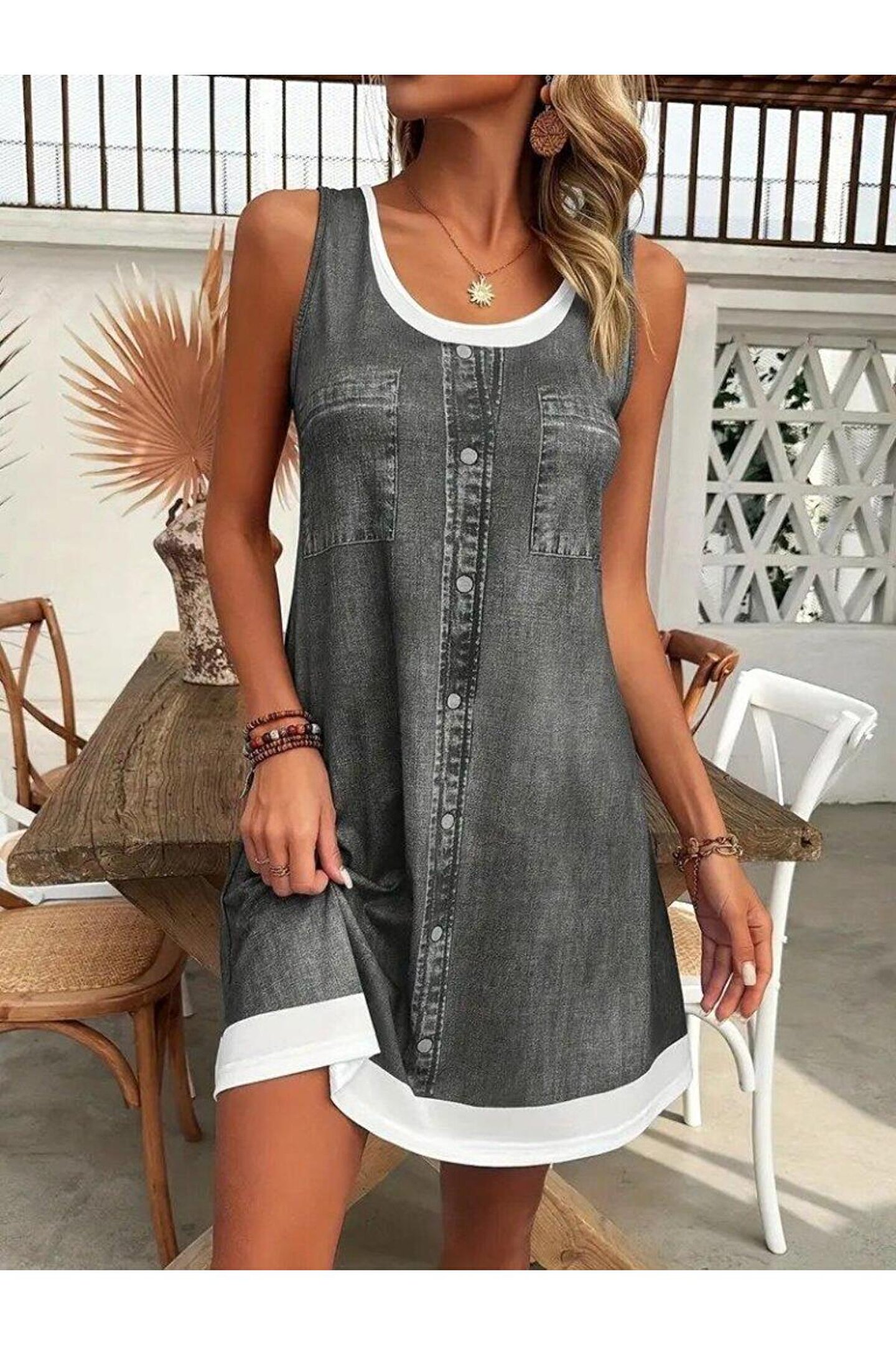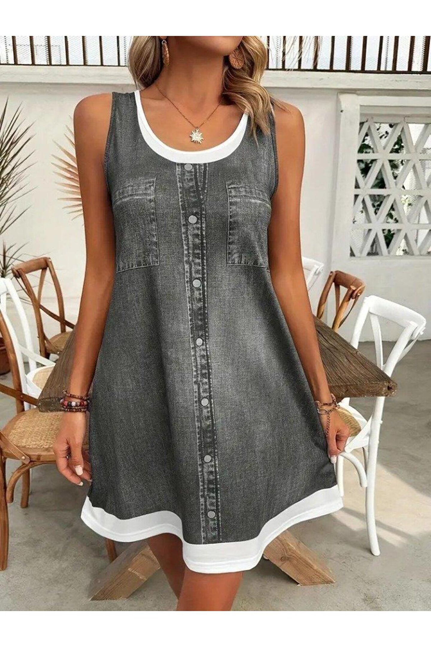 MissRunin Kadın Askılı Yuvarlak Yakalı Kot Görünümlü Kısa Süprem Elbise