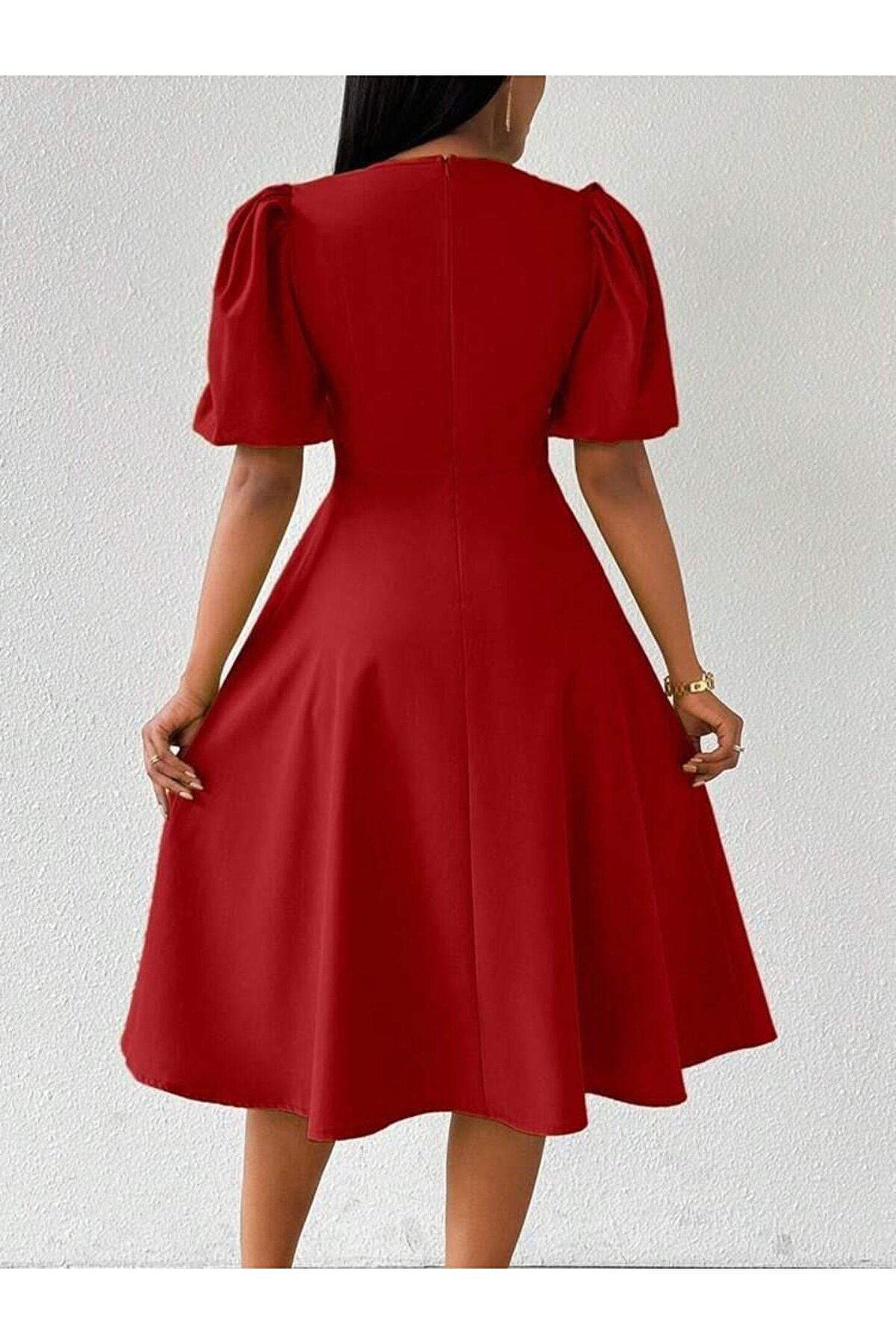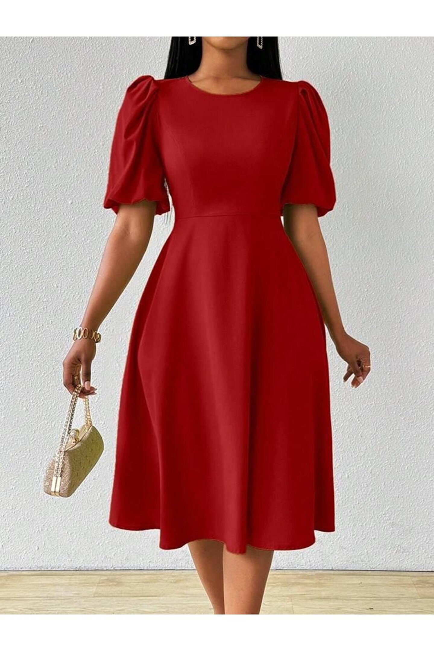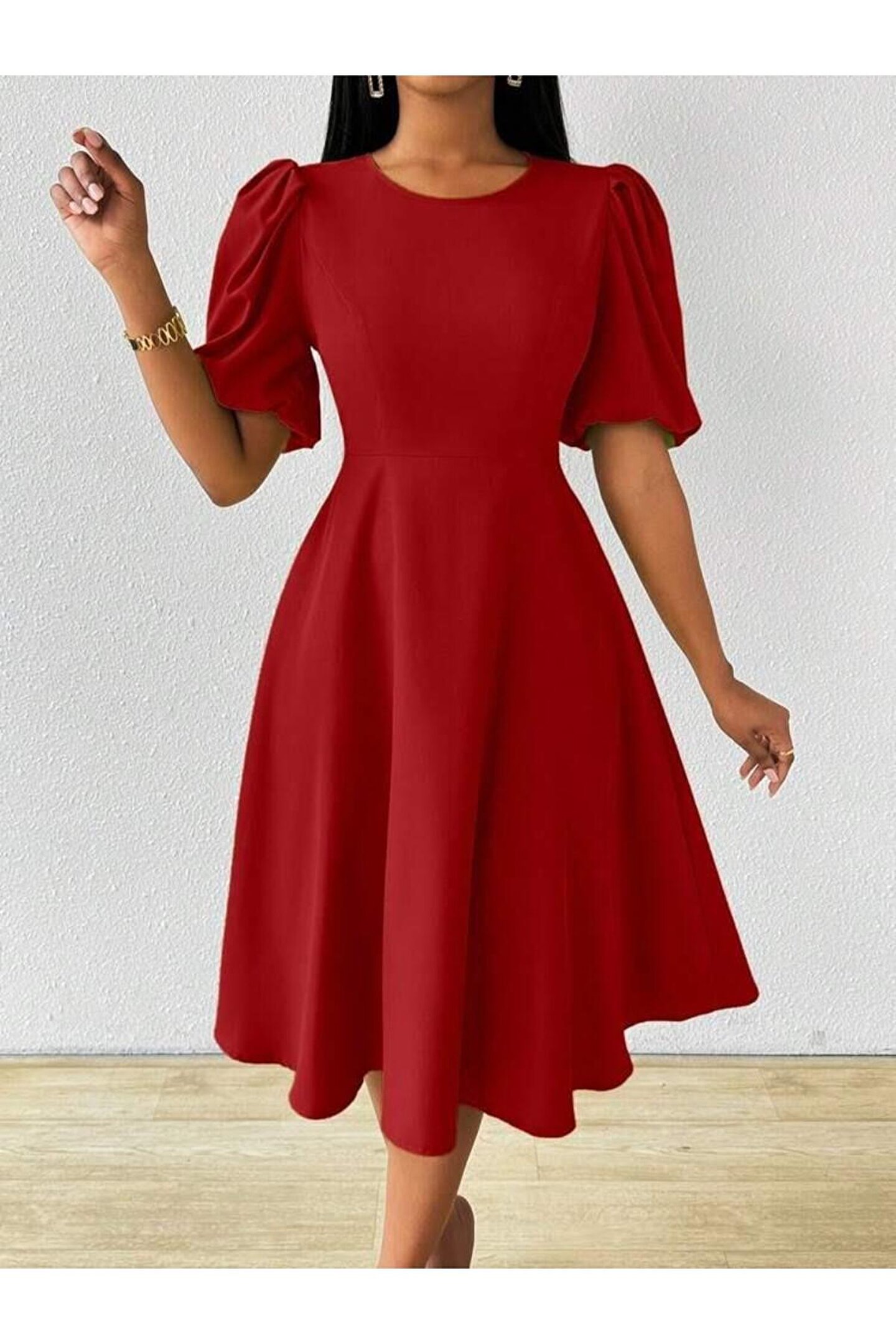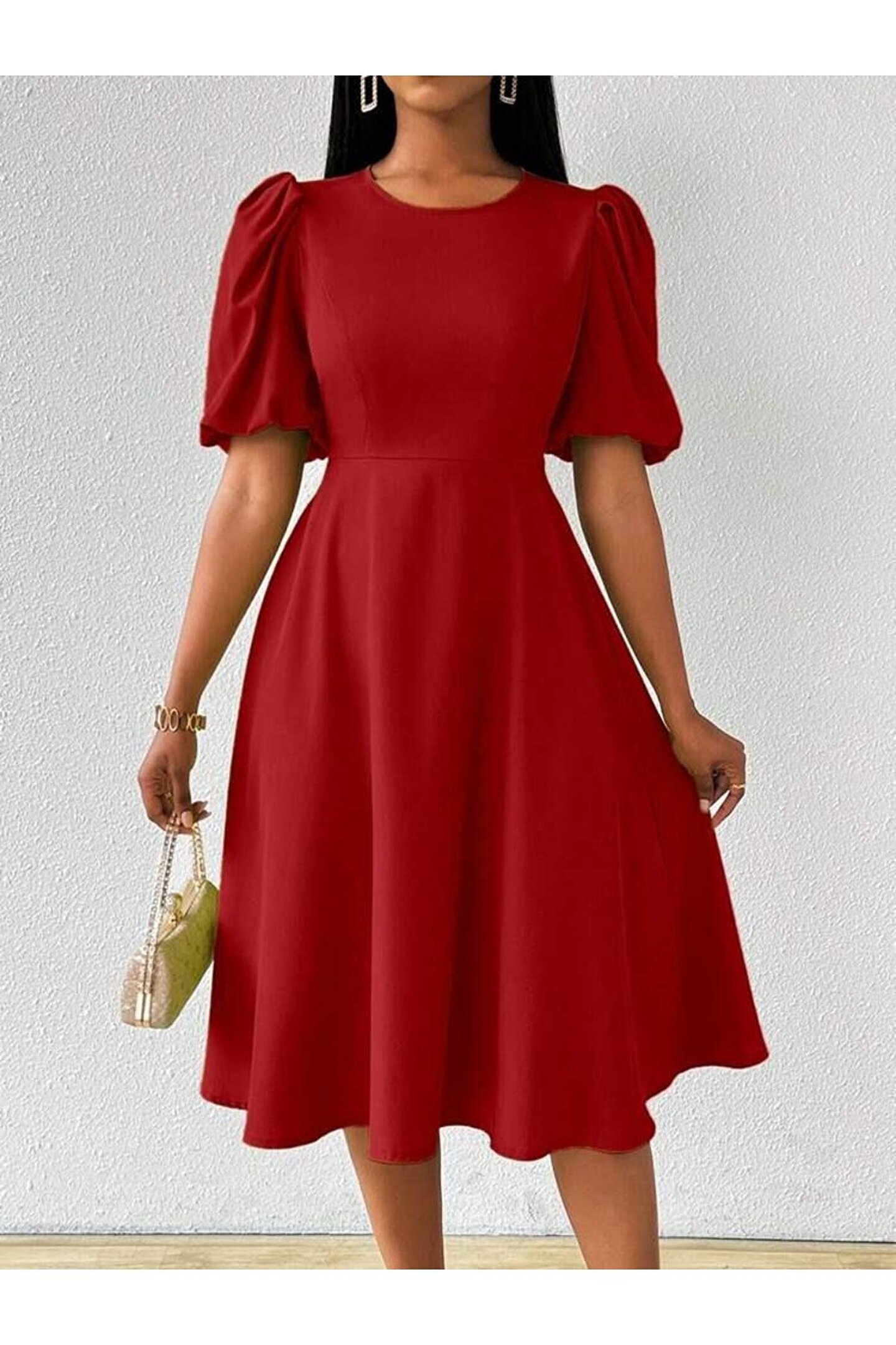 MissRunin Kadın Kısa Balon Kollu Bisiklet Yaka Kiloş Janjan Krep Elbise