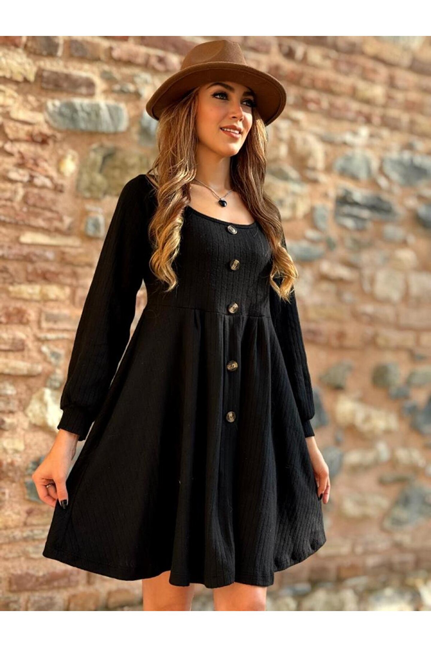 Kadın Uzun Kollu Kare Yaka Düğmeli Kısa şardonlu Iki Iplik Mini Elbise