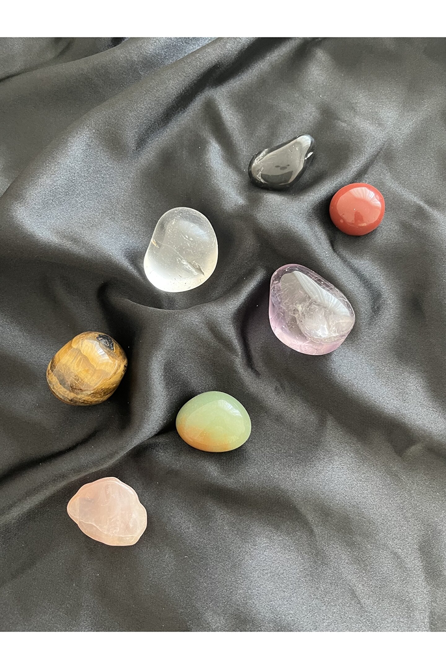 Ürün set halindedir ve set içeriğinde 7 adet doğal taş (ametist, pembe kuvars, kristal kuvars, akik, kaplangözü, oniks ve aventurin) bulunmaktadır. ; Doğal taşlar tabiatı itibariyle kendine özgü biçimdedir ve aynı taş cinslerinde dahi ufak tefek renk tonu ve biçim farklılıkları görülebilir. ; Taşların ağırlığı farklılık göstermekle birlikte 10-35 gr arasındadır. ; Çakra taşlarının enerjileri, çakralarınızın büyük bir uyum ve denge duygusu bulmasına yardımcı olmayı amaçlamaktadır.;