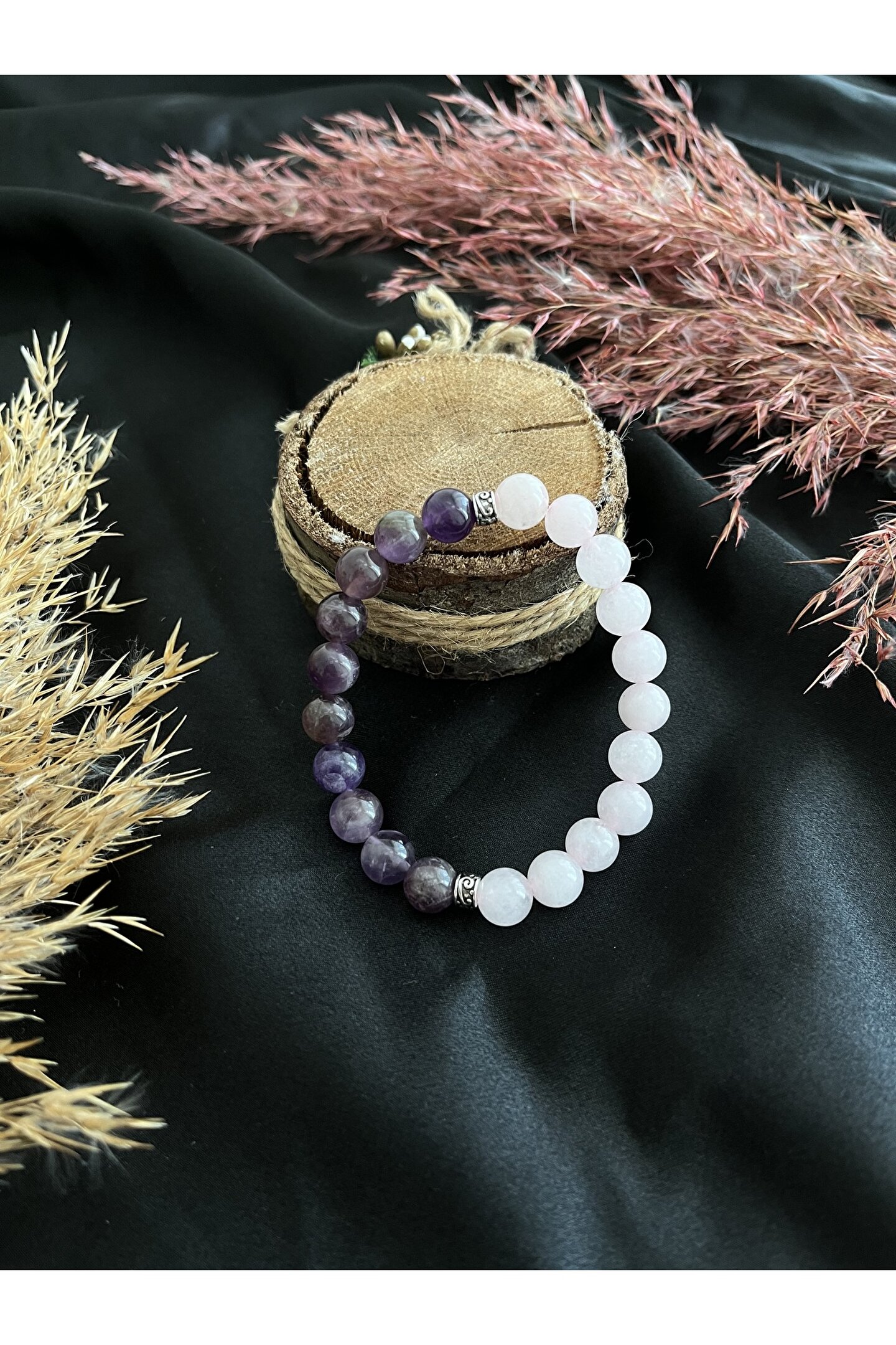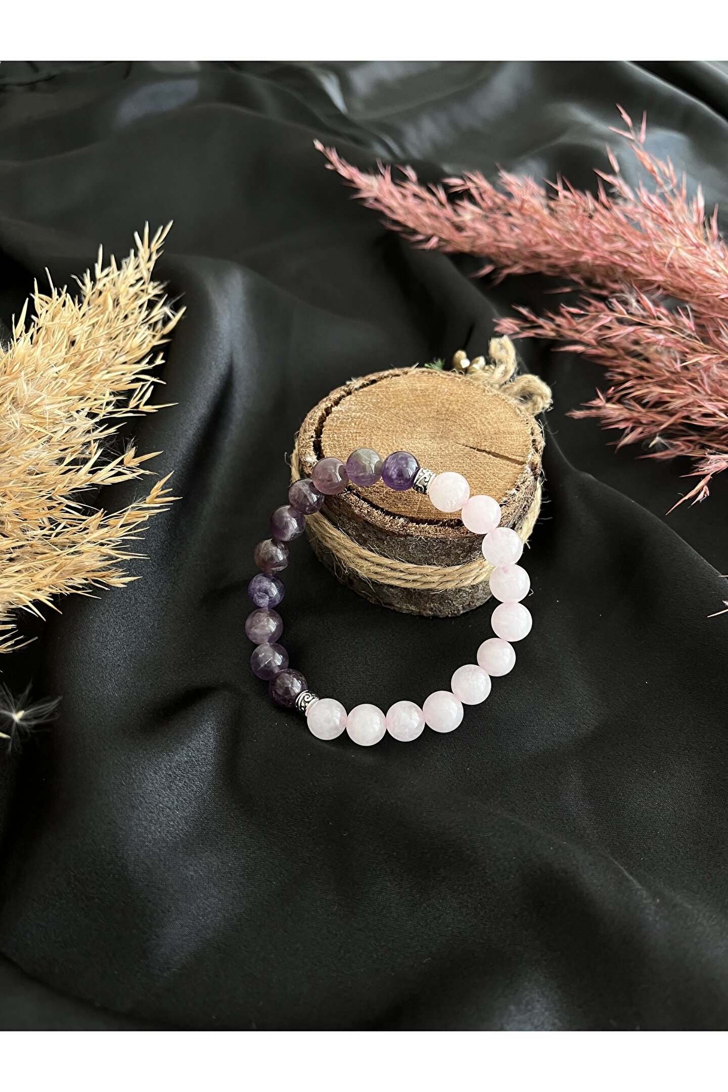 Ametist ve Pembe kuvars taşlarının birlikte kullanımı, estetik açıdan oldukça uyumlu olduğu gibi, güçlü bir enerji ortaya çıkarır.; ; Ametist taşı, depresyonu hafifletir ve anksiyete ile başa çıkmayı kolaylaştırır.; ; Pembe kuvars taşı ise, öz sevgiyi teşvik eden, sevgi enerjisi ile dolu bir kristaldir.; ; ÜRÜN BİLGİSİ: Bileklik 8 mm Ametist ve Pembe kuvars doğal taşlarının muhteşem uyumuyla tasarlanmıştır.; ; Taşlarımız gerçek doğal taştır.; ; Doğal taşlar tabiatı itibariyle kendine özgü biçimdedir ve aynı taş cinslerinde dahi ufak tefek renk tonu ve biçim farklılıkları görülebilir.; ; Bu taşın doğadaki doğal oluşumuyla ilgilidir.; ; Belli aralıklarla topraklama yöntemiyle taşınızın enerjisini temizleyip taşlarınızı arındırabilirsiniz.;
