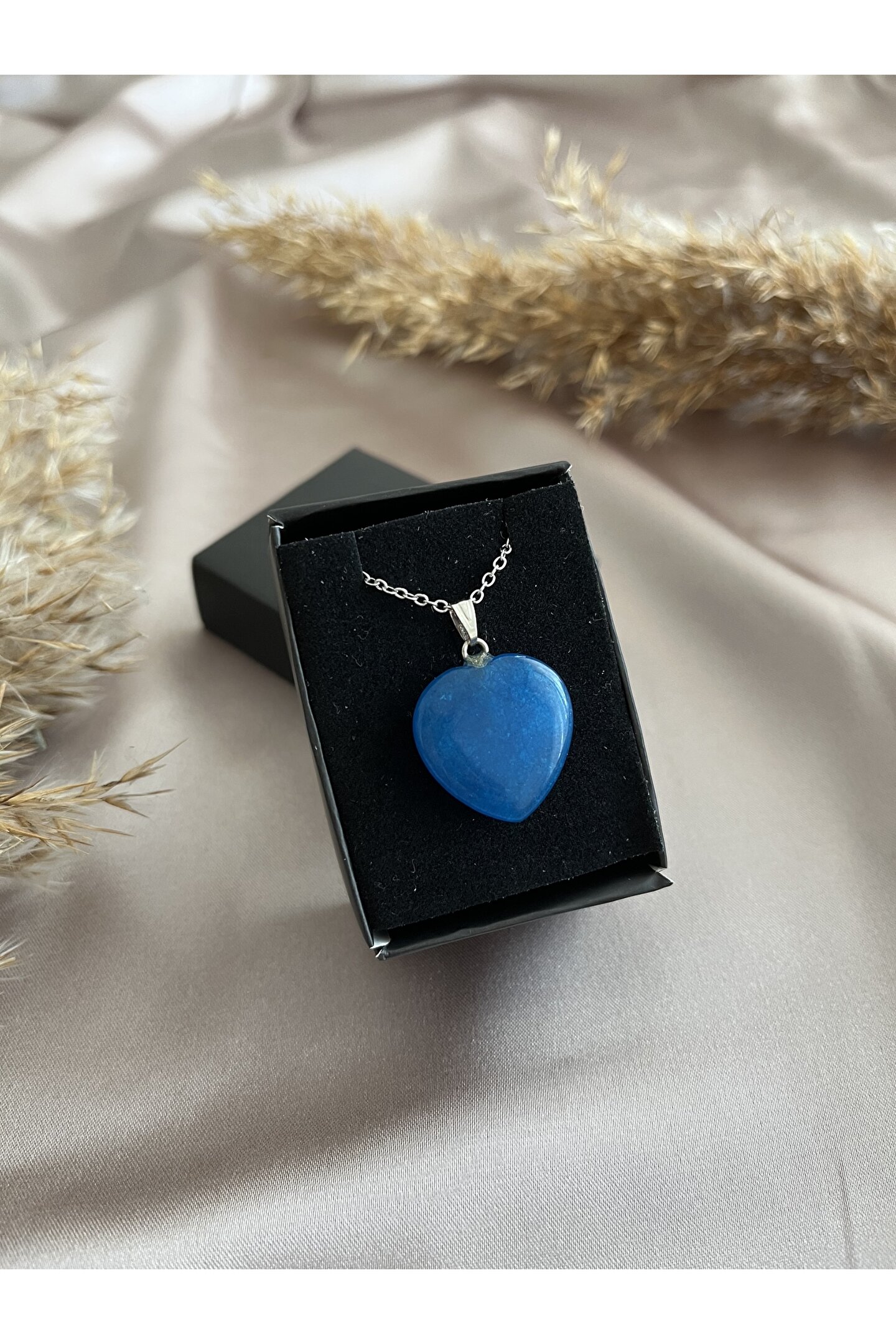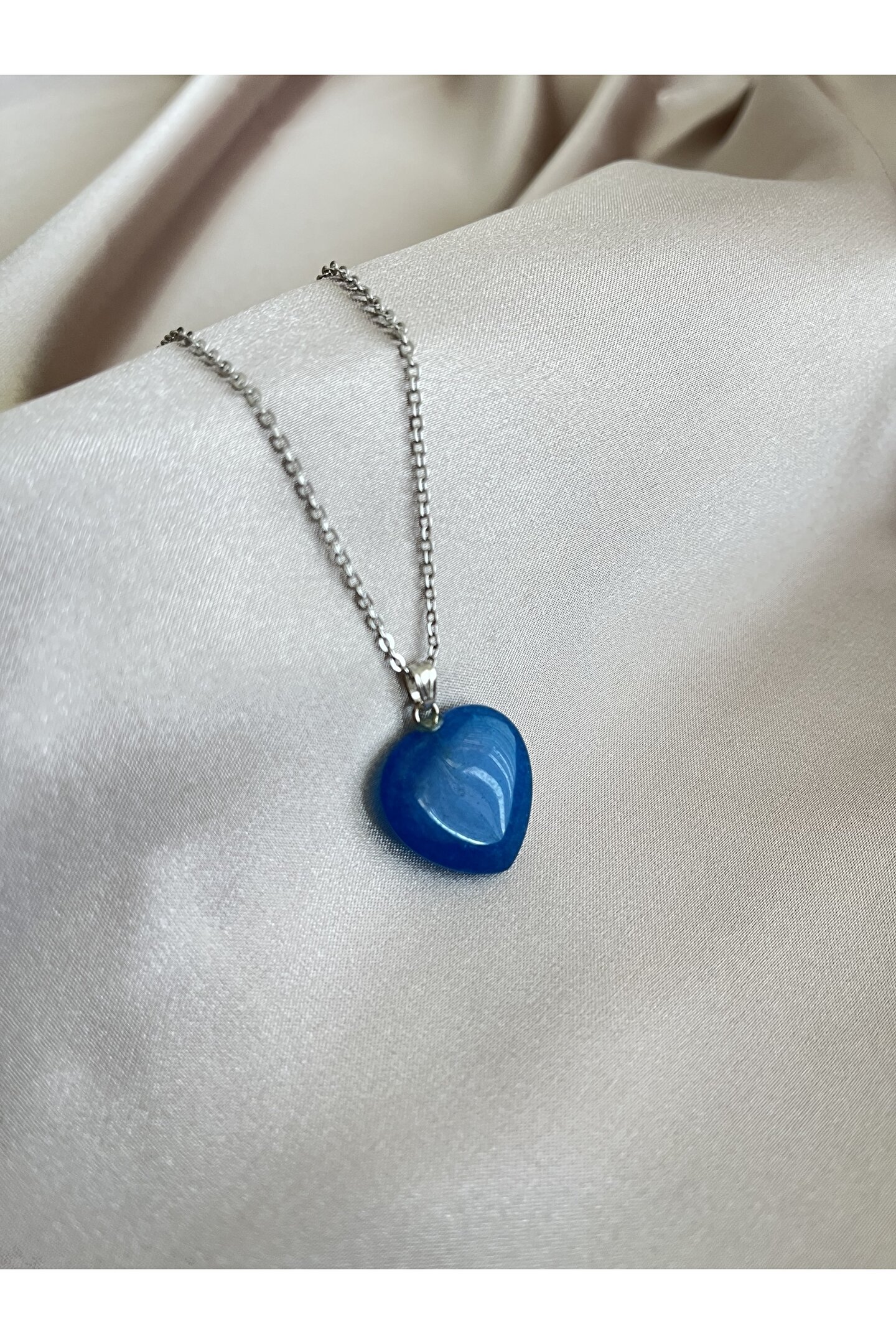 Doğal akik taşı kullanılarak üretilmiş, her bir parça benzersiz ve özgün bir görünüm sunar; Mavi akik taşı, kolyenin şıklığını ve zarafetini artırarak her kıyafetle uyum sağlar; Kalp kesim tasarımı ile hem modern hem de klasik tarza uygun bir aksesuar seçeneği sunar; Doğal taş kullanımı sayesinde, kolye hem dayanıklı hem de çevre dostu bir tercih oluşturur;