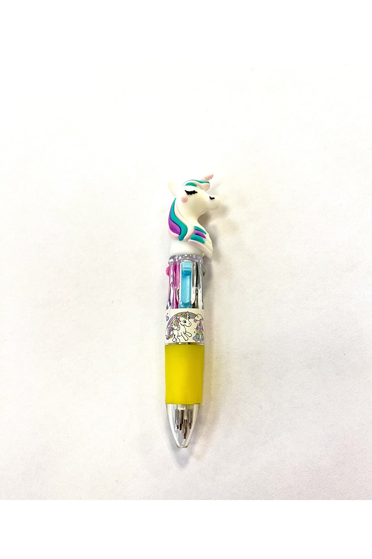 Mavi Pembe Yeşil Gri renklerde yazan 4 fonksiyonlu unicorn başlıklı tükenmez kalem.