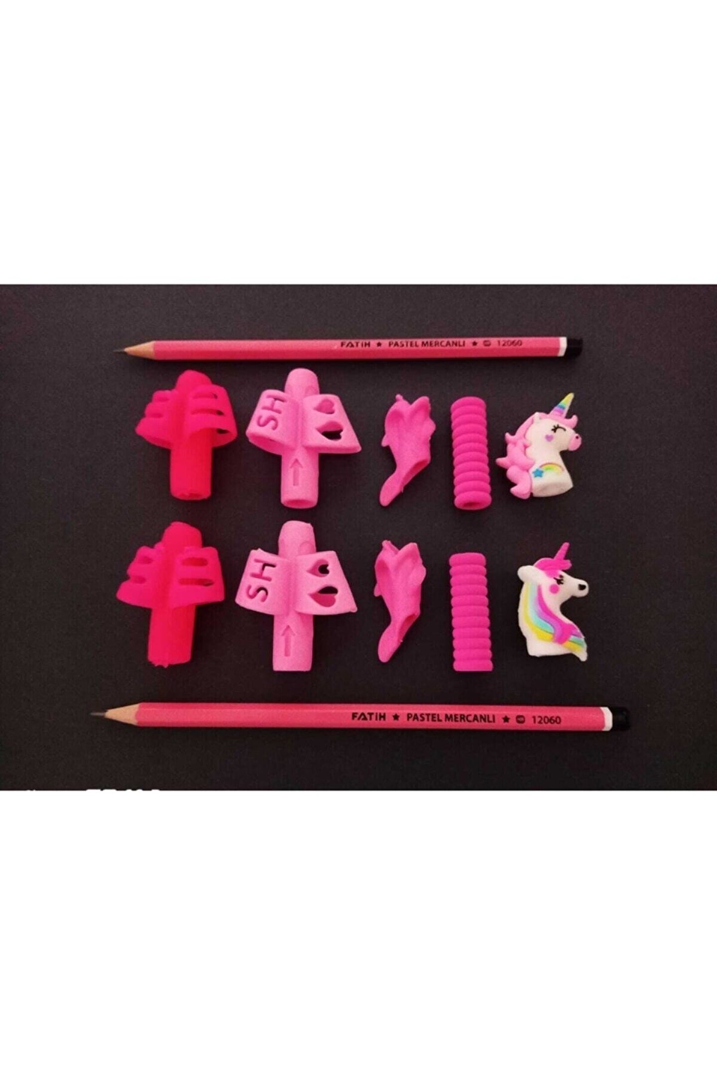 Setimiz 2 adet lateks kalem tutma aparatı 2 adet silikon kalem tutma aparatı 2 adet balık şekilli kalem tutma aparatı 2 adet sünger kalem tutma apartı 2 adet fati kurşun kalem ve 2 adet unicorn kalem başlığından oluşur