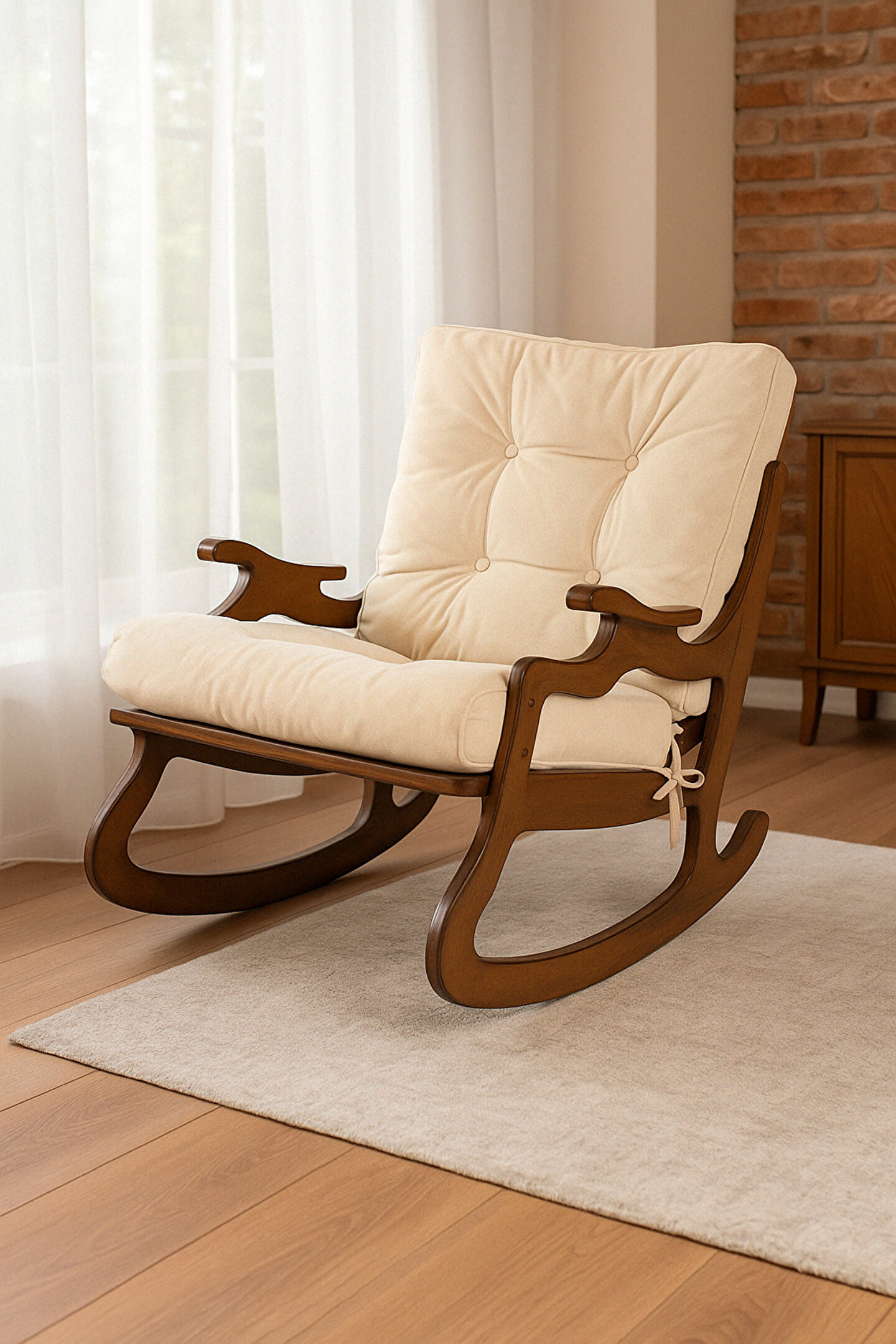 Ahşap Gövdeli Konforlu Minderli Sallanan Sandalye Krem Renk Kumaş Dinlenme Koltuğu