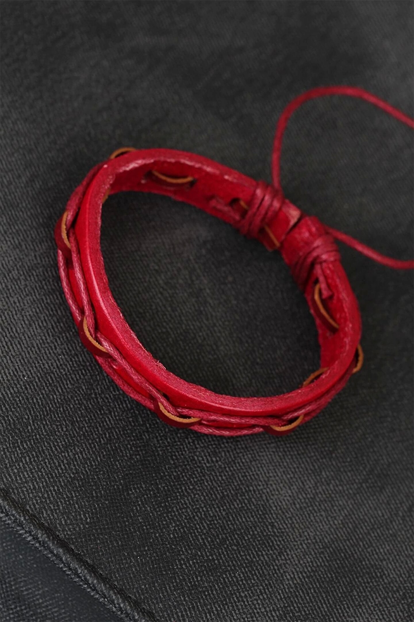 Kombinlerinizde Kırmızı Renk İpli Yeni Sezon Deri Erkek Bileklik modeline yer açın.