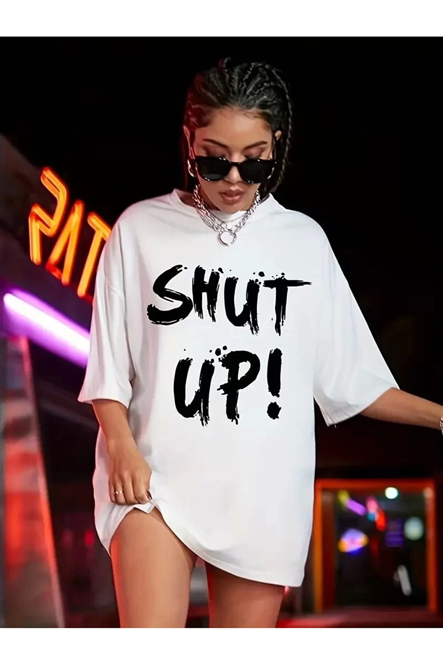 20/1 Penye Compack Oversize Beyaz Shut Up Kısa Kol Yazlık Tişört - Beyaz