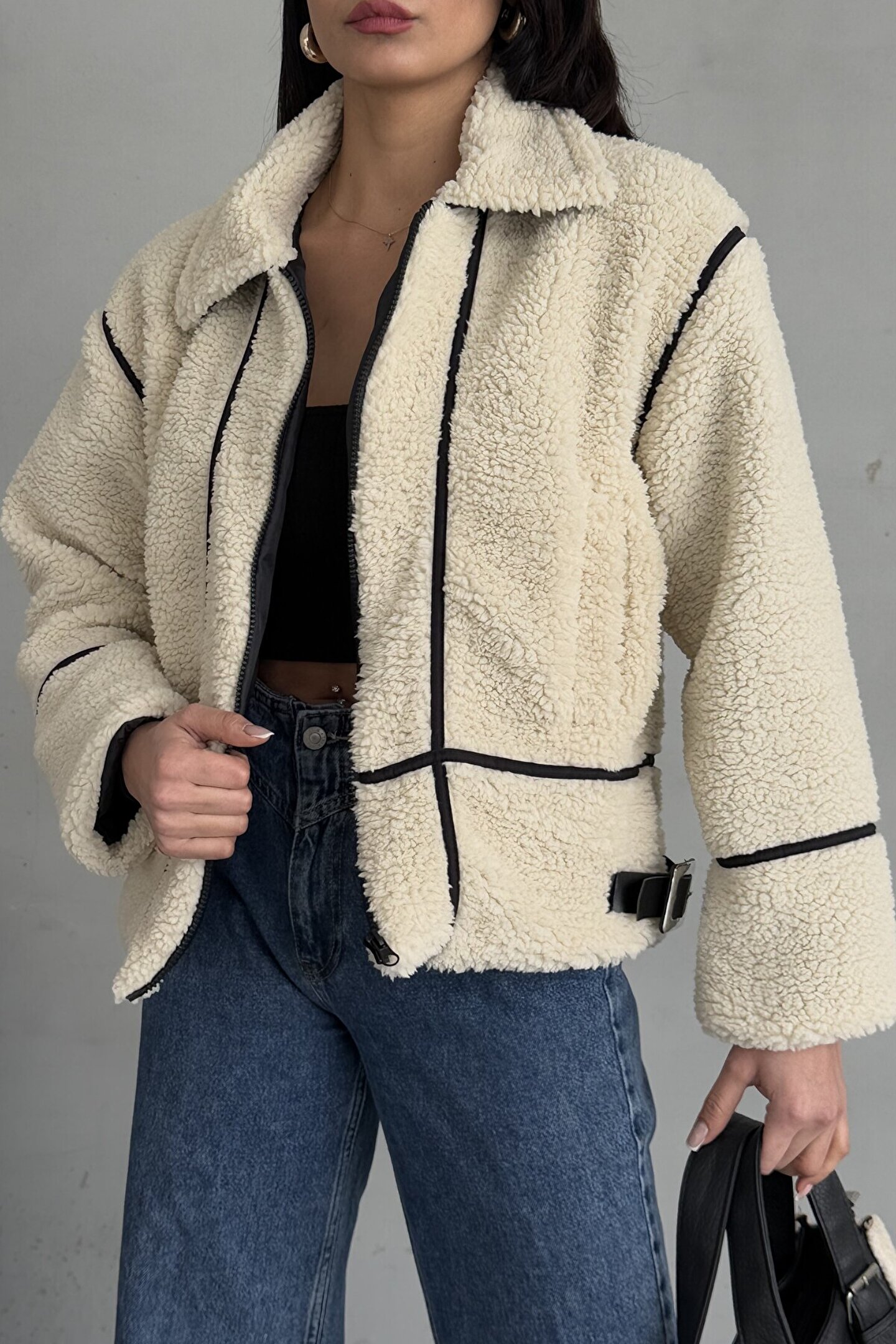 moda armanc Deri Detaylı Bej Peluş Kadın Ceket