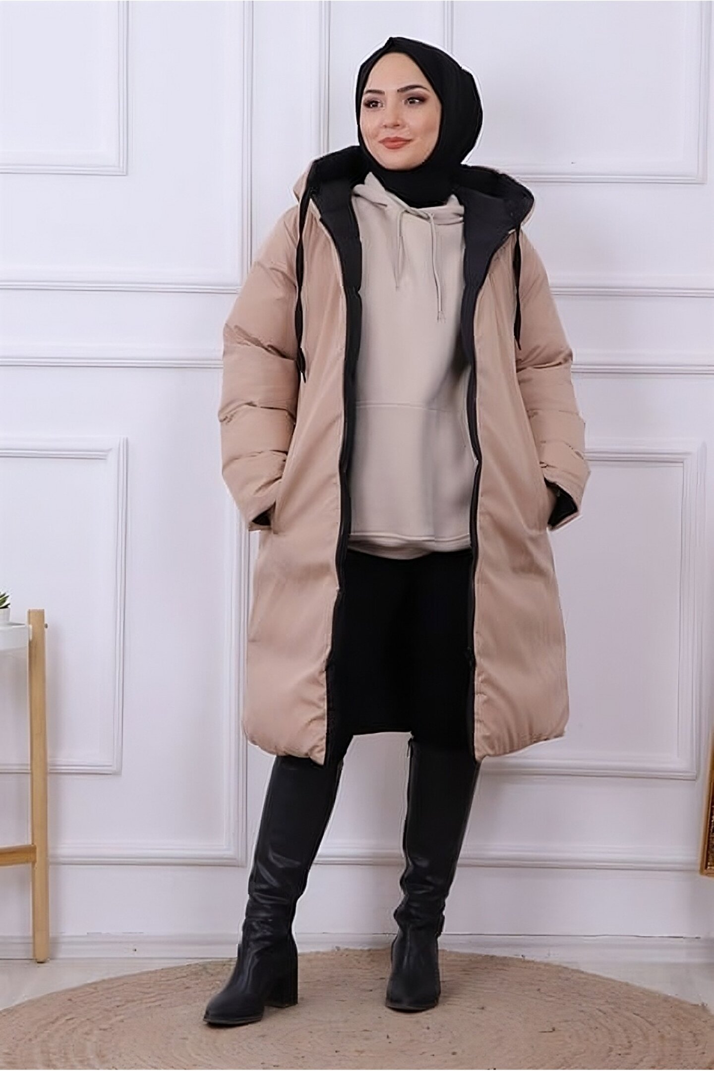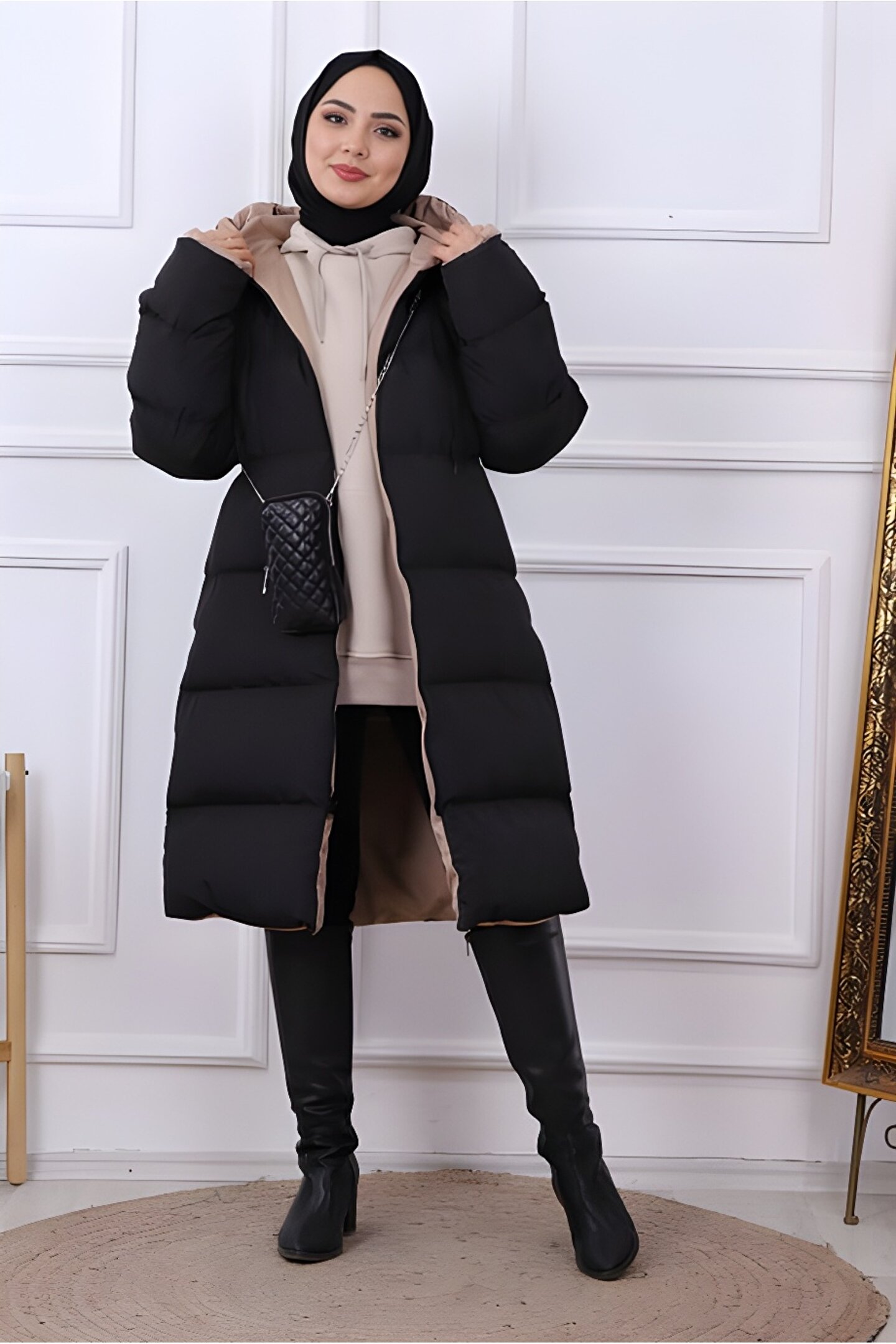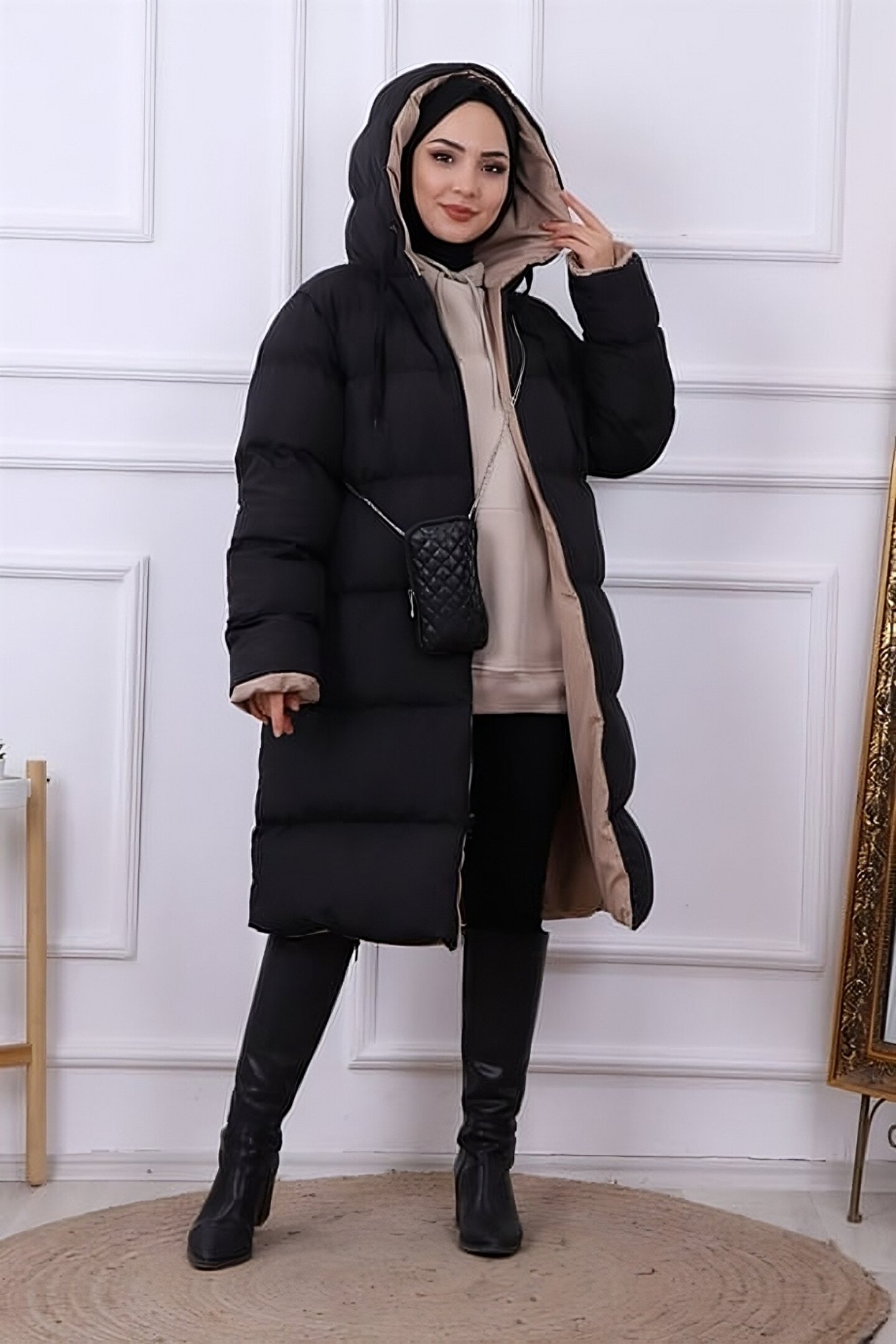 moda armanc Çift Taraflı Giyilebilir Kapüşonlu Uzun Kadın Şişme Mont – SiyahBej – Su Geçirmez Kışlık Kaban