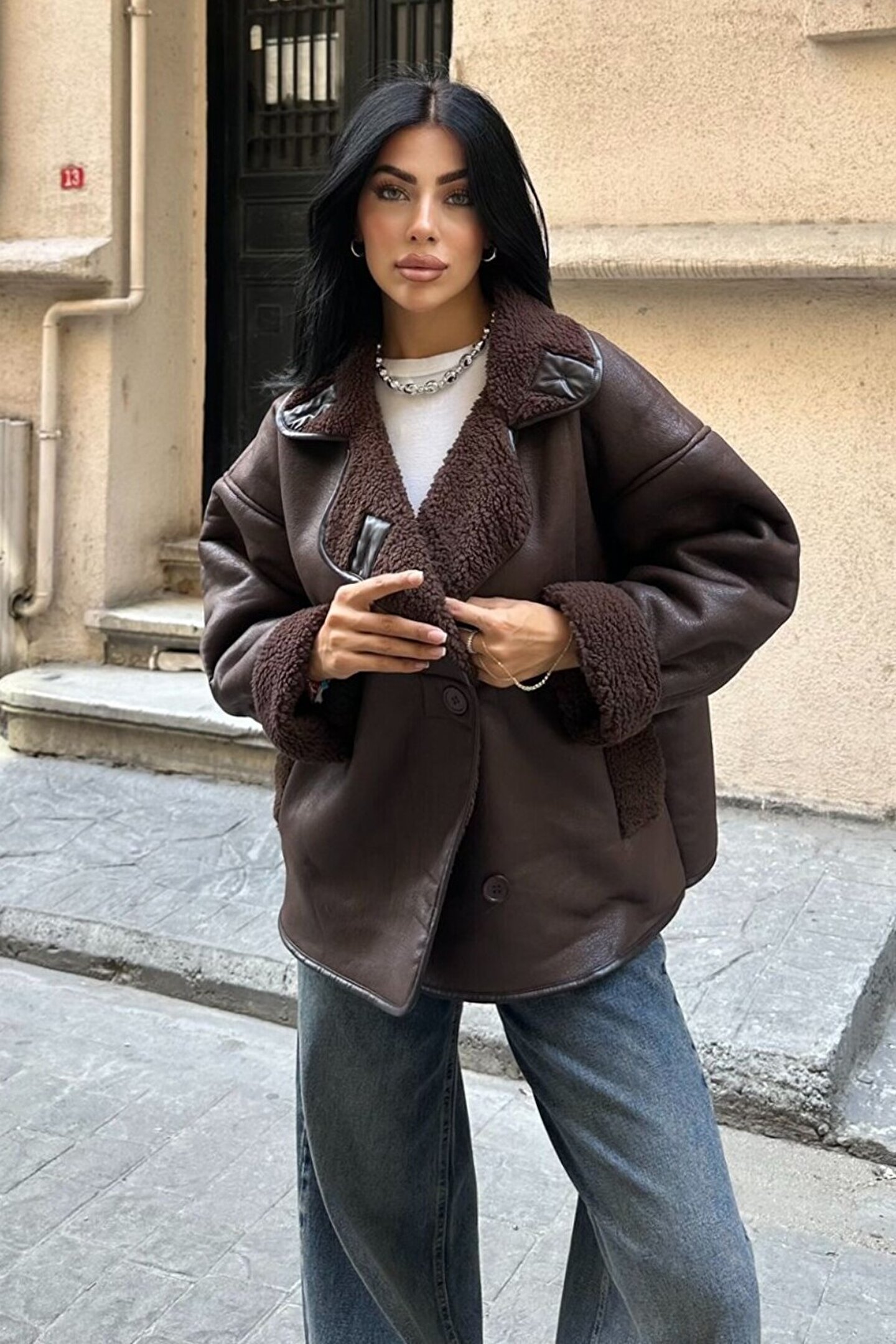 moda armanc Else Acı Kahve Dokulu Süet Içi Peluşlu Oversize Zr Model Mont