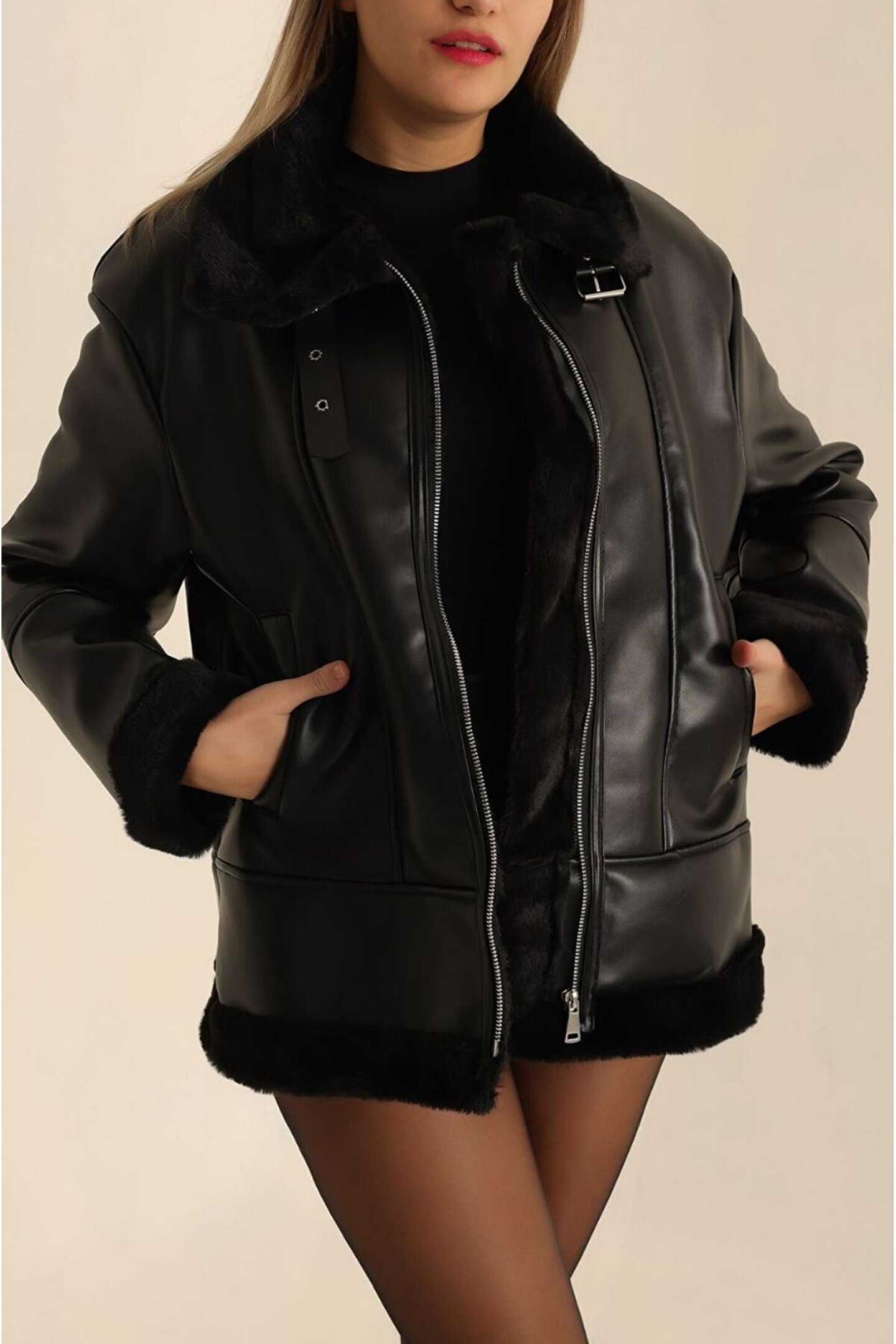 <li>Premium kalite suni deri ve ultra yumuşak peluş kürk iç astar ile üretilen bu kaban, stilini güçlendirirken mükemmel ısı yalıtımı sağlar.</li>