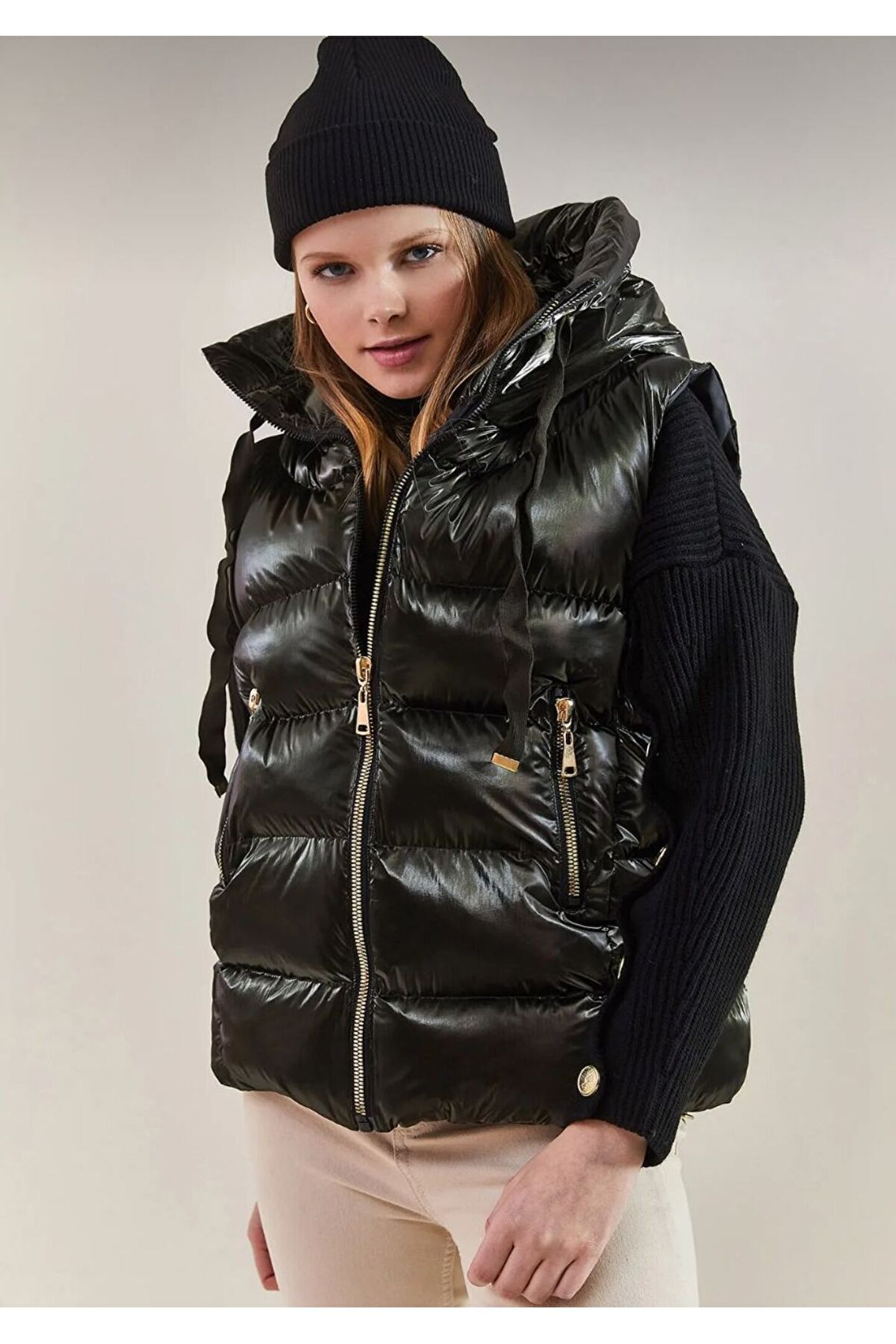-Ürün Boyu 70 cm.; - Zarif gold detaylarıyla süslenmiş siyah şişme yelek, ilkbahar ve sonbahar mevsimlerinde şıklığınızı tamamlar.; - Pratik kullanım sunan çift cepli tasarımı ile günlük eşyalarınızı yanınızda taşımanız kolaylaşır.; - Tekli paket içeriği sayesinde ihtiyacınıza göre rahatça tercih edebilirsiniz.; - Astarlı yapısı ile konforlu bir kullanım sağlarken, yoğun elyaf dolgusu soğuk havalarda ekstra sıcaklık sunar.; - Elyaflı dolgu tekniği, dayanıklılığı artırarak uzun süreli kullanım imkanı tanır.; - %90 polyester ve %10 likra karışımından oluşan materyal bileşeni esneklik kazandırırken formunu korur.; - Sürdürülebilirlik detayının bulunmamasına rağmen, genç koleksiyonuna ait tasarım anlayışını yansıtır.; - Kemersiz yapısıyla modern ve minimalist bir görünüm sergilerken, fermuarlı kapama şekli pratik kullanım vaat eder.; - Type 2 yıkama talimatına uygun şekilde temizlenmesi önerilir; böylece ürününüz daha uzun ömürlü olur.; - Astarlı olması sayesinde rüzgar geçirmez özelliğiyle kötü hava koşullarında bile koruma sağlar.; - Micro dokuma tipi hafifliğiyle hareket özgürlüğünüzü kısıtlamaz; orta kalınlığındaki siluetiyle ideal bir denge sunar.; - Relaxed kalıp ile rahat bir oturuşa sahip olan bu yelek, her vücut tipine uyum sağlar.; - Türkiye menşeli olmasıyla yerel üretim avantajlarından faydalanabilirsiniz.; - Dokuma kumaş tipi dayanıklılığı arttırarak ürünün estetik duruşunu korur.; - Genç yaş grubuna hitap eden dinamik tarzıyla dikkat çeker; gündüzden geceye her ortama uyum sağlar.; - Standart kol boyu ve renk bloklu deseniyle trendleri takip eden stil sahibi görünmenizi sağlar.; - Kolsuz tasarım sayesinde serin günlerde de rahatça giyilebilir; fermuarlı kapama mevcuttur.;