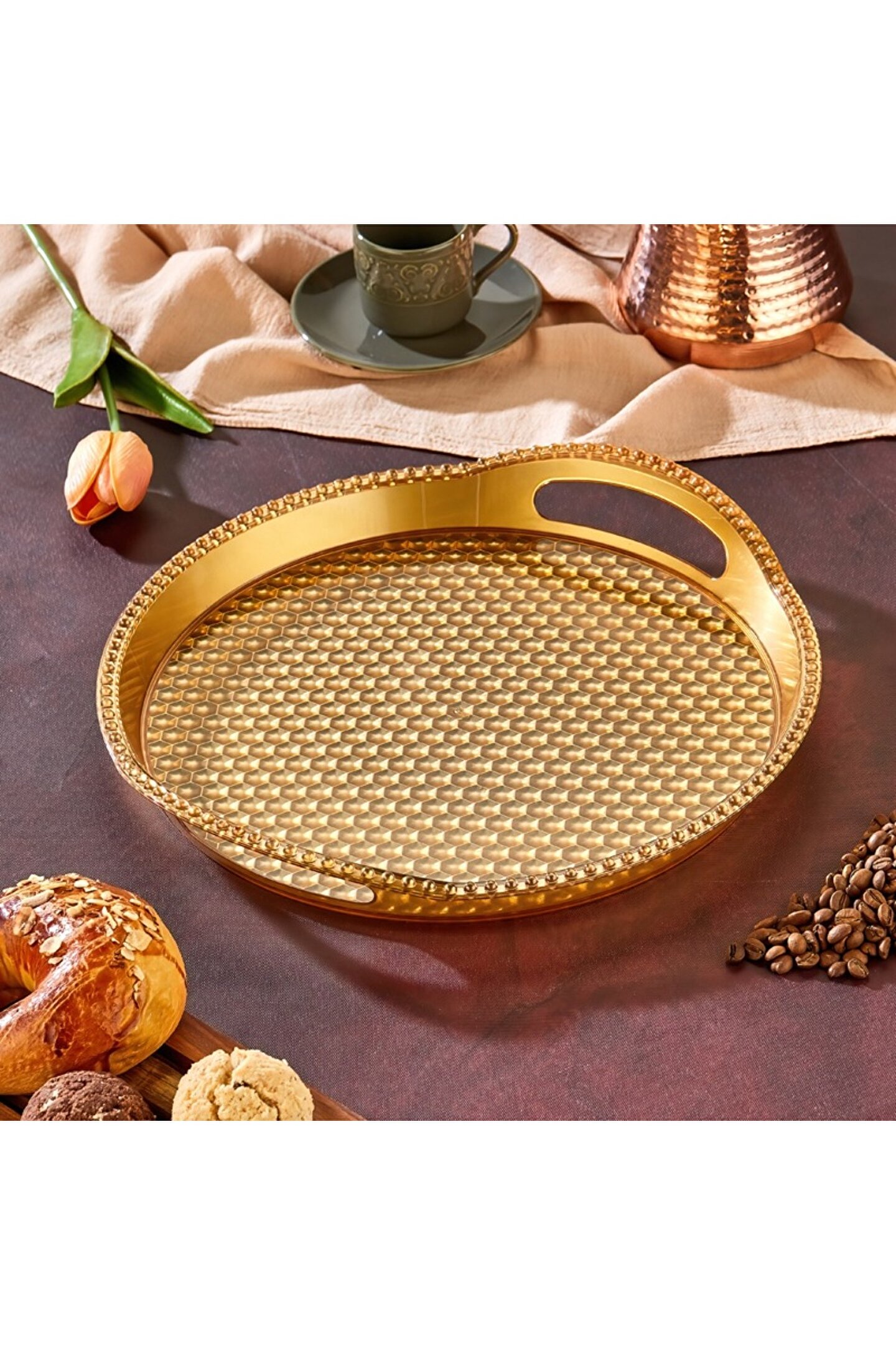 moda armanc Gold Petek Desenli Kulplu Yuvarlak Sunum Tepsisi