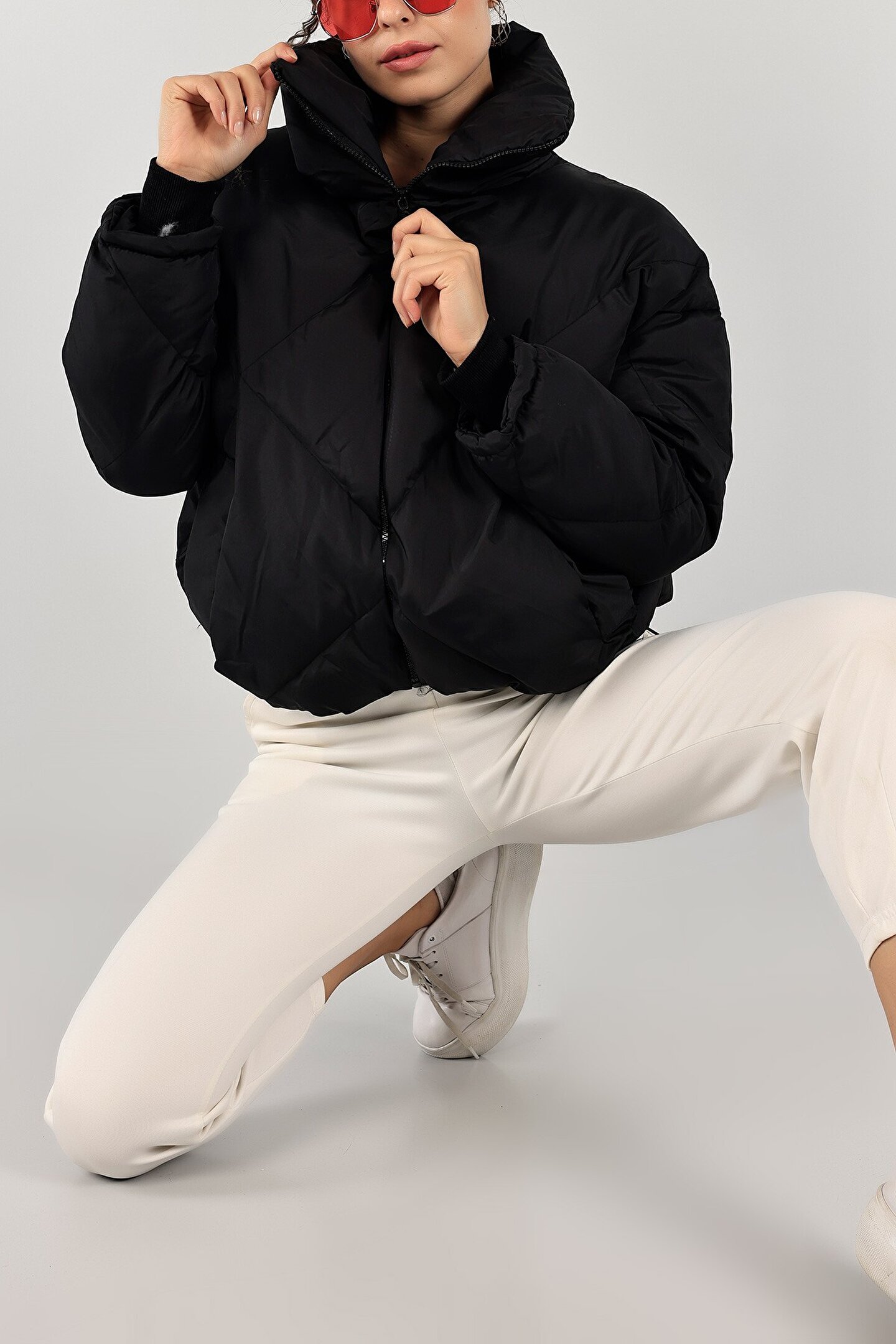 <li> Kadın Siyah Kısa Şişme Mont – Oversize, Yüksek Yaka, Ultra Sıcak!<br> </li>