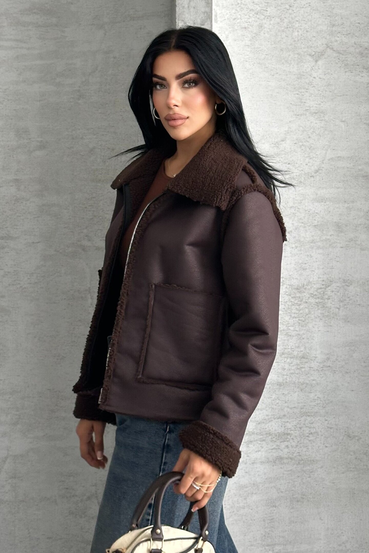 moda armanc Kadın Çift Cepli İçi Suni Kürklü Suni Deri Biker Mont