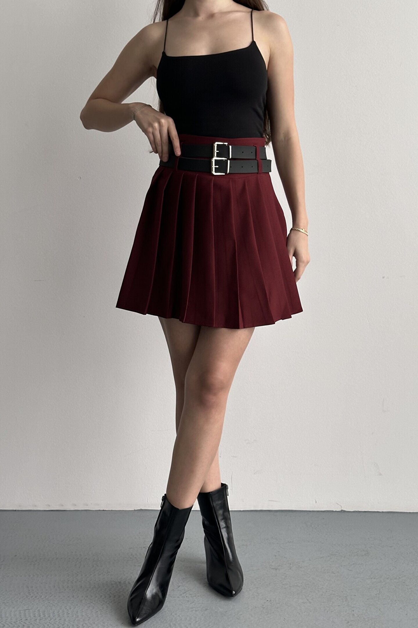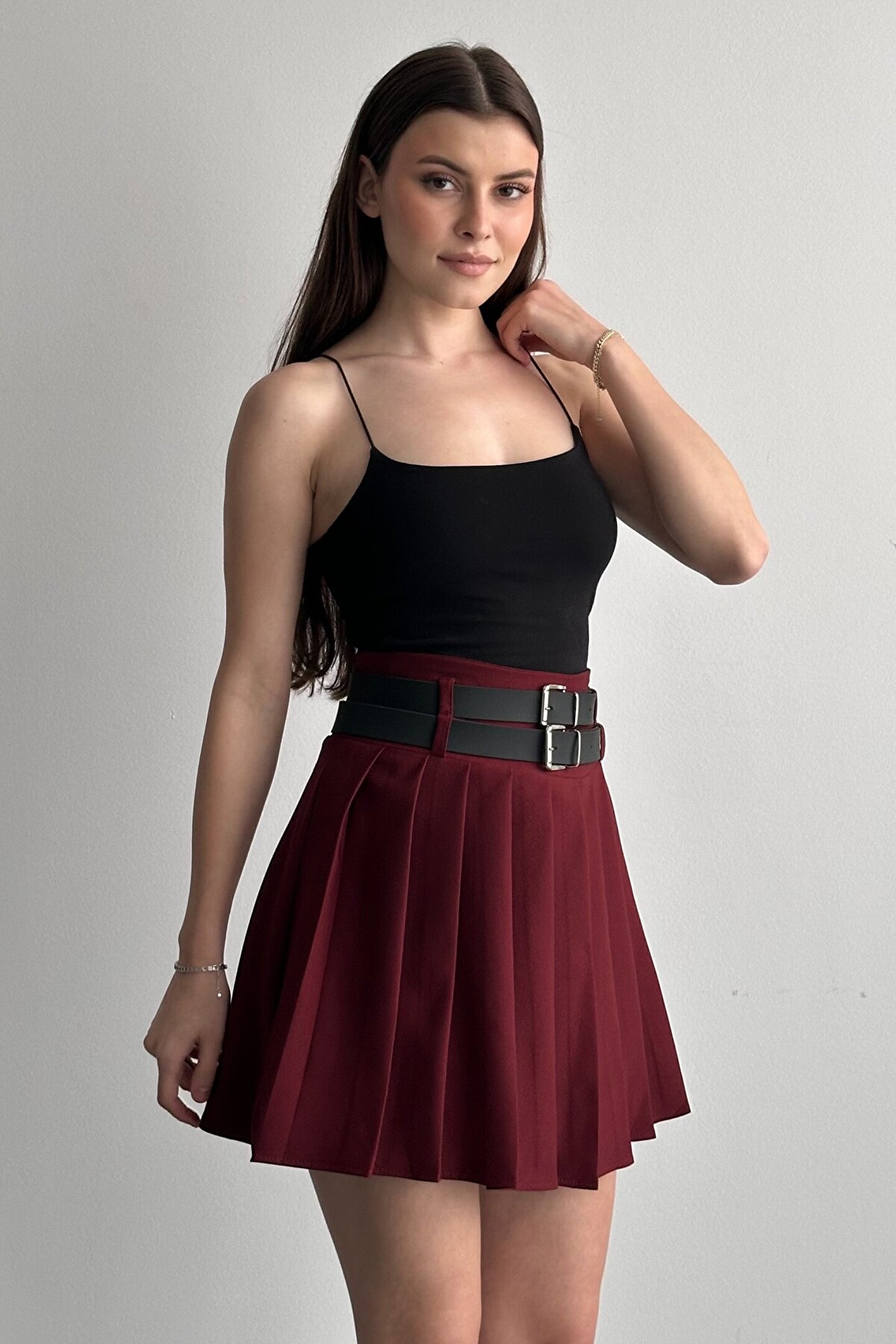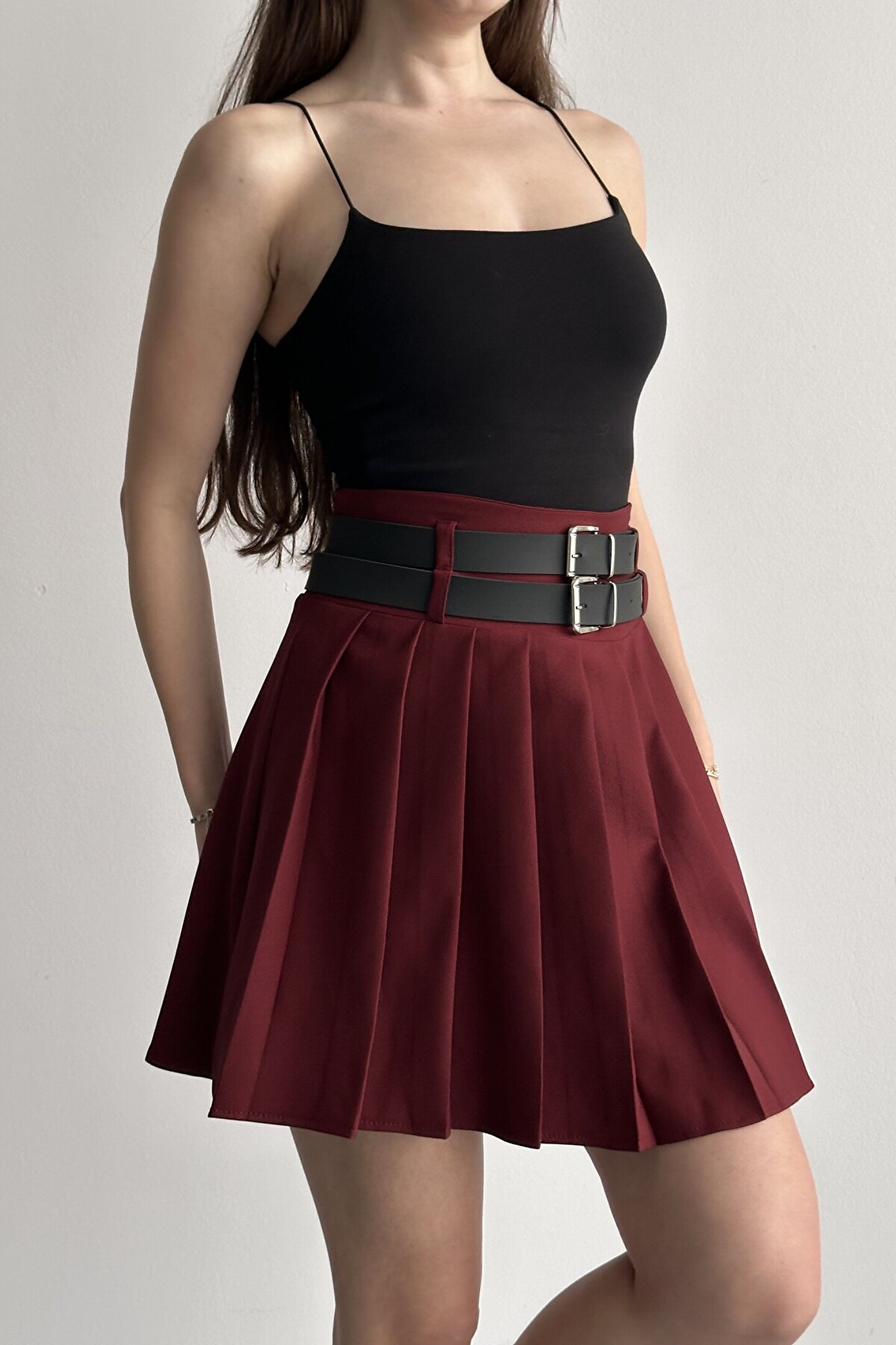 Çift kemer detayıyla öne çıkan yüksek bel pileli mini etek, günlük kombinlerin vazgeçilmez tamamlayıcı parçasıdır.; ; Modern ve güçlü stilin en iddialı parçalarından biri olan çift kemer detaylı pileli mini etek, günlük kombinlerden şehir stiline kadar birçok kullanım alanı sunar.; ; Yüksek bel tasarımı vücut formunu dengelerken pileli yapısı hareketli ve zarif bir görünüm kazandırır.; ; Bel kısmında yer alan çift kemer detayı ürüne karakter kazandırırken, kombinlerin odak noktası olmasını sağlar.; ; Günlük kullanımda basic tişört, crop, gömlek ve blazer ceketlerle rahatlıkla tamamlanabilir.; ; Akıcı formu sayesinde yürüyüş sırasında doğal hareket sağlar ve gün boyu konforlu kullanım sunar.; ; Hem spor hem şık kombinlere uyum sağlayabilen zamansız bir tasarımdır.; ; Yüksek bel form ; Çift kemer detay tasarım ; Pileli mini etek kesimi ; Günlük ve şehir stiline uygun ; Kombin tamamlayıcı modern görünüm ; Gardırobun kurtarıcı parçalarından biri olacak bu model, stiline güçlü ve dikkat çekici bir dokunuş katmak isteyen kadınlar için tasarlanmıştır.; ; Manken Ölçüleri: Boy:1.70cm Kilo:58kg (Üzerindeki ürün S bedendir);