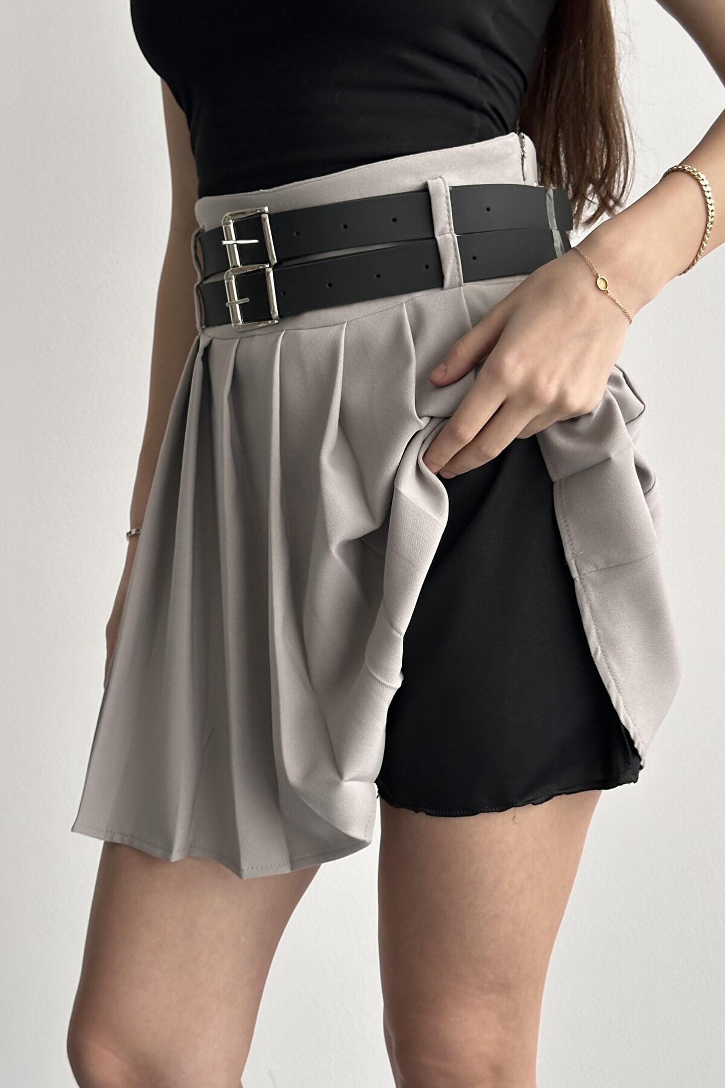 Çift kemer detayıyla öne çıkan yüksek bel pileli mini etek, günlük kombinlerin vazgeçilmez tamamlayıcı parçasıdır.; ; Modern ve güçlü stilin en iddialı parçalarından biri olan çift kemer detaylı pileli mini etek, günlük kombinlerden şehir stiline kadar birçok kullanım alanı sunar.; ; Yüksek bel tasarımı vücut formunu dengelerken pileli yapısı hareketli ve zarif bir görünüm kazandırır.; ; Bel kısmında yer alan çift kemer detayı ürüne karakter kazandırırken, kombinlerin odak noktası olmasını sağlar.; ; Günlük kullanımda basic tişört, crop, gömlek ve blazer ceketlerle rahatlıkla tamamlanabilir.; ; Akıcı formu sayesinde yürüyüş sırasında doğal hareket sağlar ve gün boyu konforlu kullanım sunar.; ; Hem spor hem şık kombinlere uyum sağlayabilen zamansız bir tasarımdır.; ; Yüksek bel form ; Çift kemer detay tasarım ; Pileli mini etek kesimi ; Günlük ve şehir stiline uygun ; Kombin tamamlayıcı modern görünüm ; Gardırobun kurtarıcı parçalarından biri olacak bu model, stiline güçlü ve dikkat çekici bir dokunuş katmak isteyen kadınlar için tasarlanmıştır.; ; Manken Ölçüleri: Boy:1.70cm Kilo:58kg (Üzerindeki ürün S bedendir);