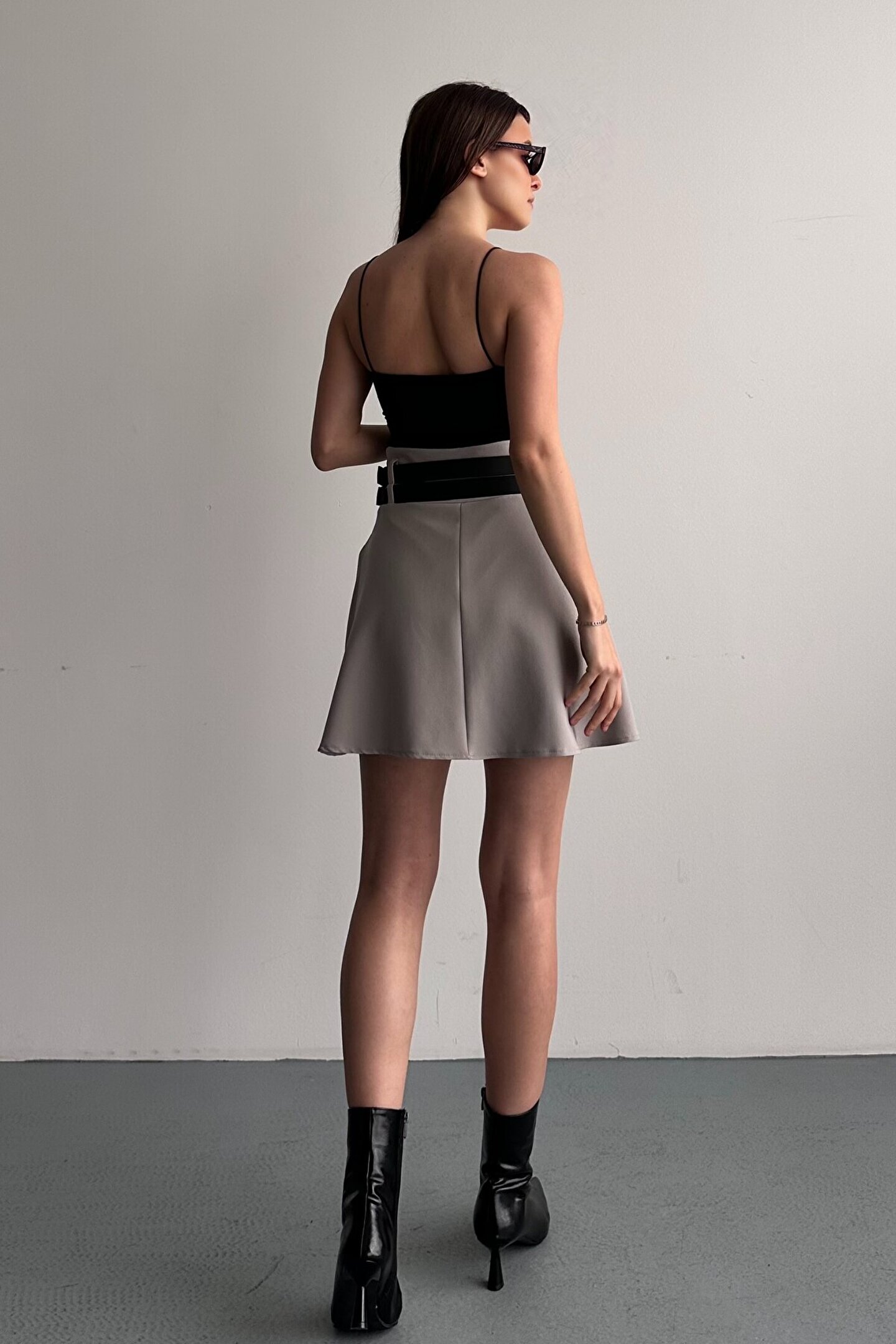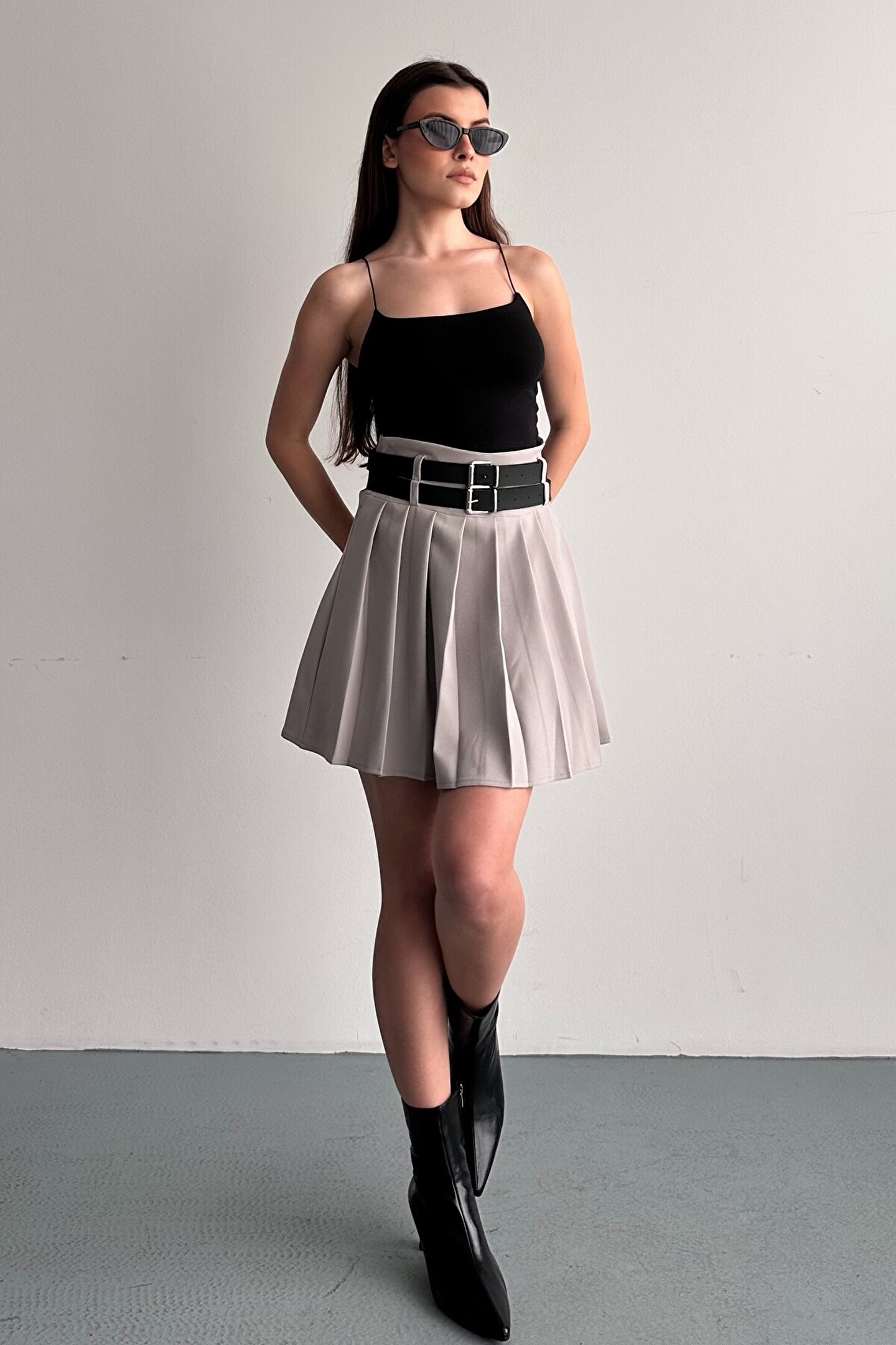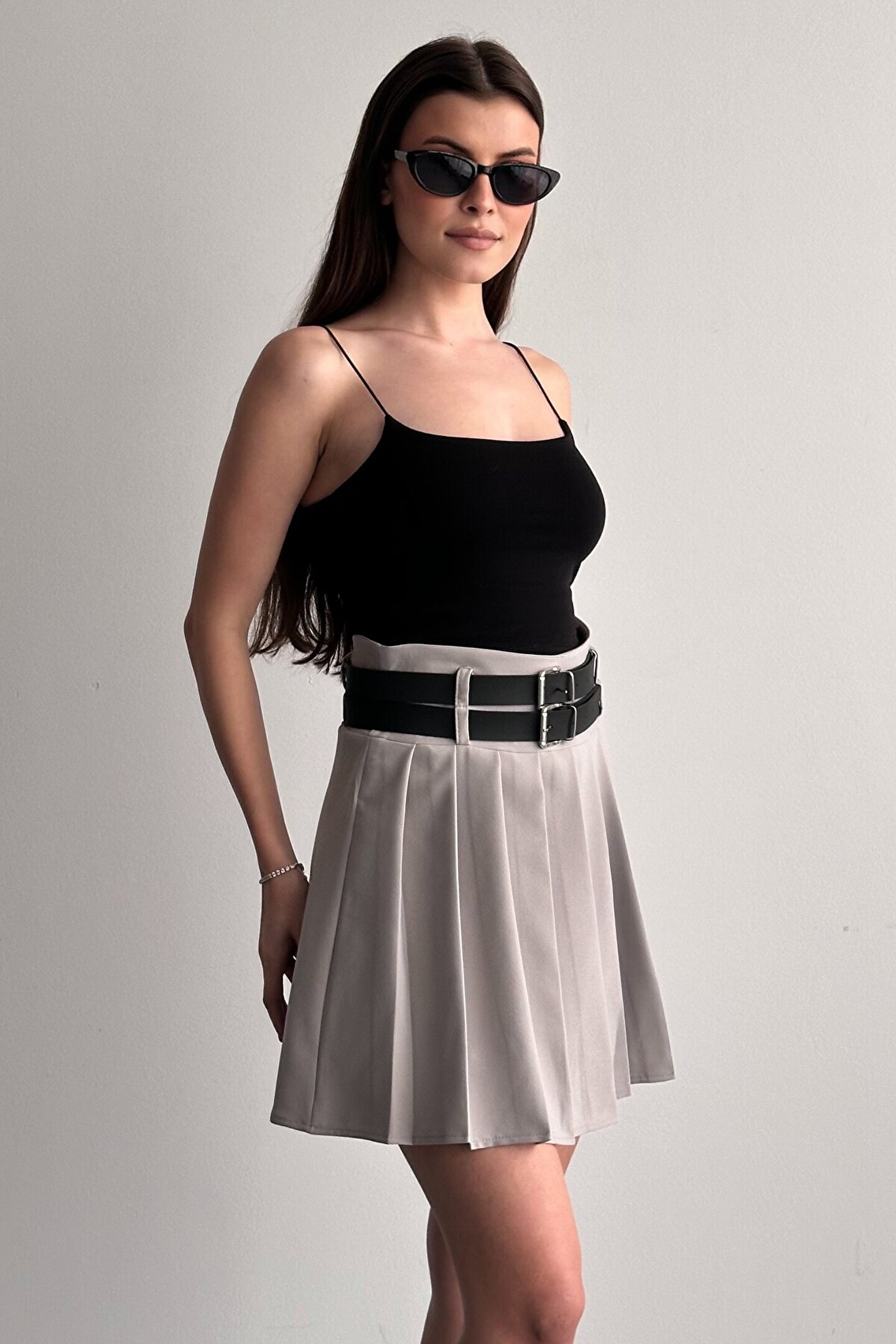 Çift kemer detayıyla öne çıkan yüksek bel pileli mini etek, günlük kombinlerin vazgeçilmez tamamlayıcı parçasıdır.; ; Modern ve güçlü stilin en iddialı parçalarından biri olan çift kemer detaylı pileli mini etek, günlük kombinlerden şehir stiline kadar birçok kullanım alanı sunar.; ; Yüksek bel tasarımı vücut formunu dengelerken pileli yapısı hareketli ve zarif bir görünüm kazandırır.; ; Bel kısmında yer alan çift kemer detayı ürüne karakter kazandırırken, kombinlerin odak noktası olmasını sağlar.; ; Günlük kullanımda basic tişört, crop, gömlek ve blazer ceketlerle rahatlıkla tamamlanabilir.; ; Akıcı formu sayesinde yürüyüş sırasında doğal hareket sağlar ve gün boyu konforlu kullanım sunar.; ; Hem spor hem şık kombinlere uyum sağlayabilen zamansız bir tasarımdır.; ; Yüksek bel form ; Çift kemer detay tasarım ; Pileli mini etek kesimi ; Günlük ve şehir stiline uygun ; Kombin tamamlayıcı modern görünüm ; Gardırobun kurtarıcı parçalarından biri olacak bu model, stiline güçlü ve dikkat çekici bir dokunuş katmak isteyen kadınlar için tasarlanmıştır.; ; Manken Ölçüleri: Boy:1.70cm Kilo:58kg (Üzerindeki ürün S bedendir);